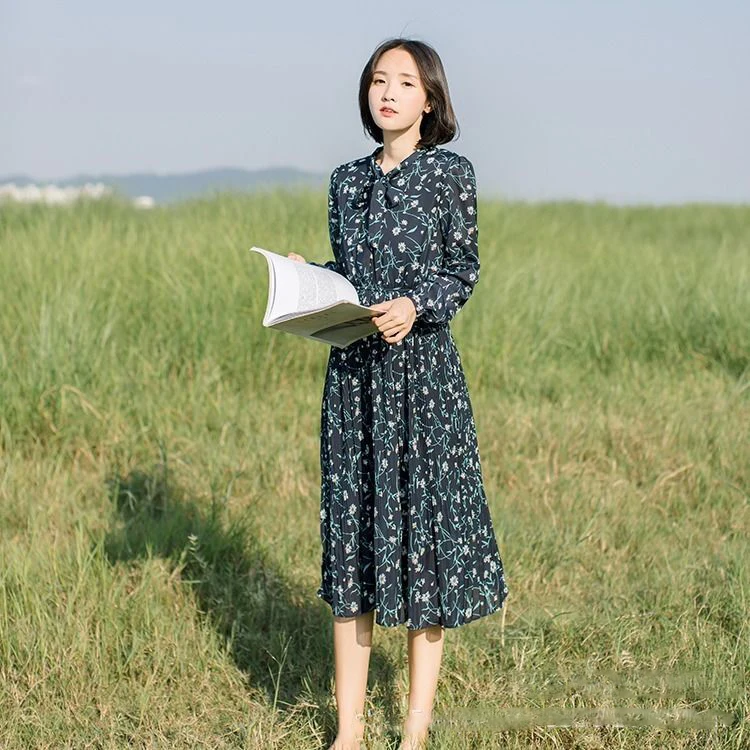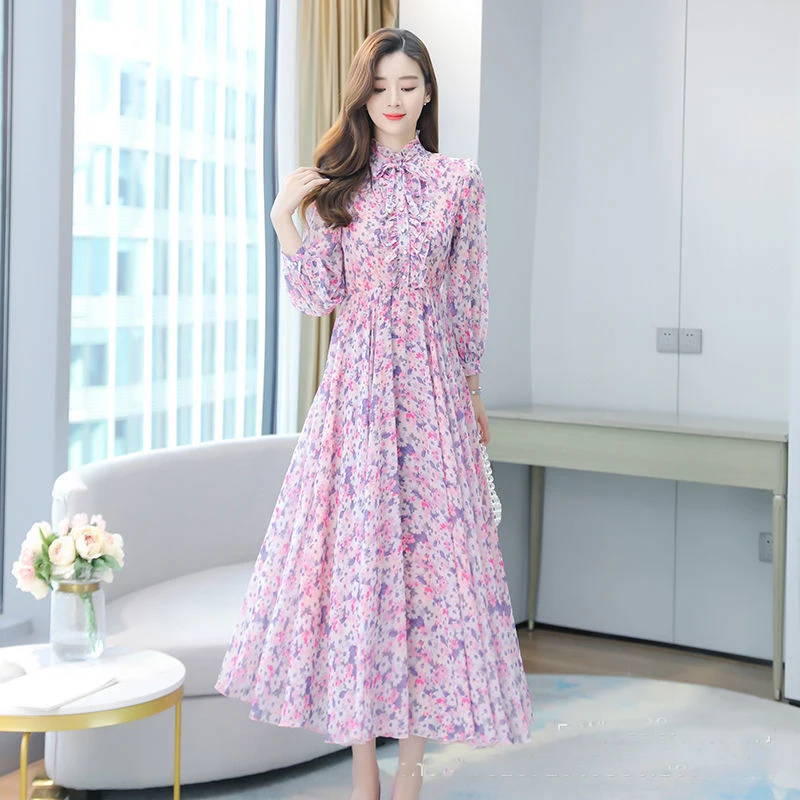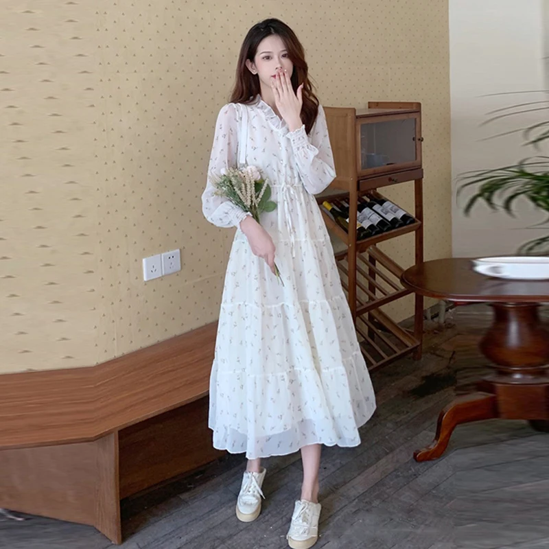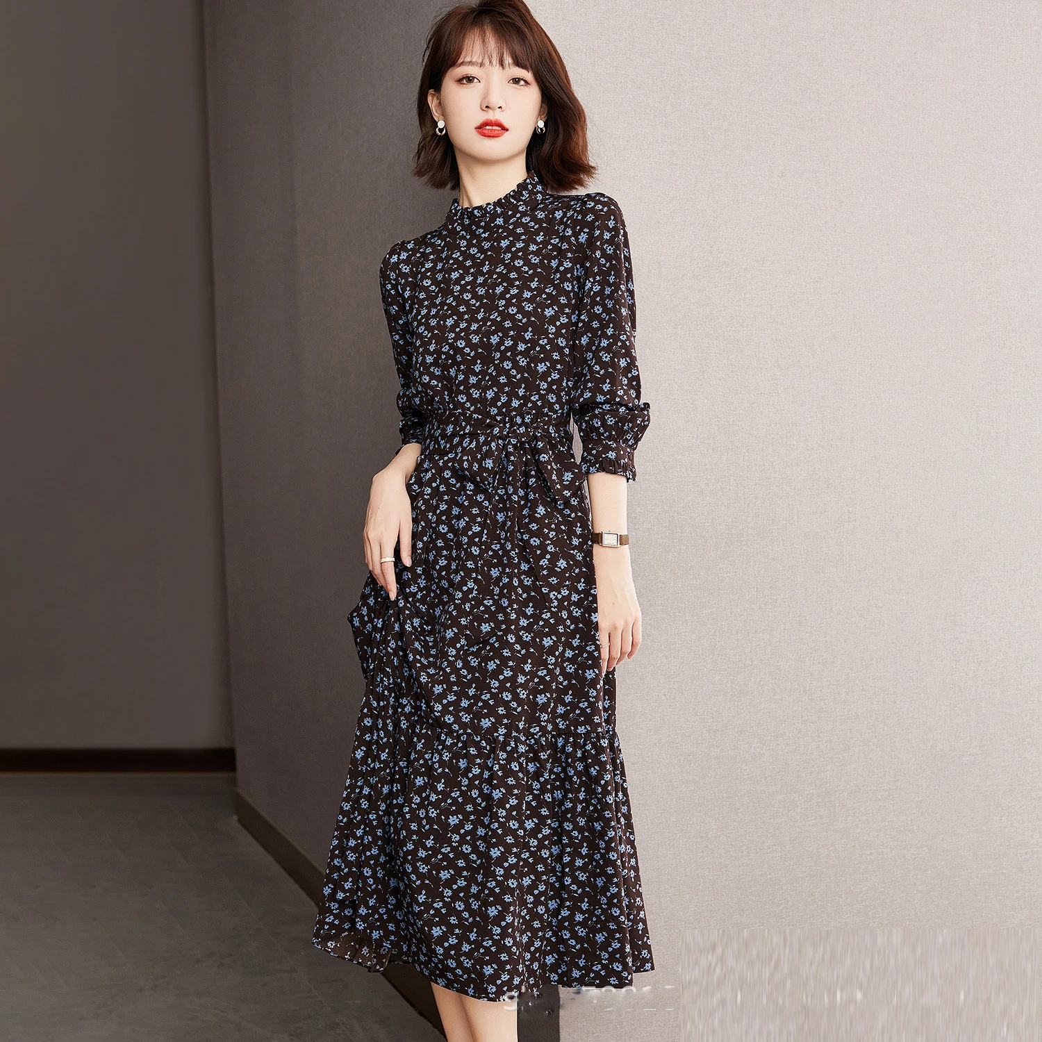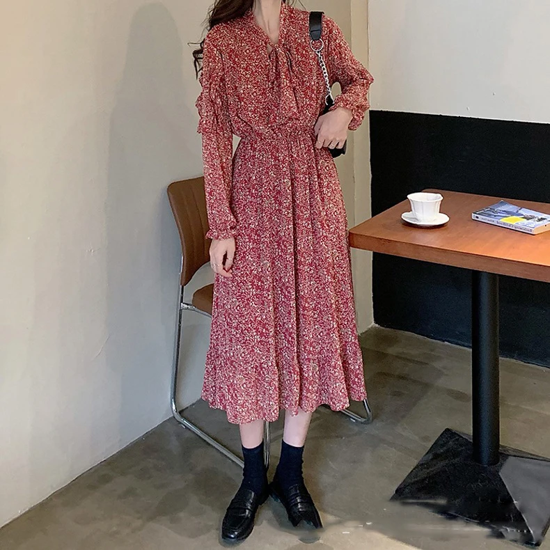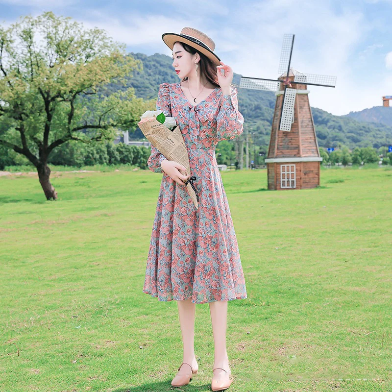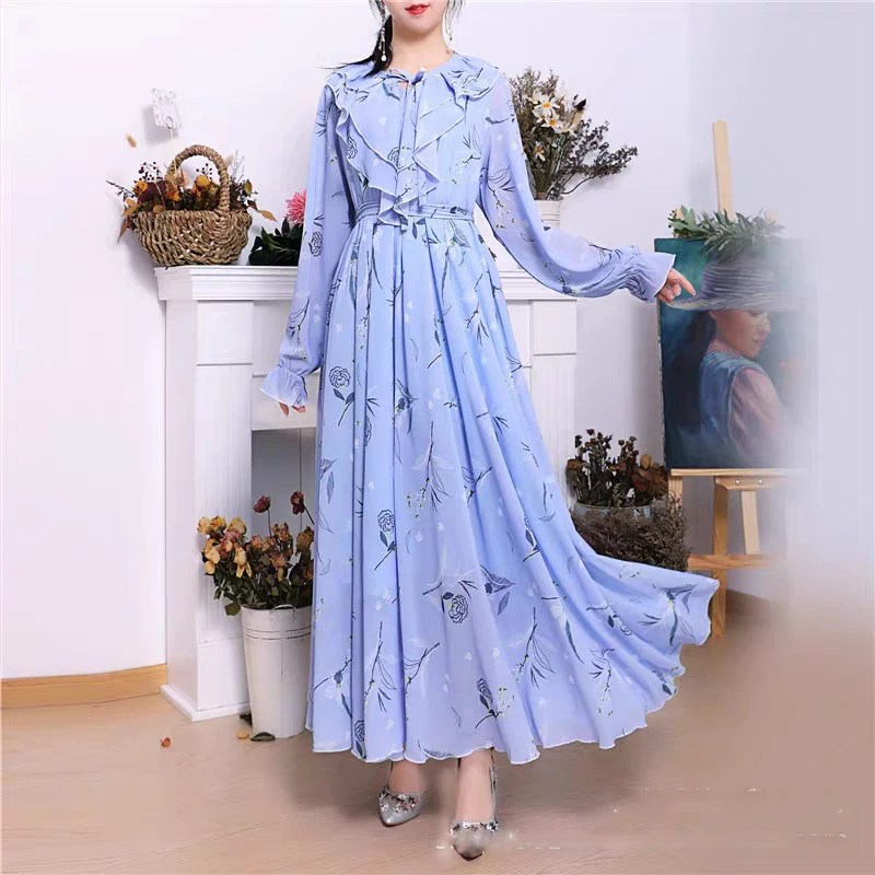 Retro Women Printing Boho Beach Dress Spring Autumn Fashion Long Sleeve Ruffled A-line Party Dress Elegant Ladies Midi Vestidos