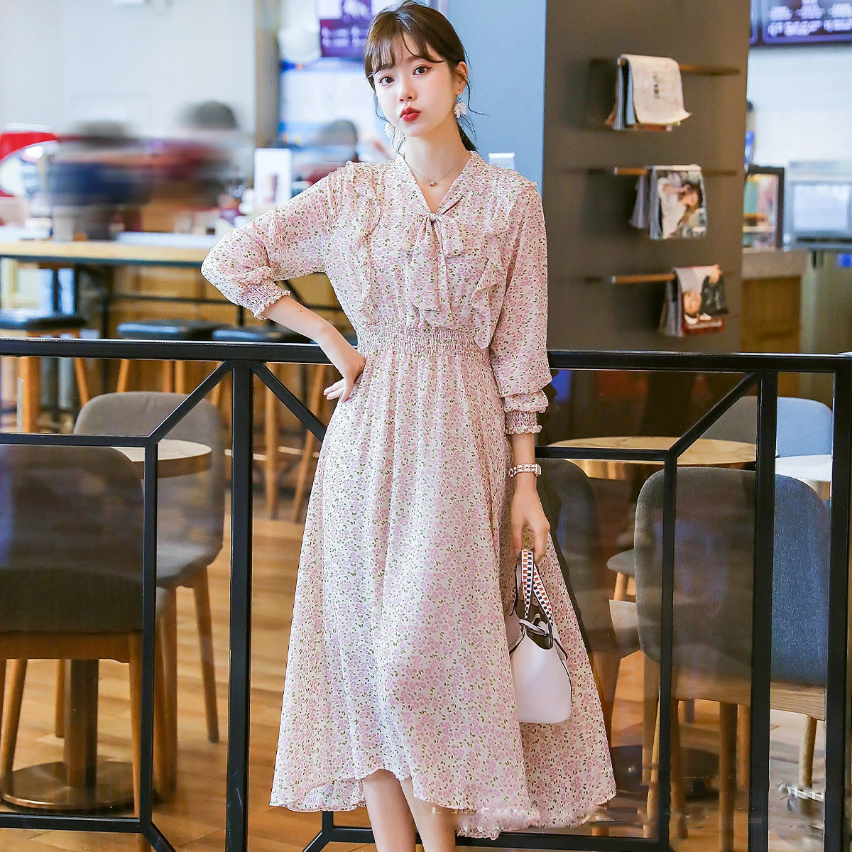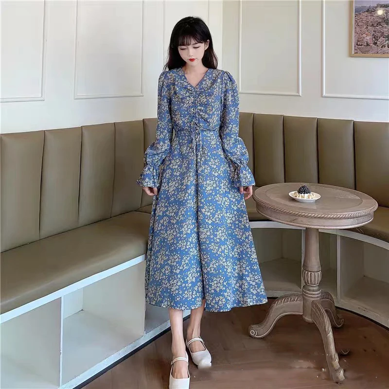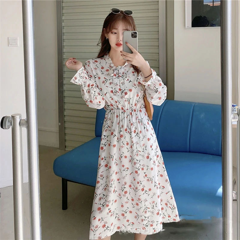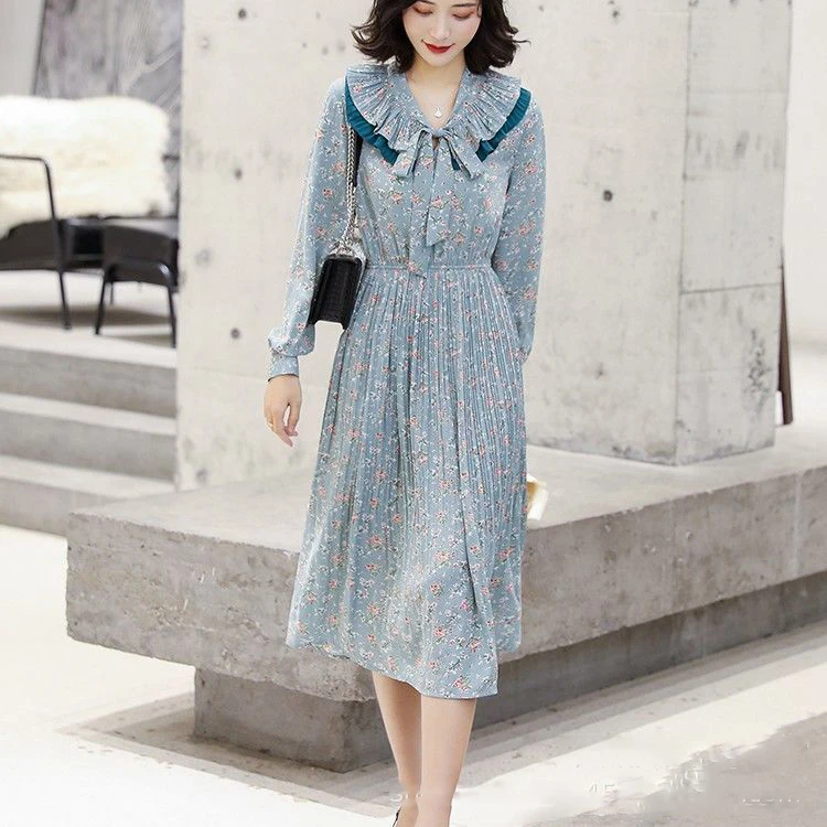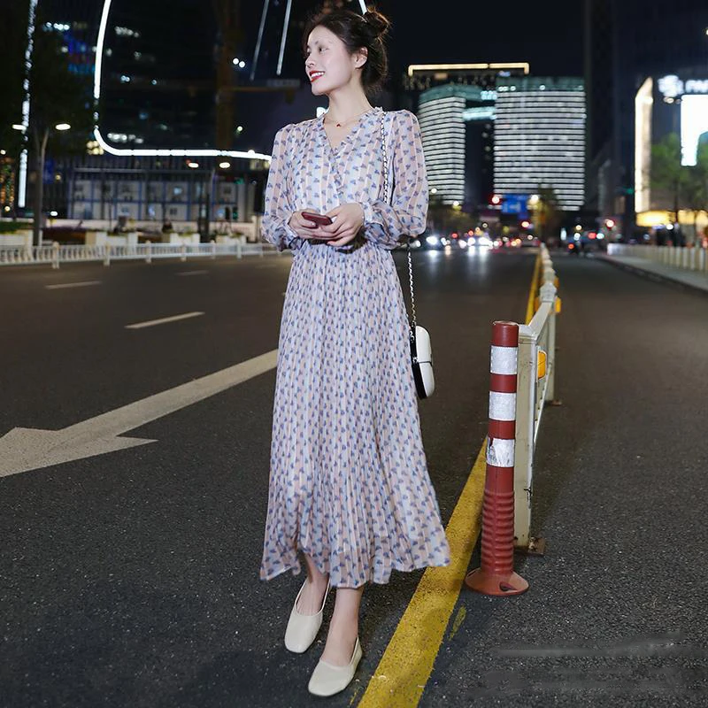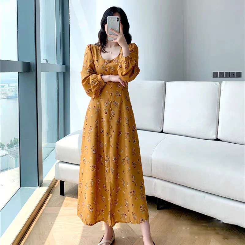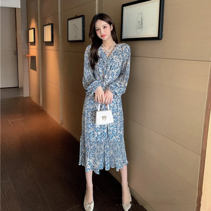 Retro Women Printing Boho Beach Dress Spring Autumn Fashion Long Sleeve Ruffled A-line Party Dress Elegant Ladies Midi Vestidos