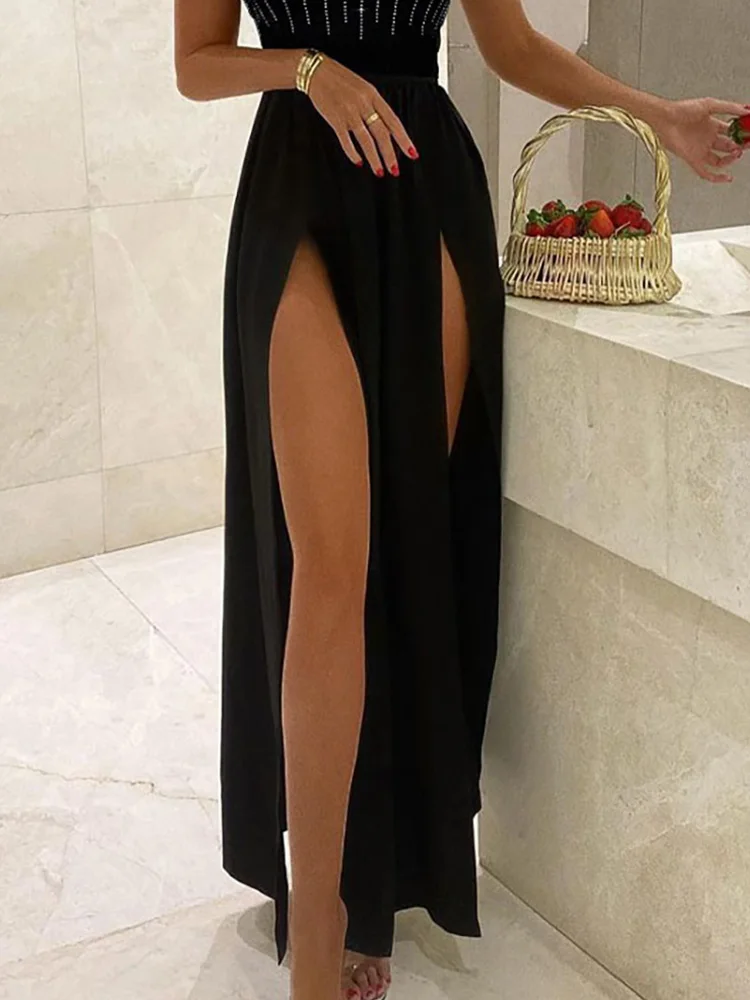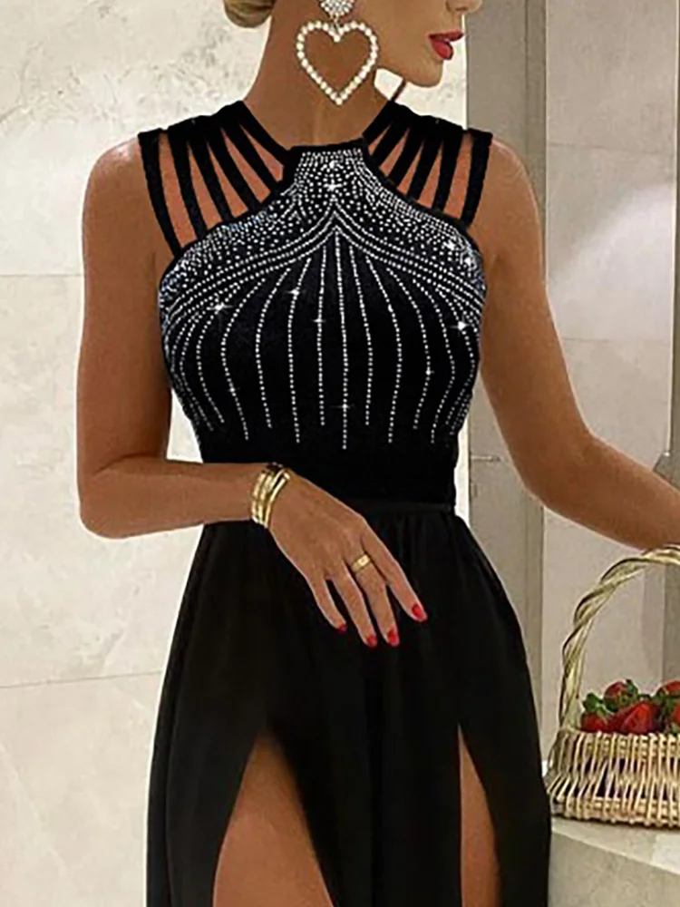 Rhinestone Cutout Sexy High Slit Party Dress Women Sleeveless Night Out Maxi Dress