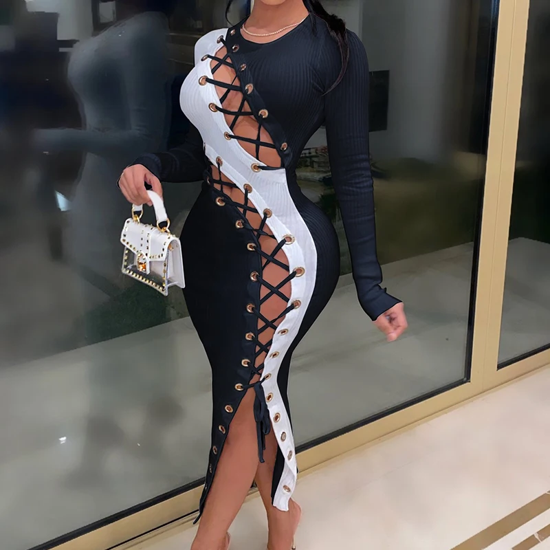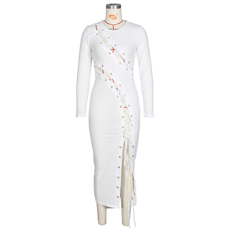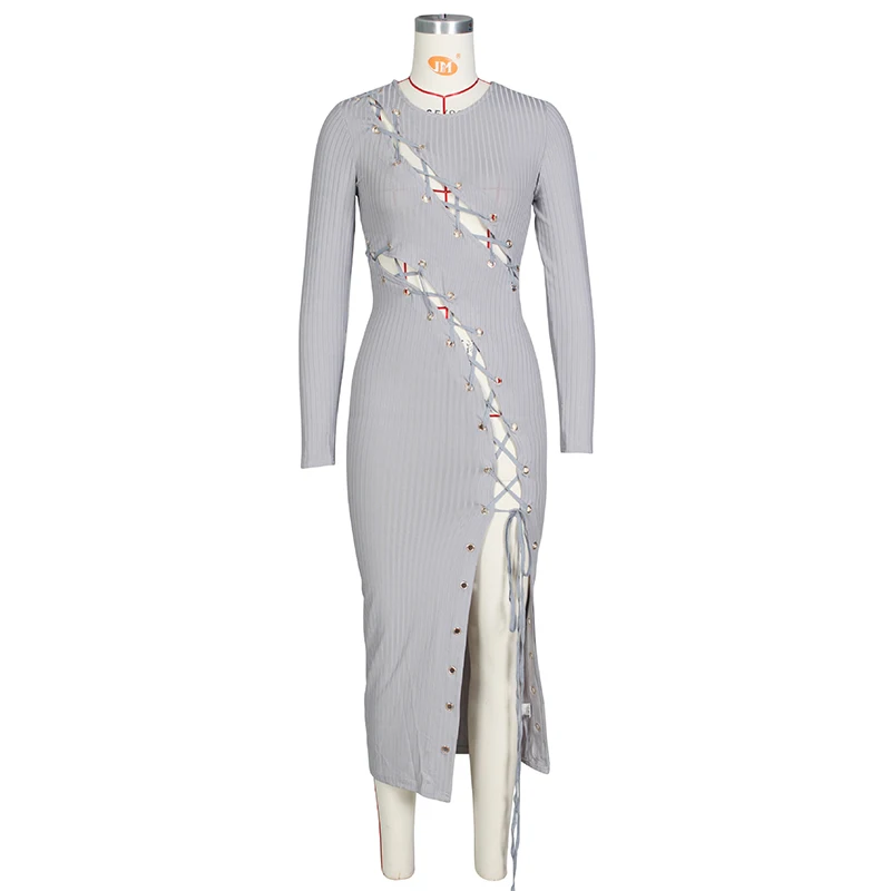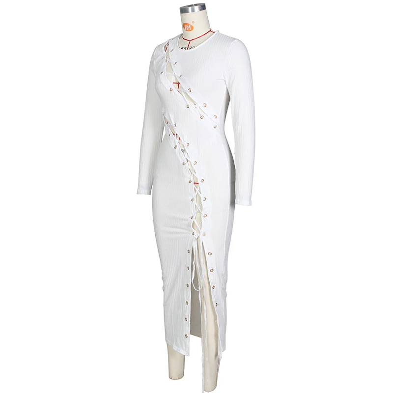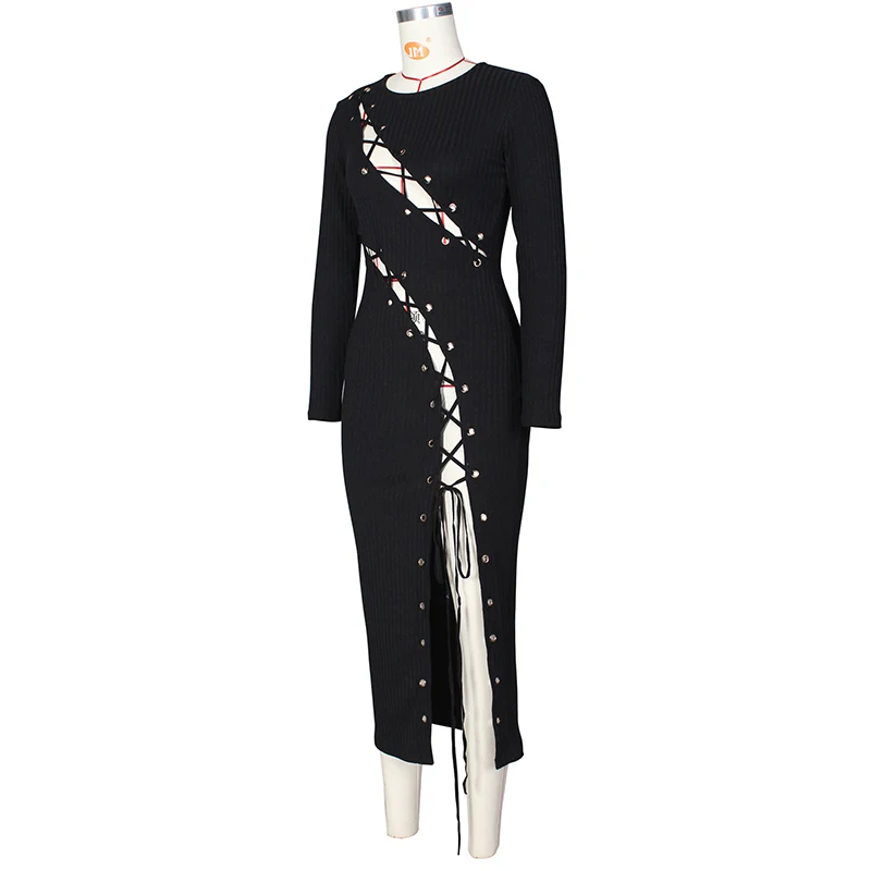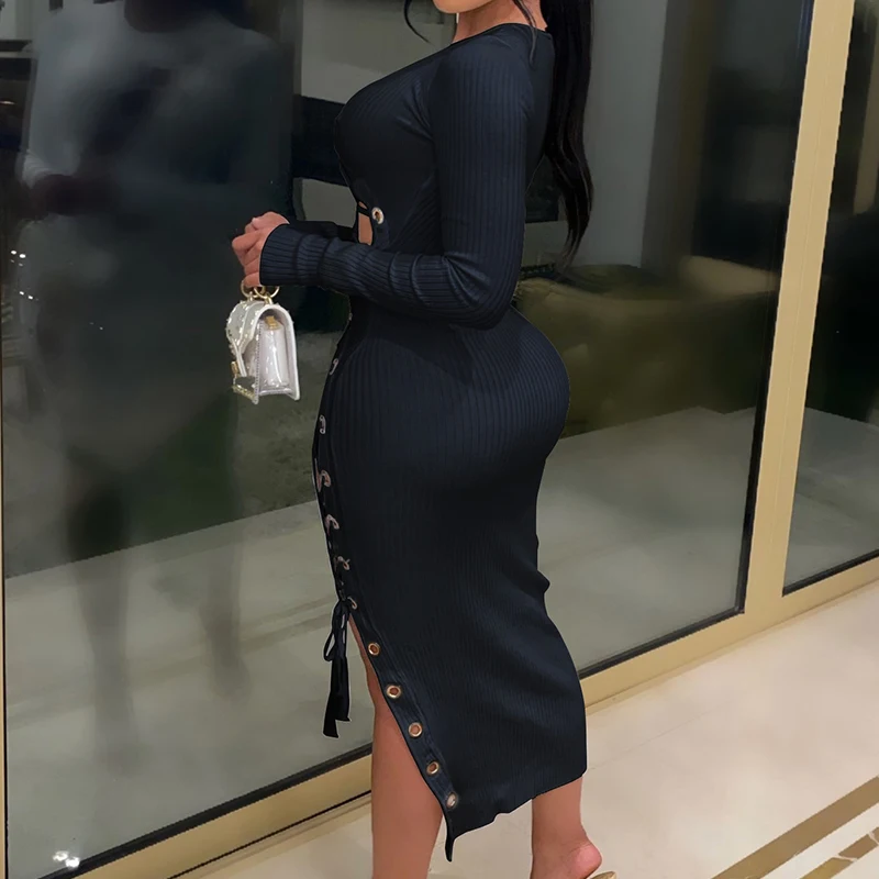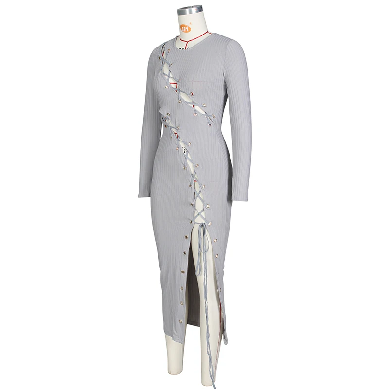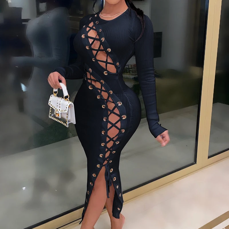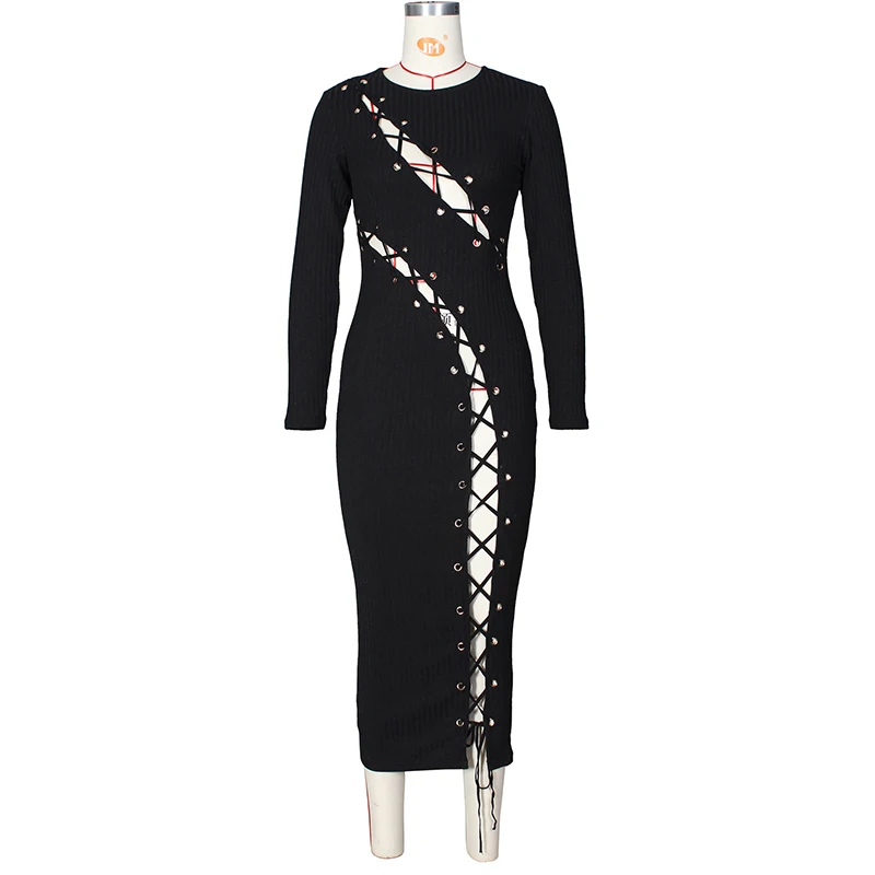 Ribbed Eyelet Sexy Club Dresses for Women Full Sleeve Round Neck Ankle Length Elastic Skinny Woman Dress