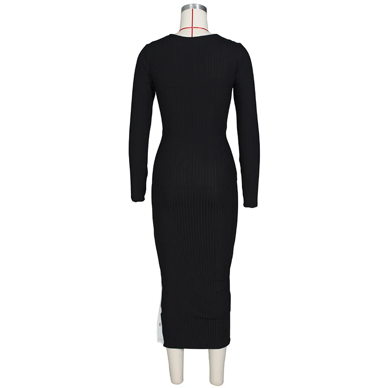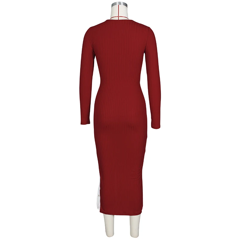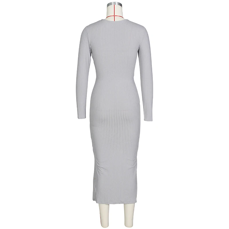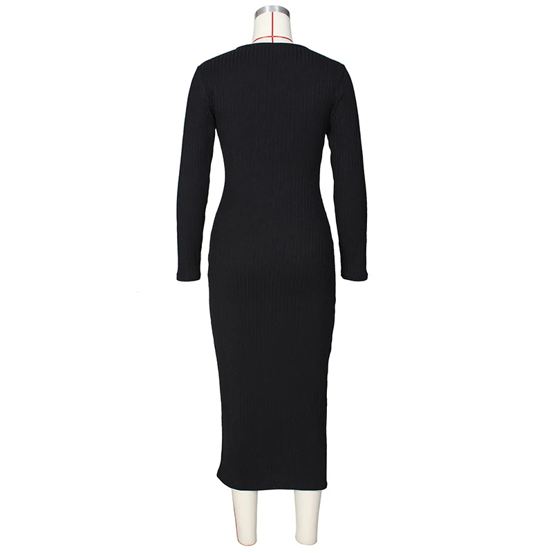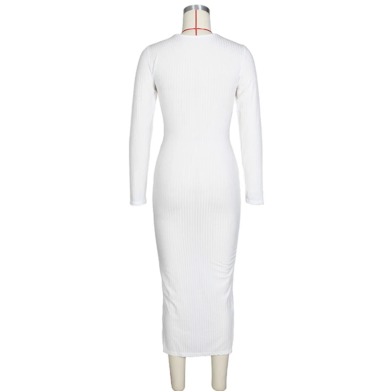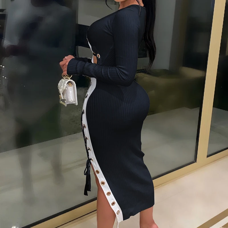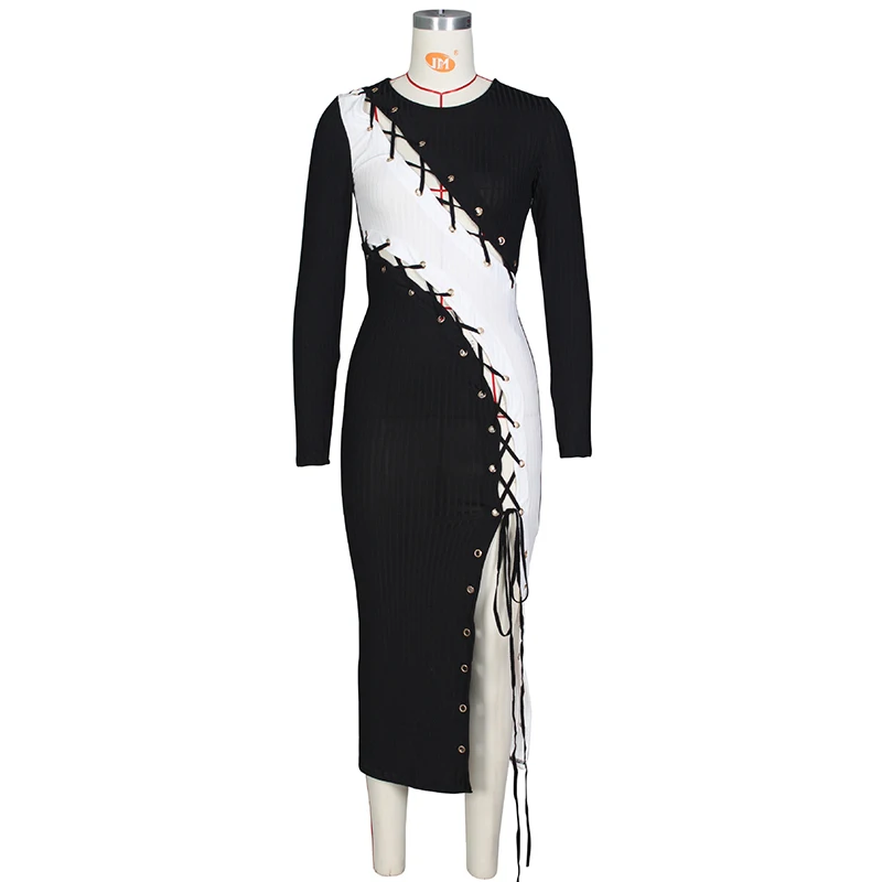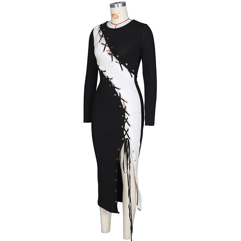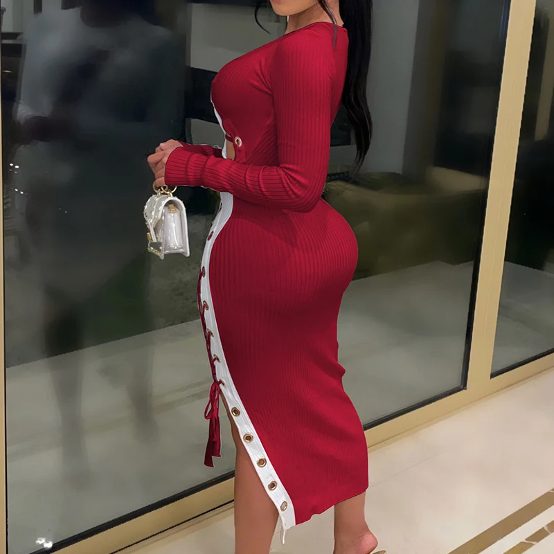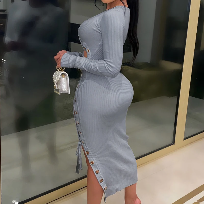 Ribbed Eyelet Sexy Club Dresses for Women Full Sleeve Round Neck Ankle Length Elastic Skinny Woman Dress