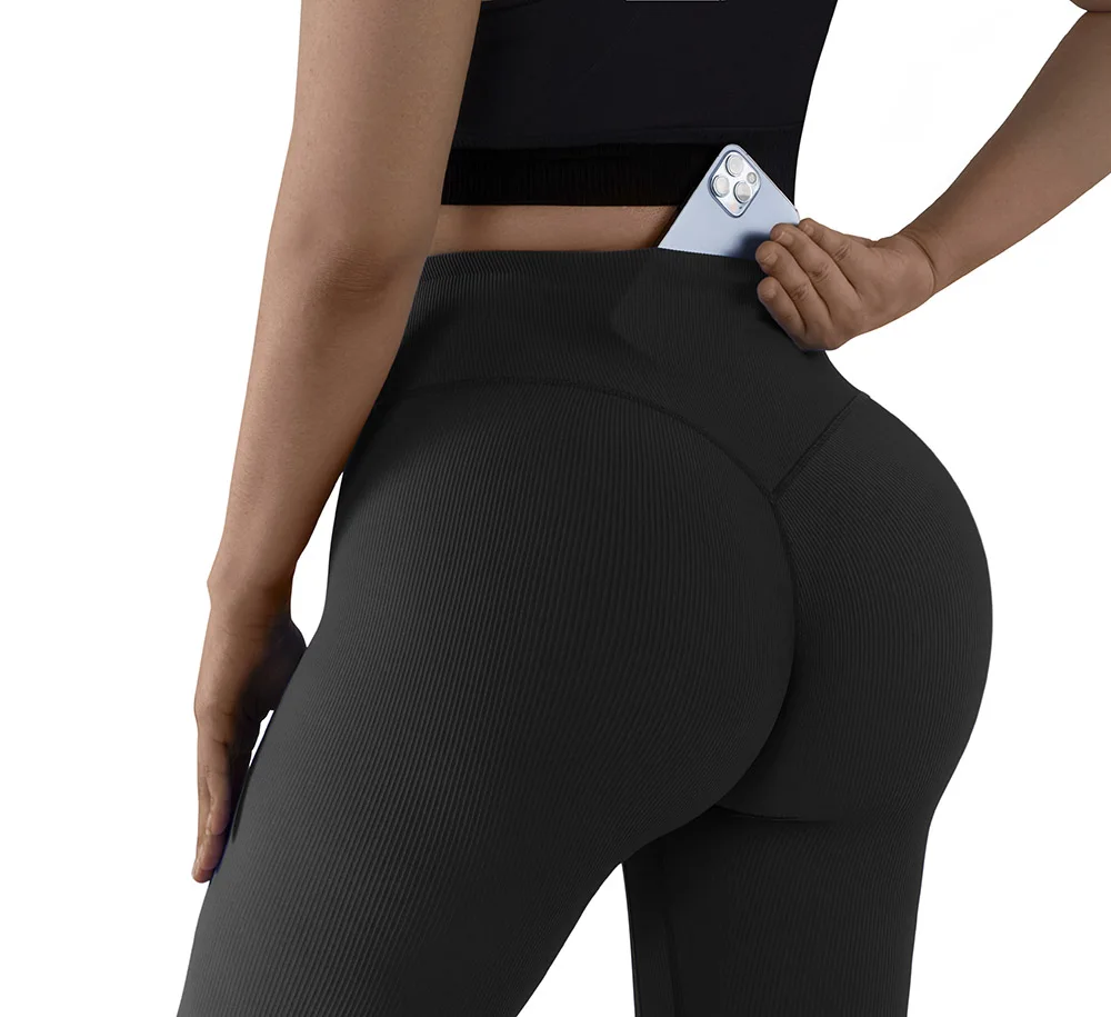 Ribbed Leggings for Fitness Seamless Workout Leggings Women Push Up Sport Tights High Waist Yoga Pants Gym Leggings with Pockets