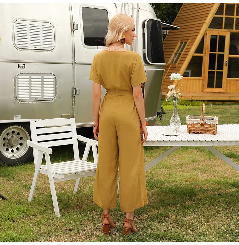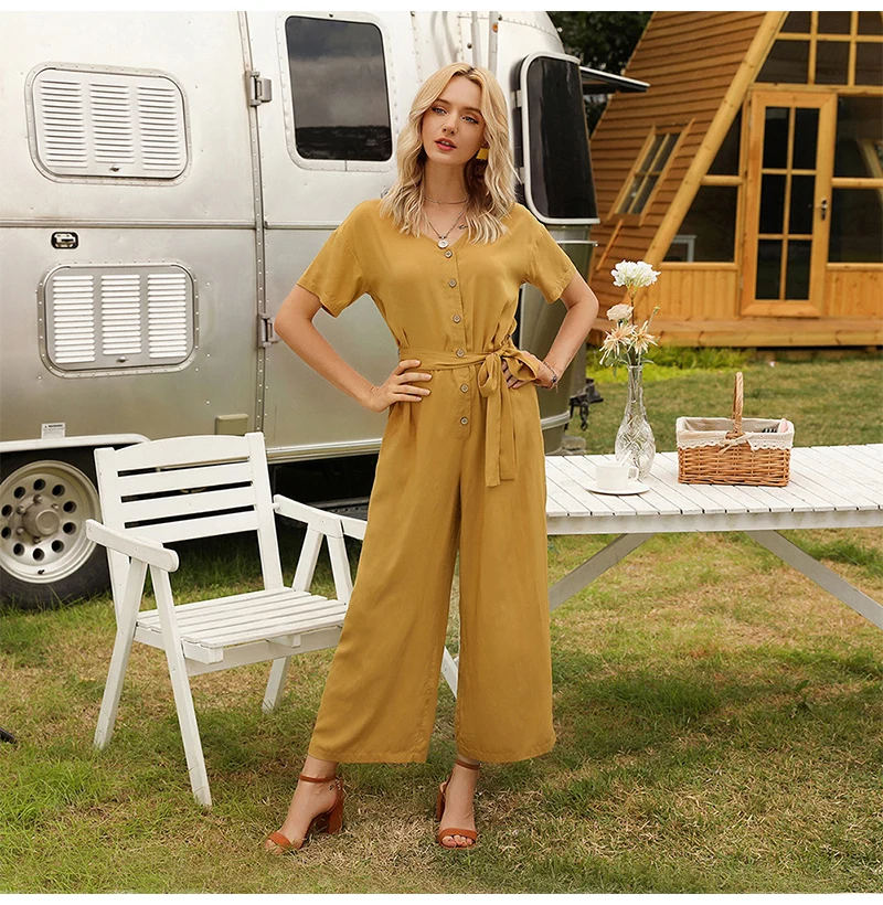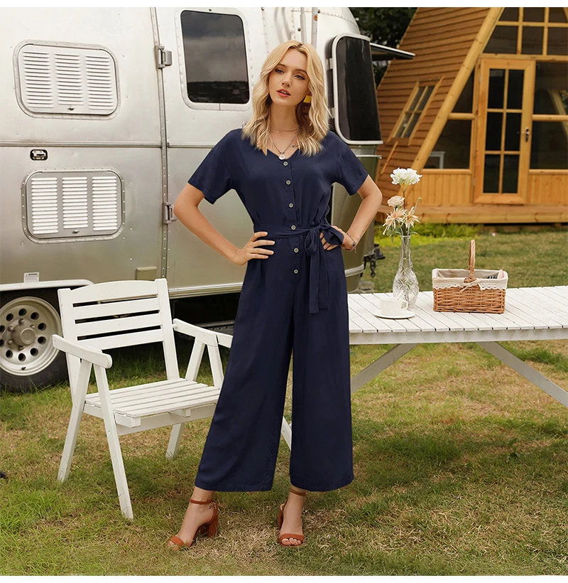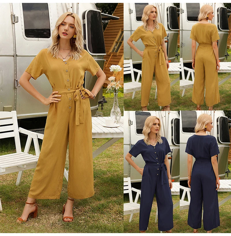 Rompers Womens Jumpsuit Casual Ladies Wide Leg One Piece Outfit Women Clothes Belt Summer Jumpsuits Pockets Button 2020 Fashion