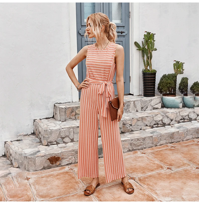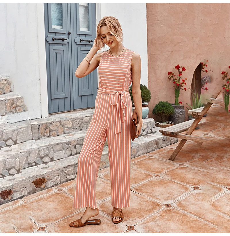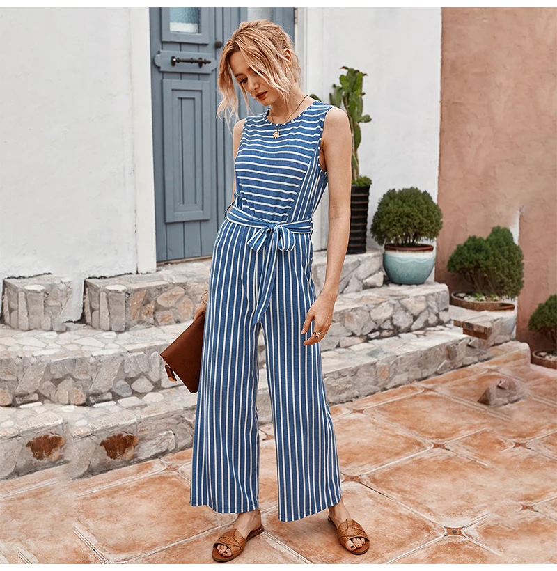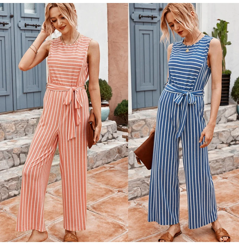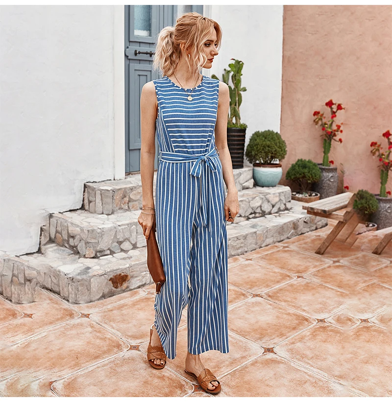 Rompers Womens Jumpsuit Summer Striped Tank Casual Pink Wide Leg One Piece Matching Outfits Women Clothes Belt 2020 Fashion Blue