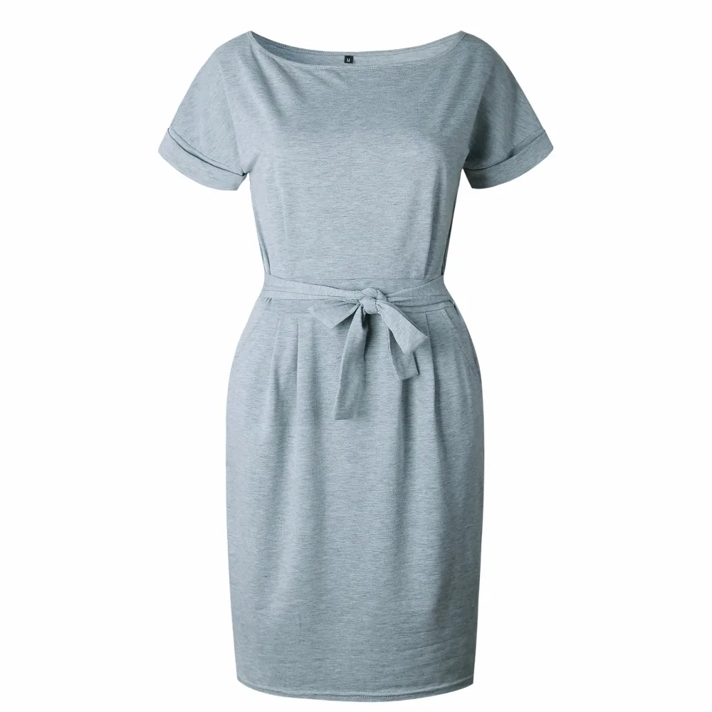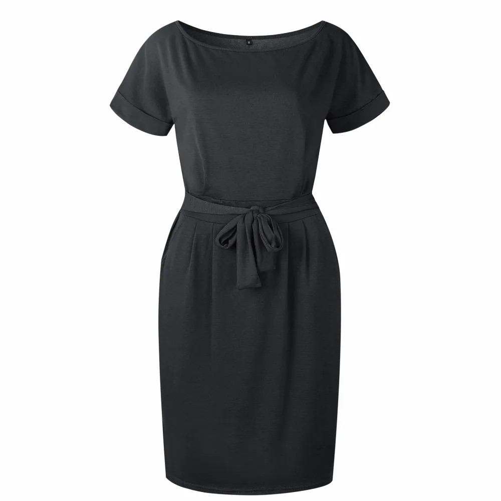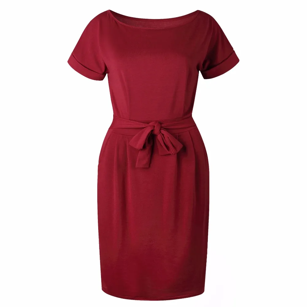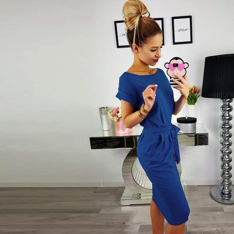 S-New ETSTWENDY Summer 2019 Casual Women Dress Fashion O-neck Short Sleeve Lace-up Pleated Dress Slim Lady Office Dress Vestidos