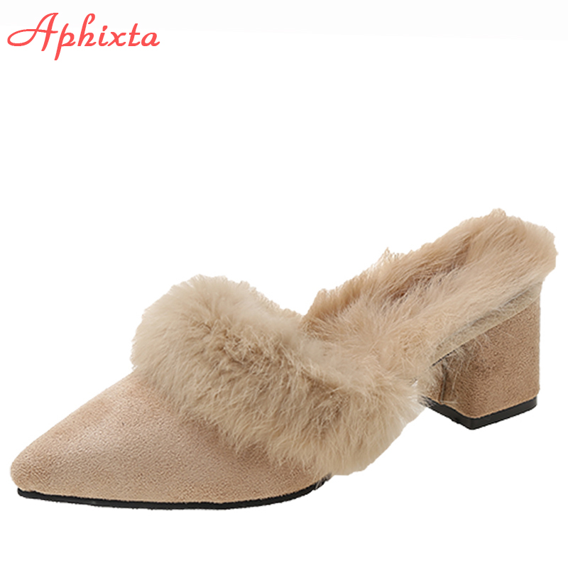 Aphixta Warm Real Rabbit Hair Slippers Women Shoes Winter Pointed Toe Luxury Real Fur Square Heel Lady Mujer Indoor Slides