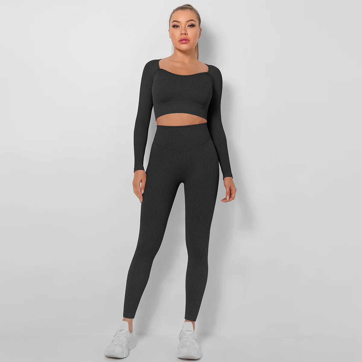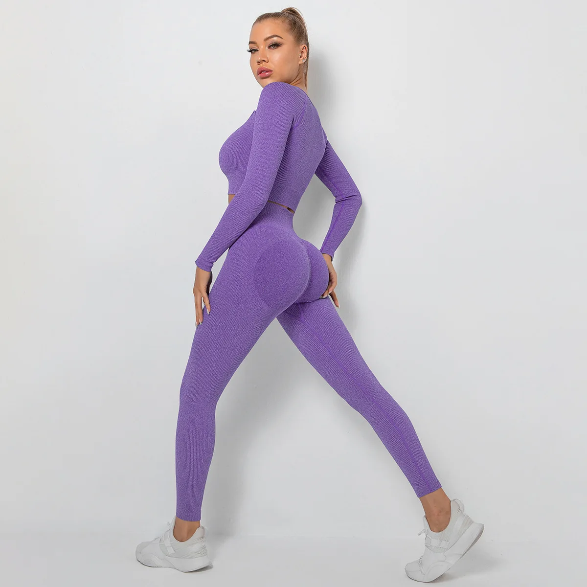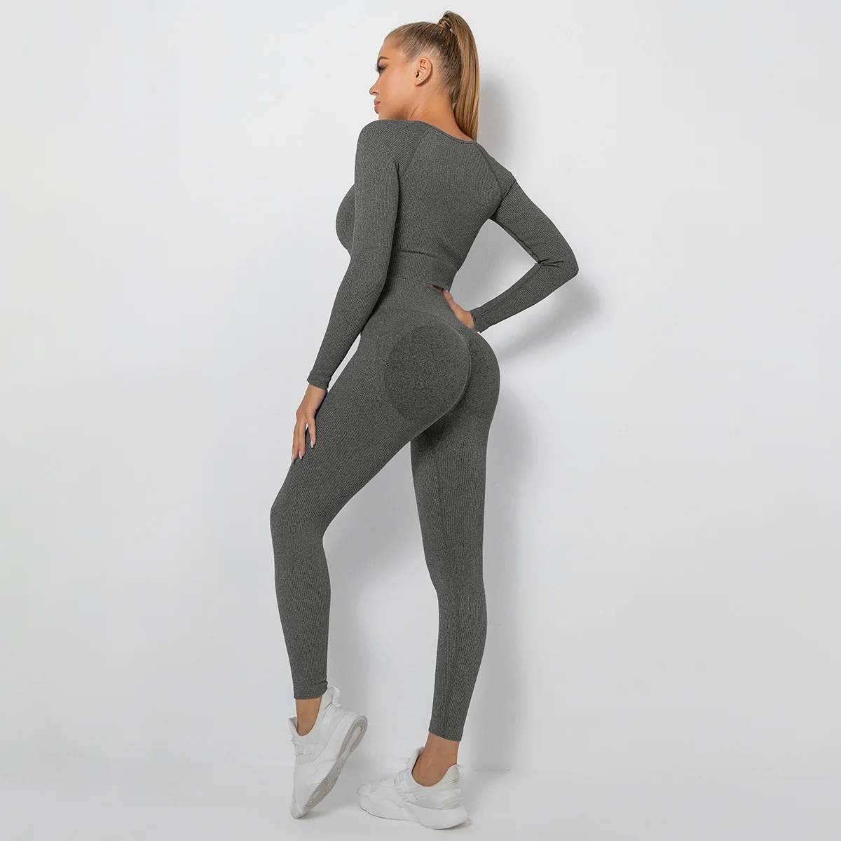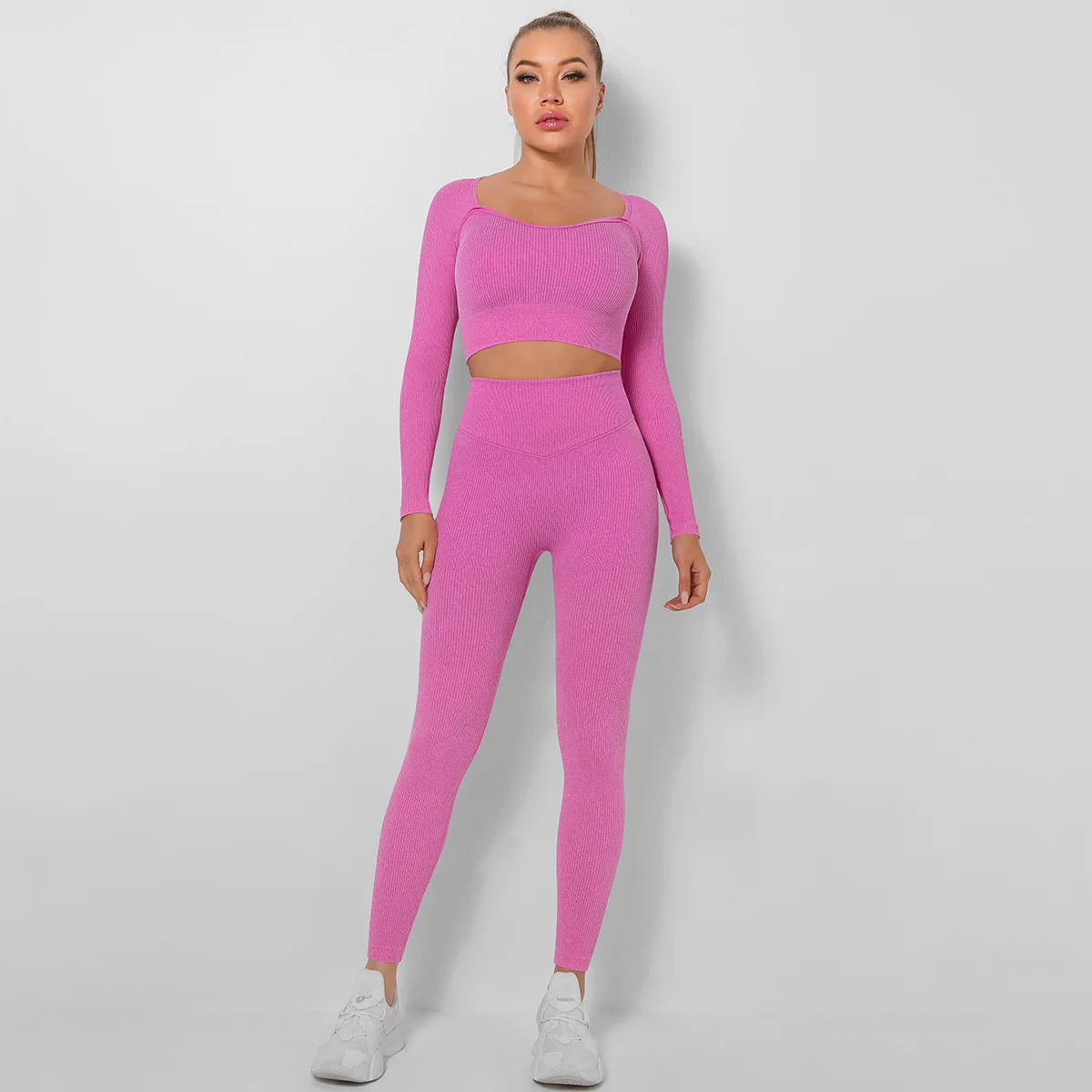 Seamless Thread Yoga Sets Sports Fitness High Waist Hip Raise Pants Long-Sleeved Suit Workout Clothes Gym Leggings Set for Women