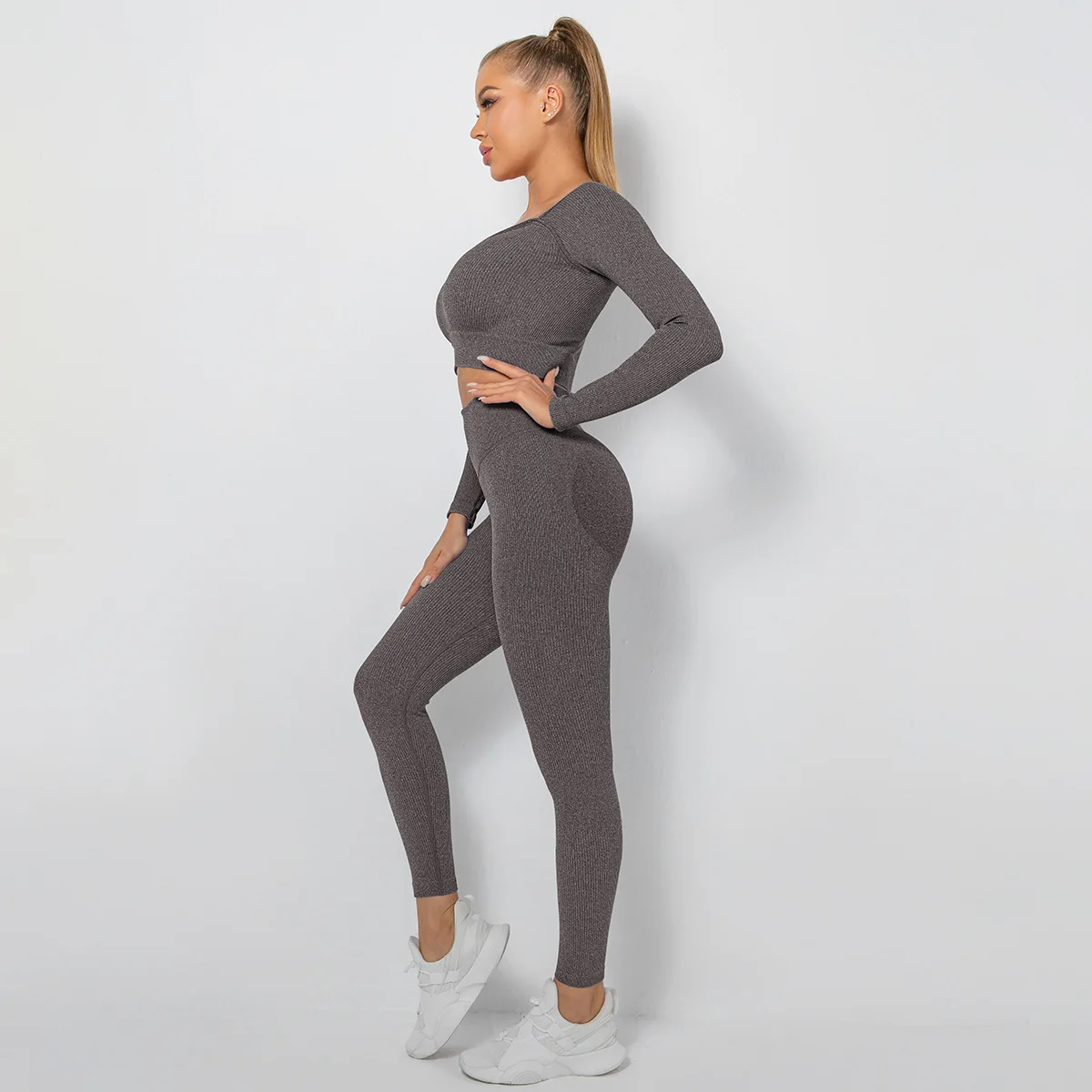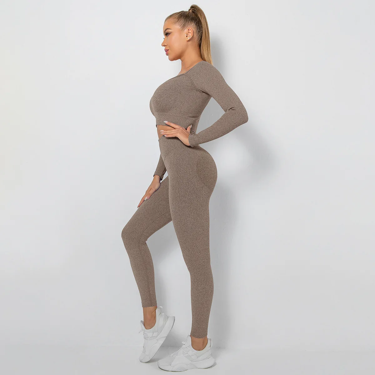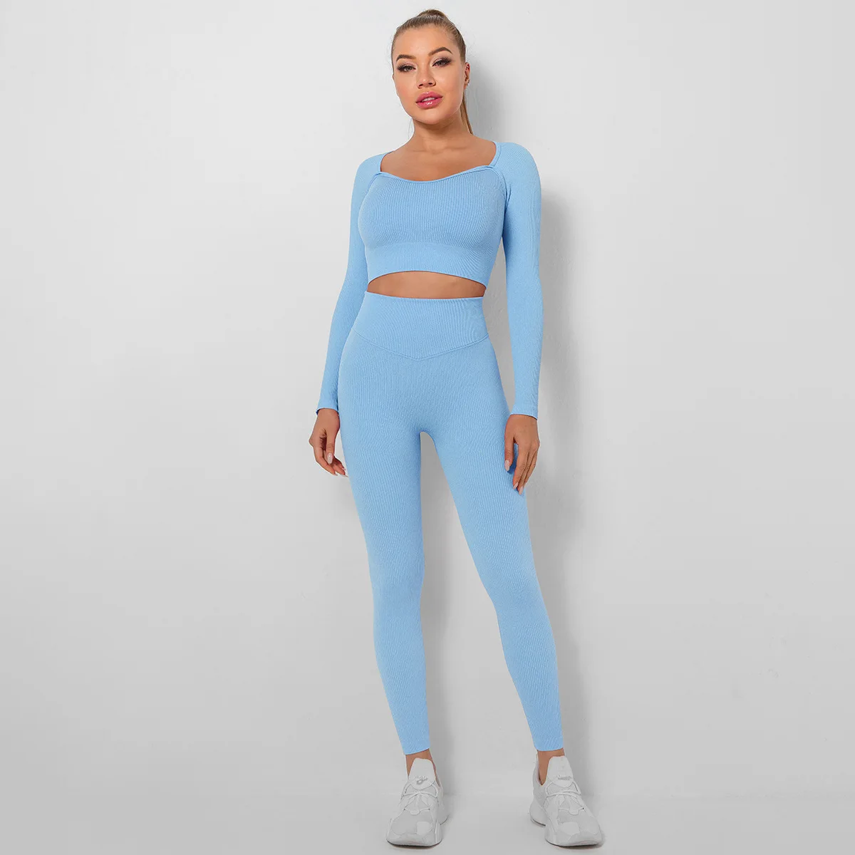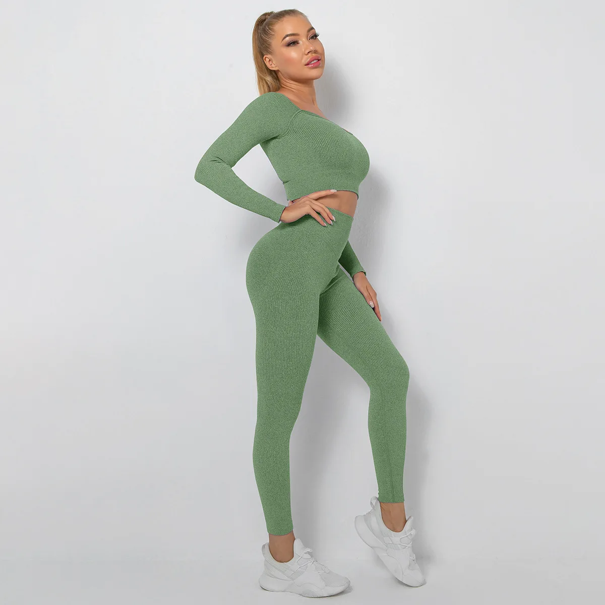 Seamless Thread Yoga Sets Sports Fitness High Waist Hip Raise Pants Long-Sleeved Suit Workout Clothes Gym Leggings Set for Women