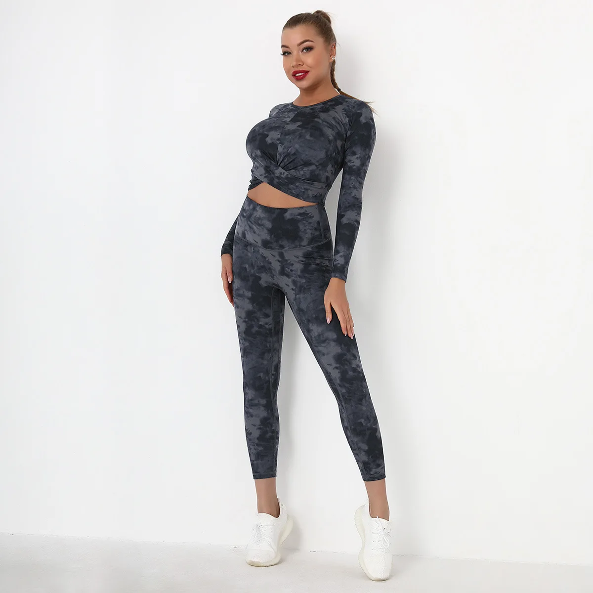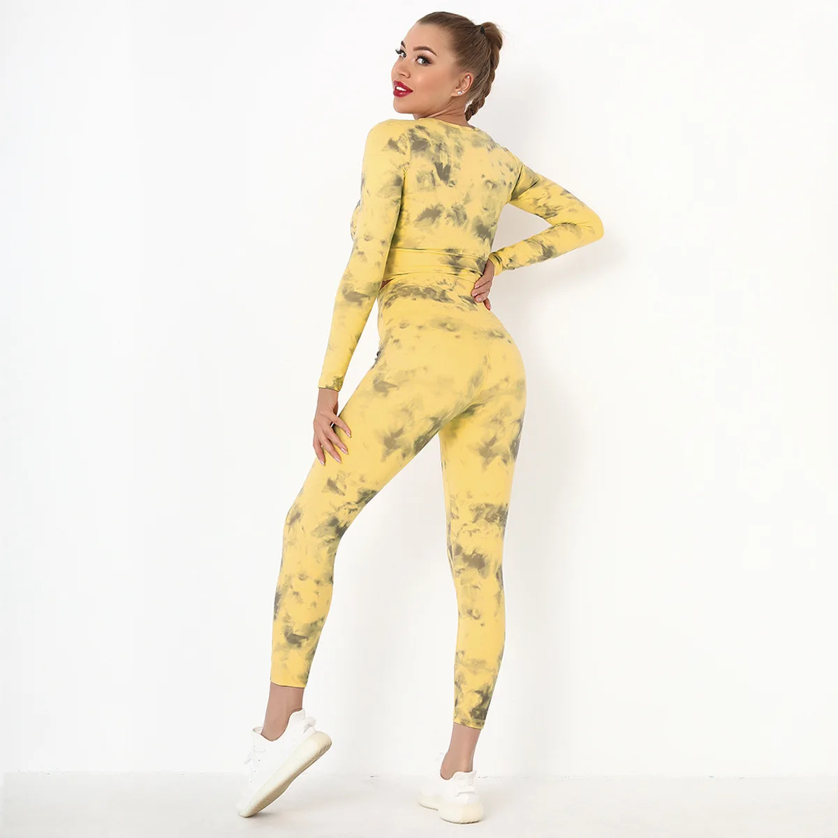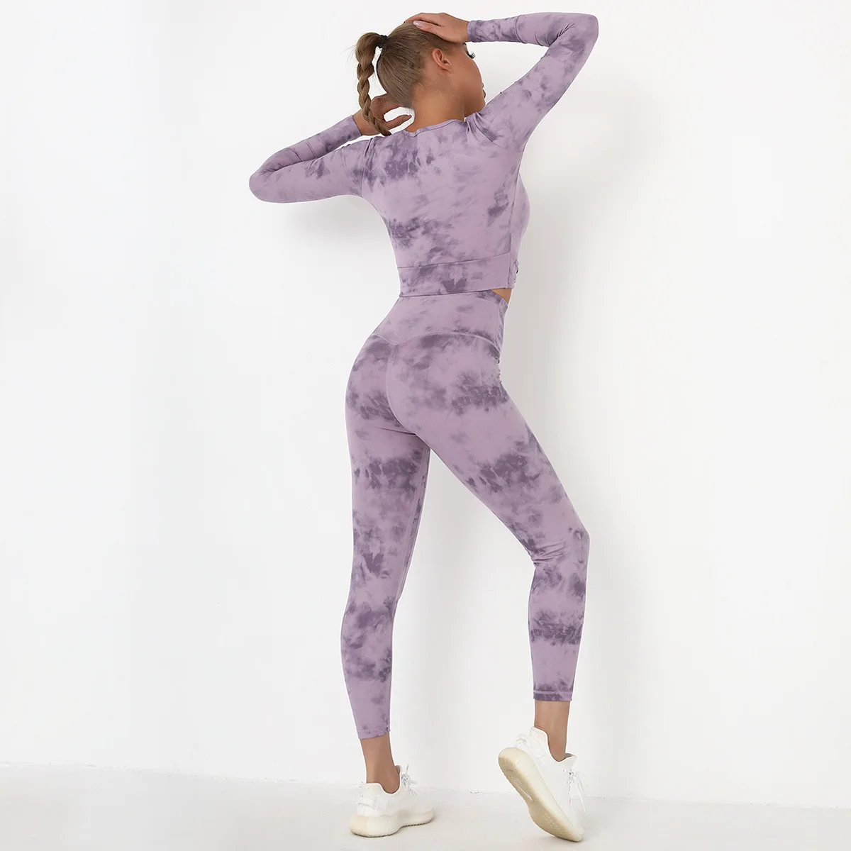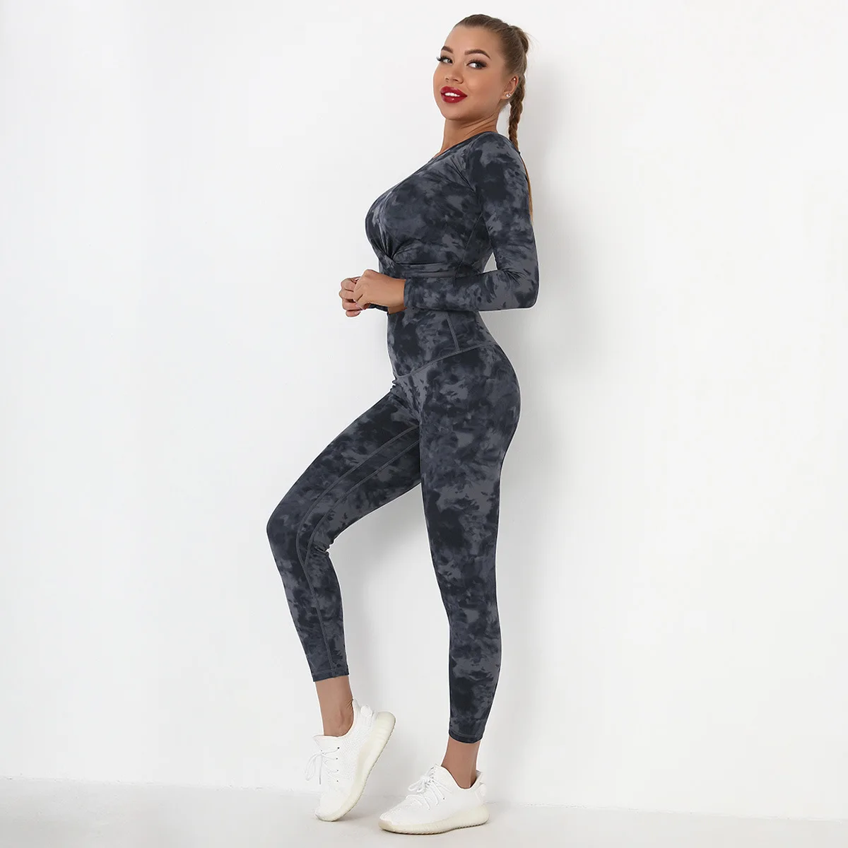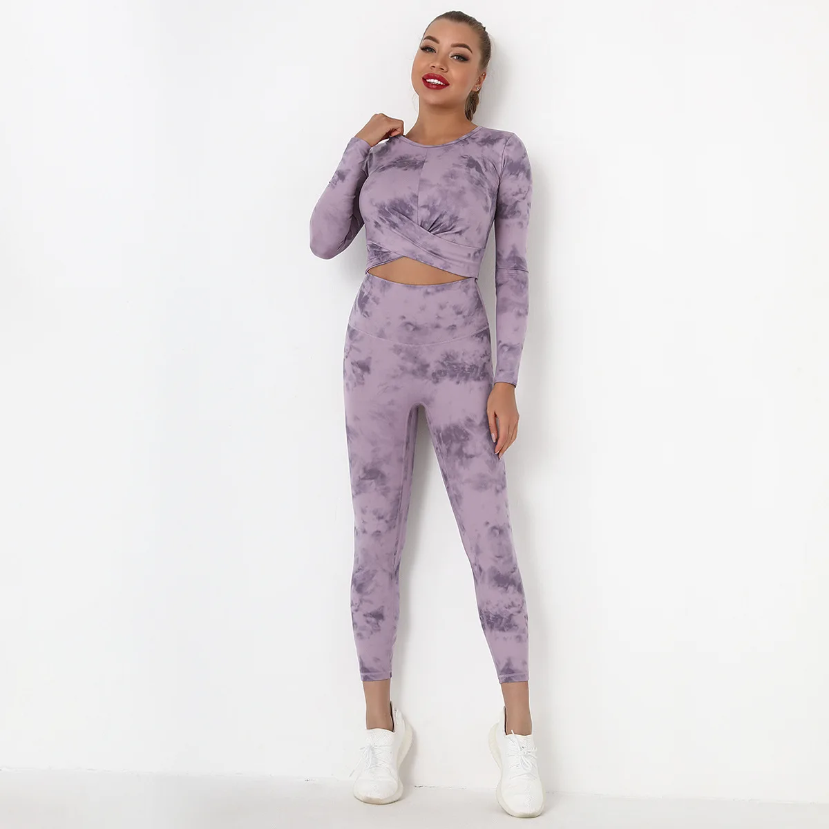 Seamless Tie-Dyed Yoga Set Sports Finesss High Waist Hip Raise Brushed Pants Long Sleeve Suit Workout Gym Leggings Set for Women