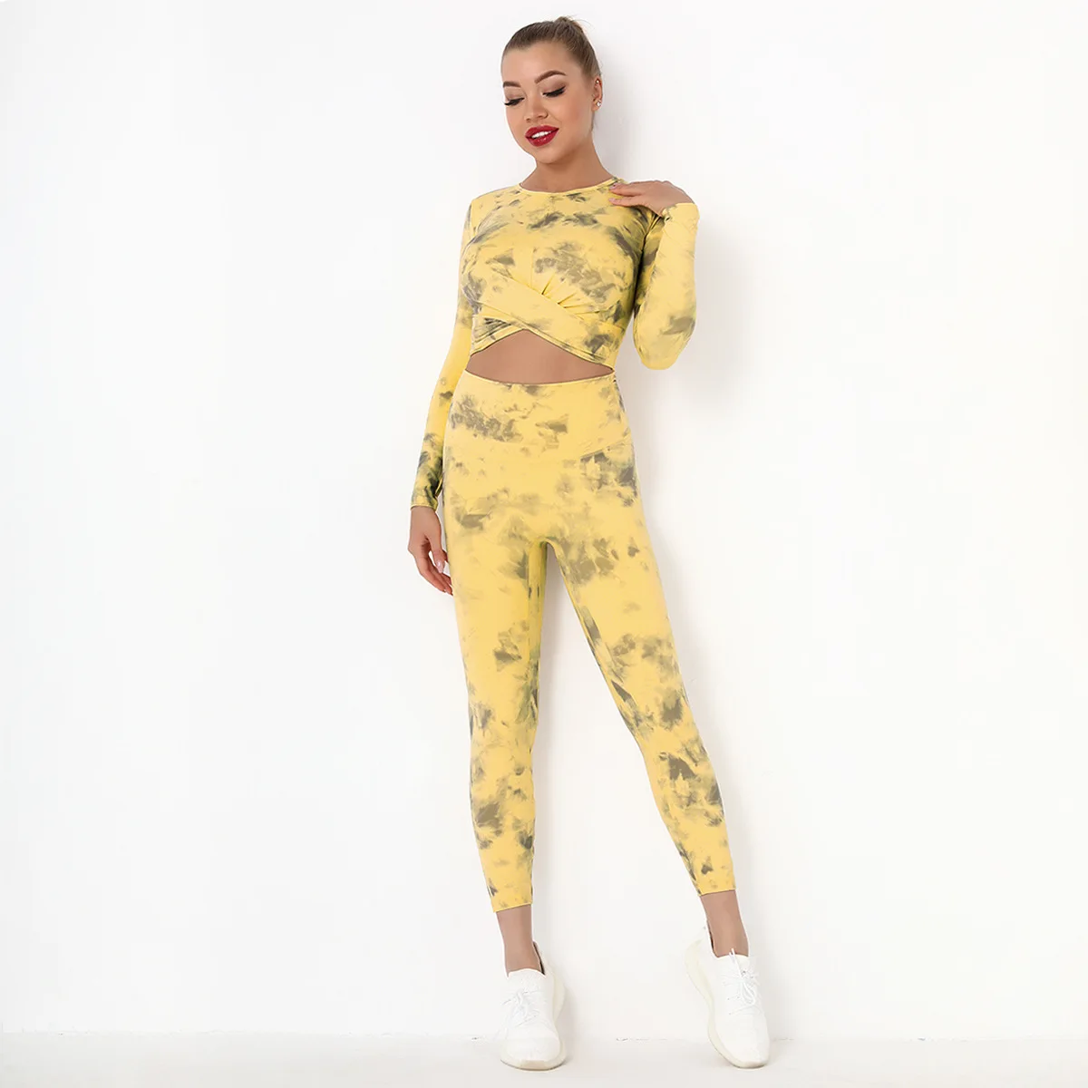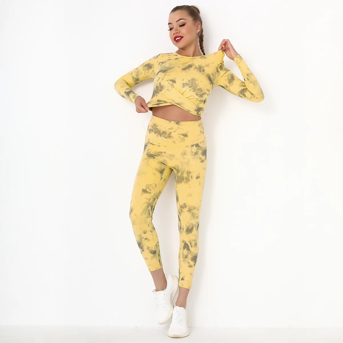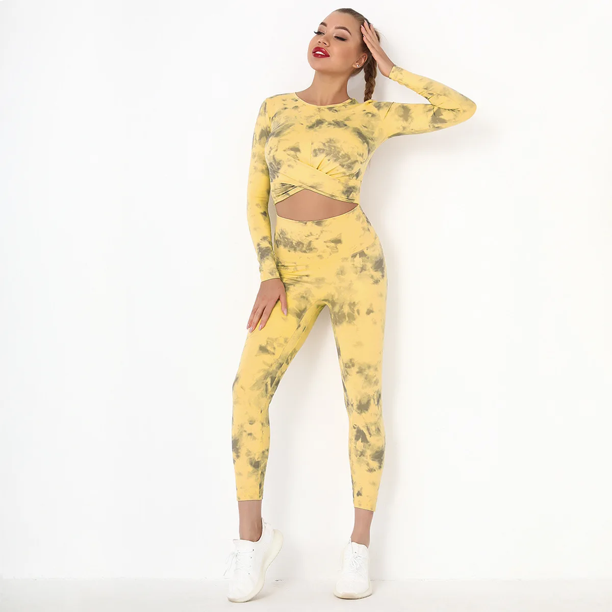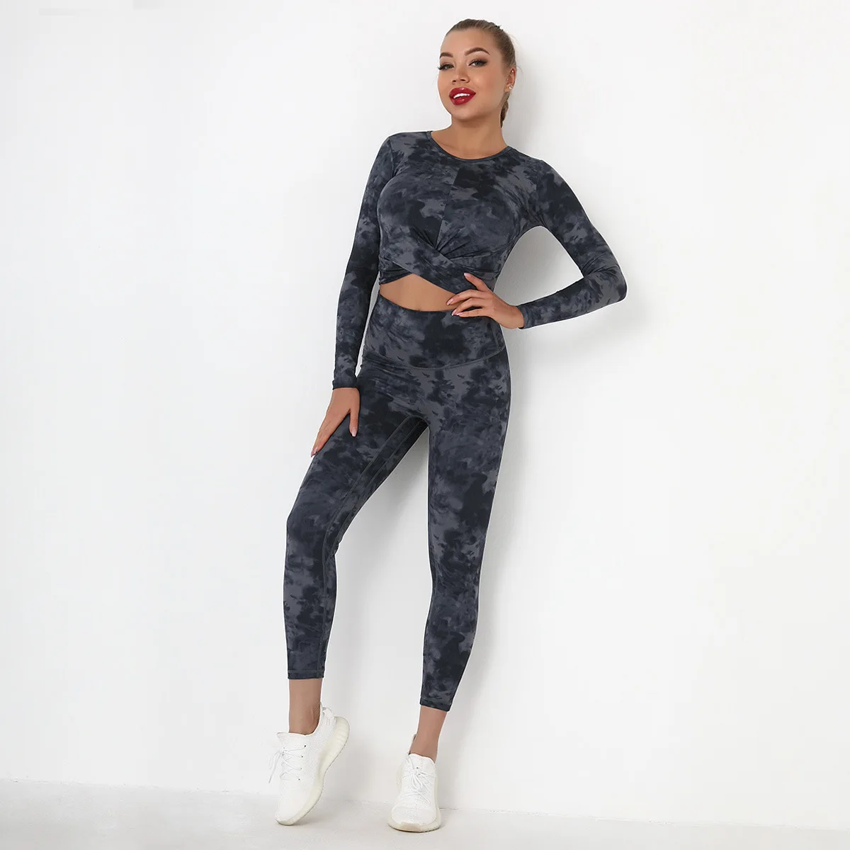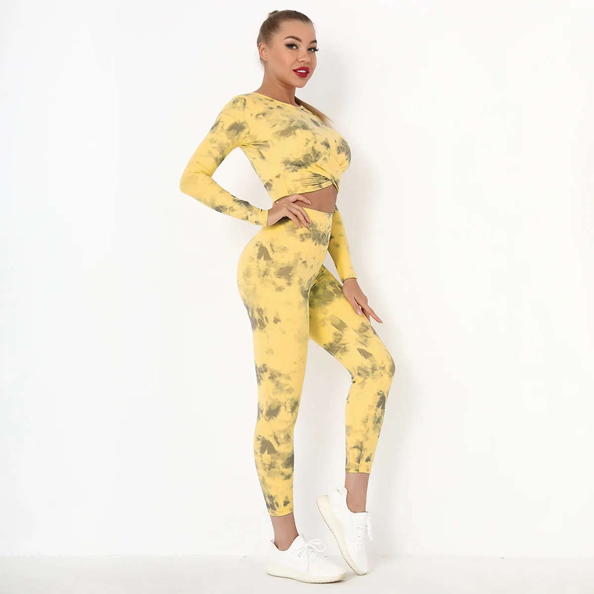Seamless Tie-Dyed Yoga Set Sports Finesss High Waist Hip Raise Brushed Pants Long Sleeve Suit Workout Gym Leggings Set for Women