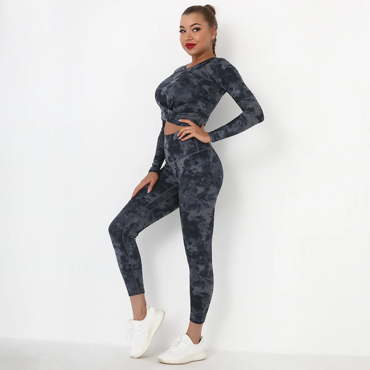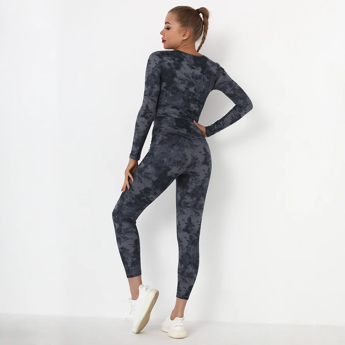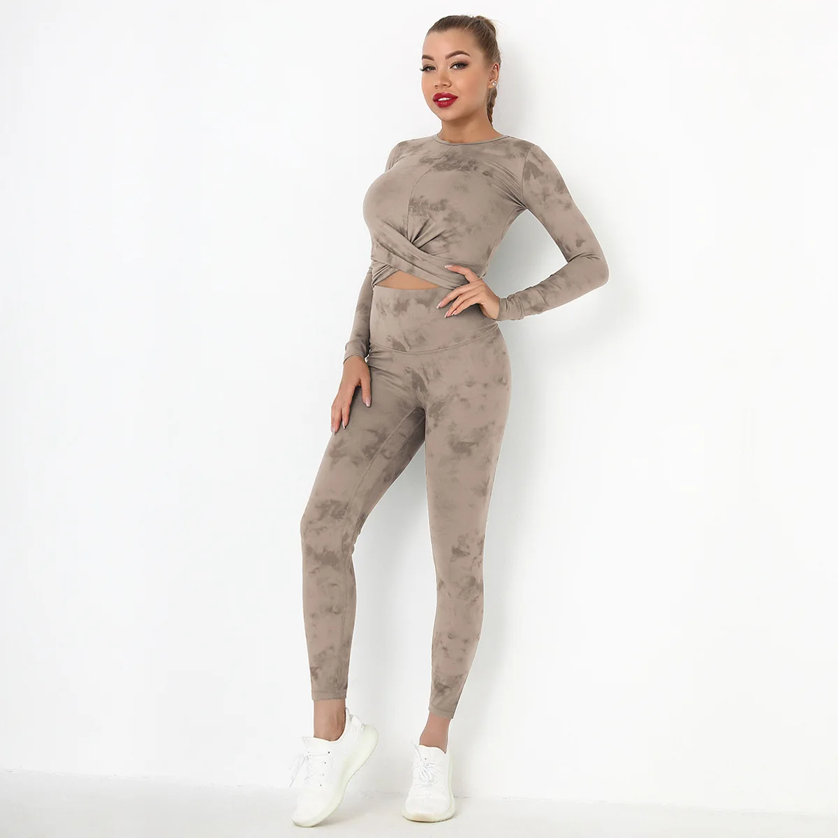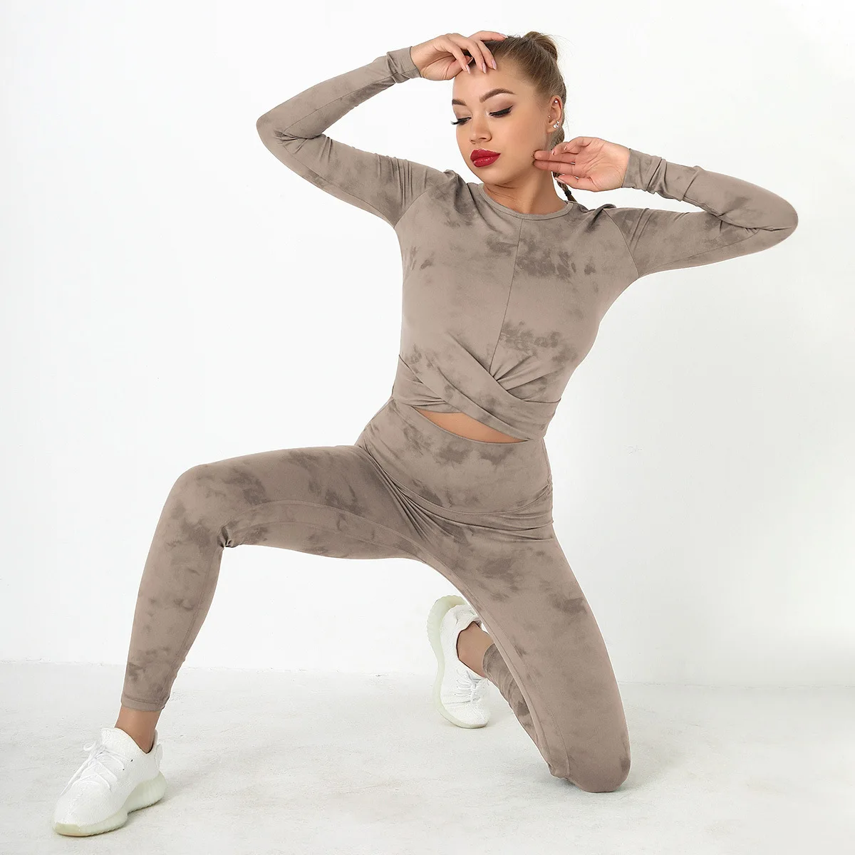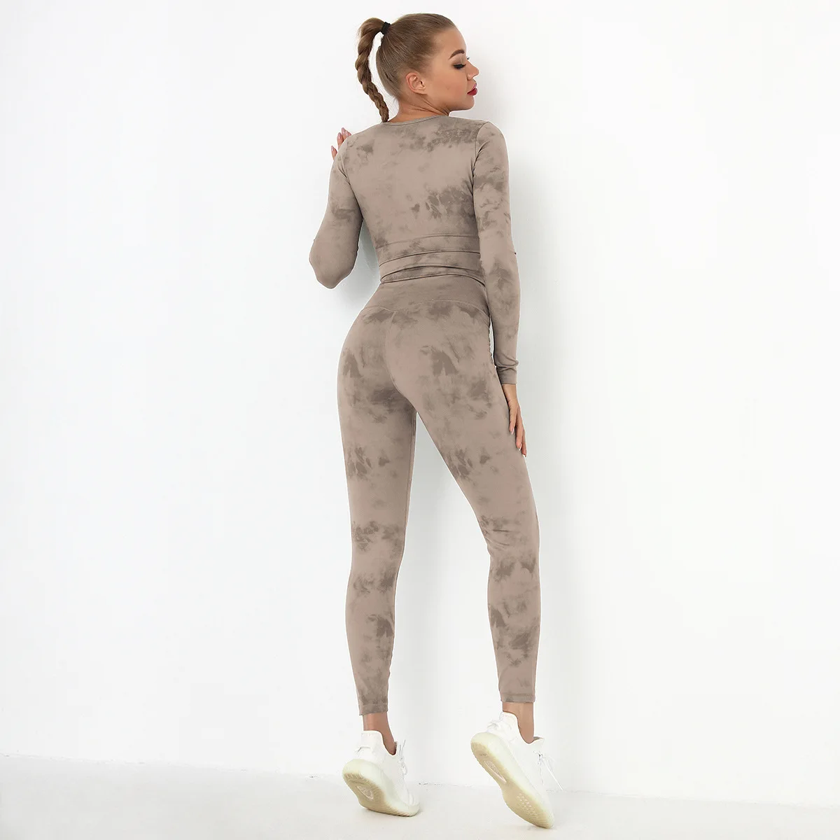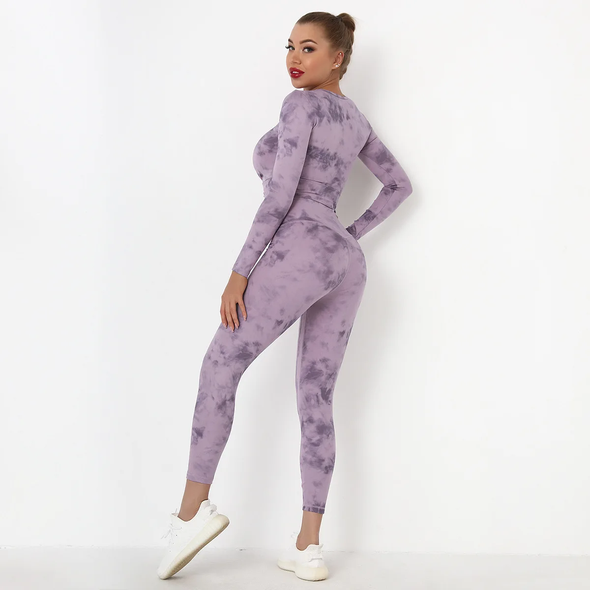 Seamless Tie-Dyed Yoga Set Sports Finesss High Waist Hip Raise Brushed Pants Long Sleeve Suit Workout Gym Leggings Set for Women