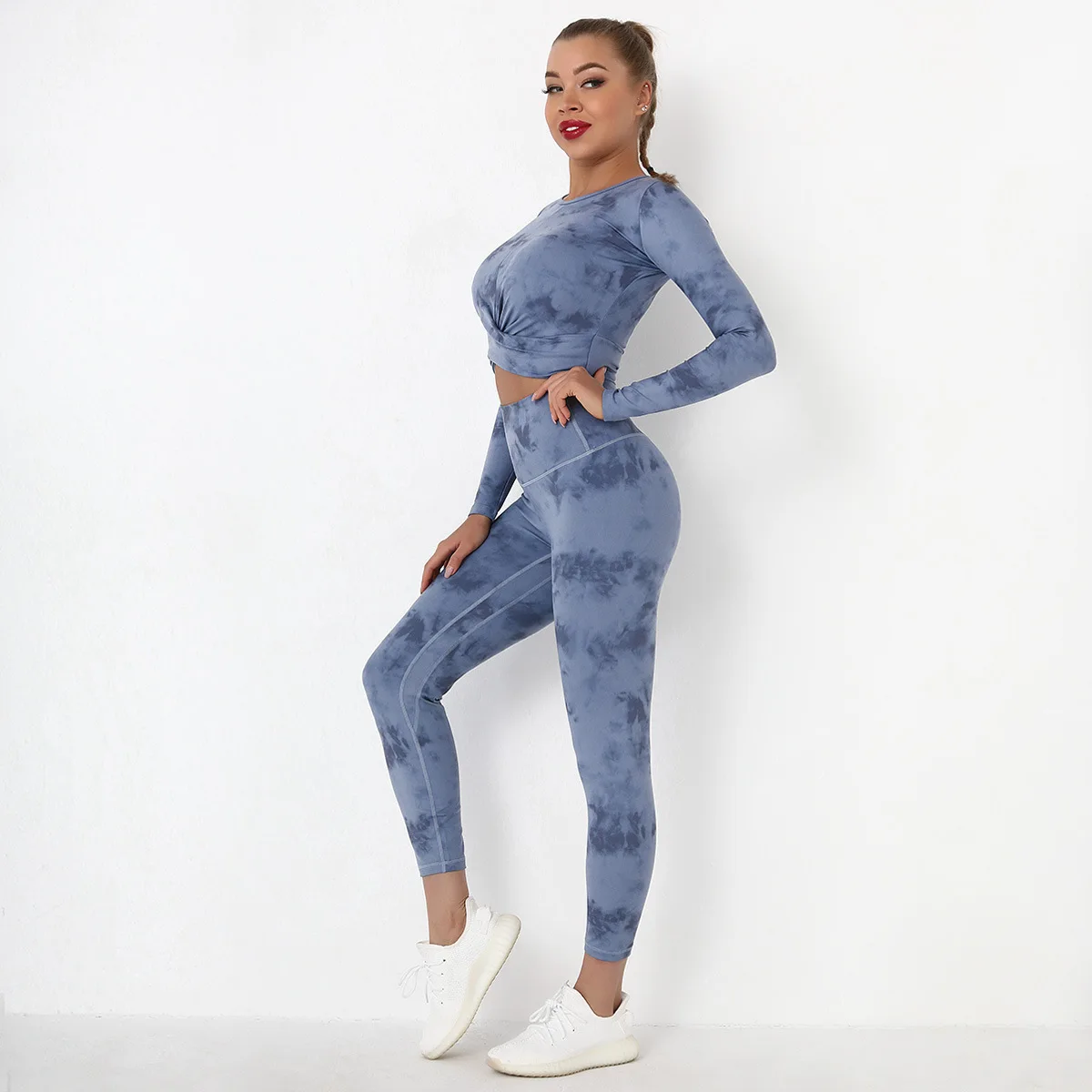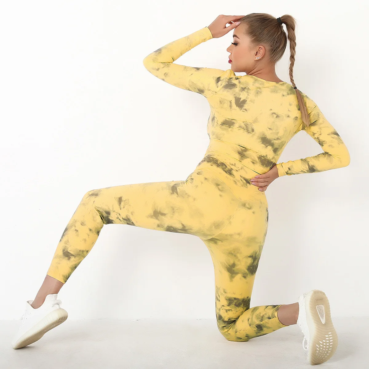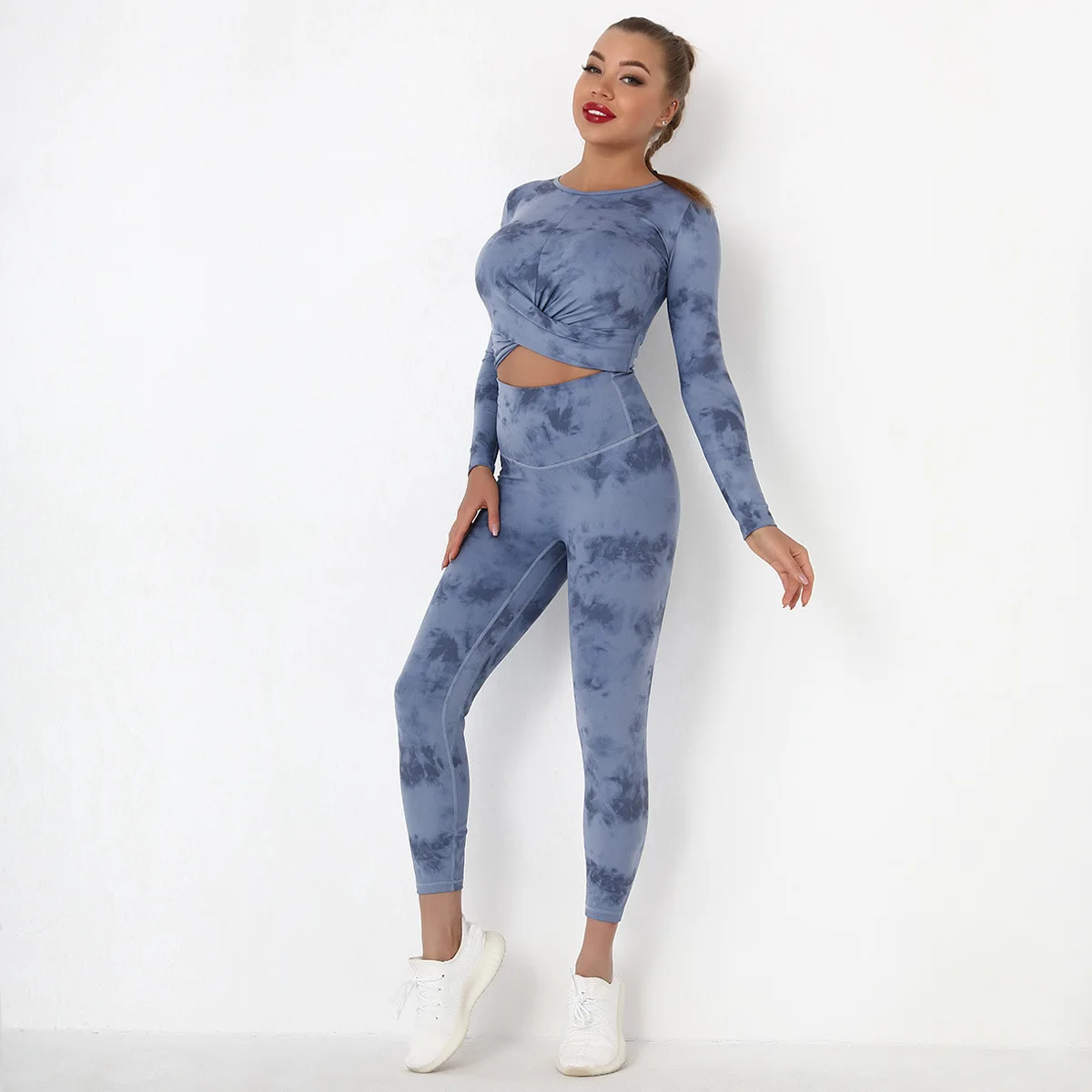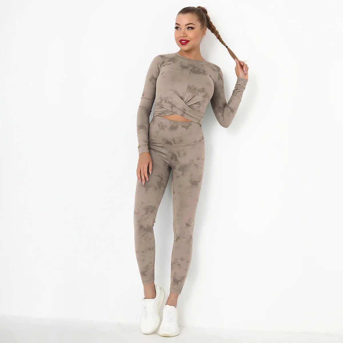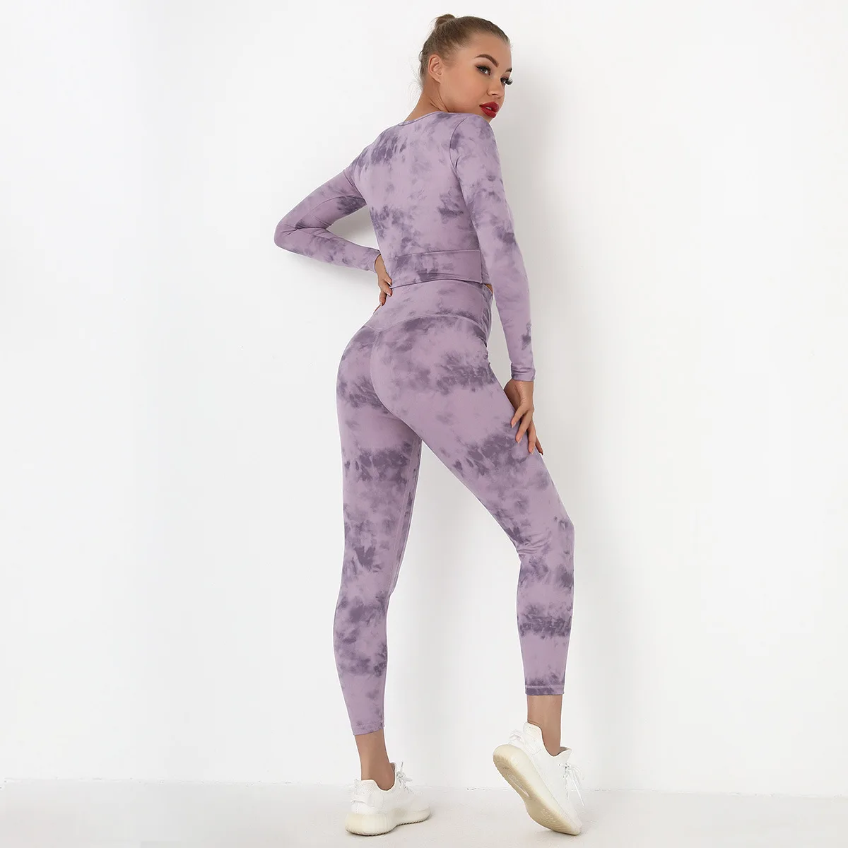Seamless Tie-Dyed Yoga Set Sports Finesss High Waist Hip Raise Brushed Pants Long Sleeve Suit Workout Gym Leggings Set for Women