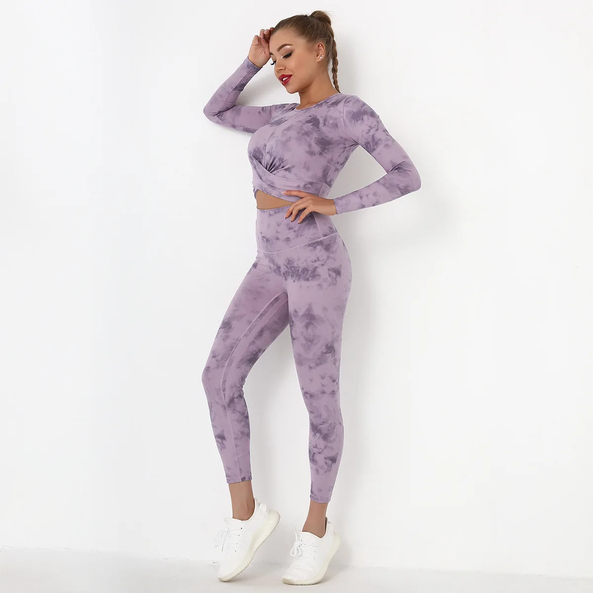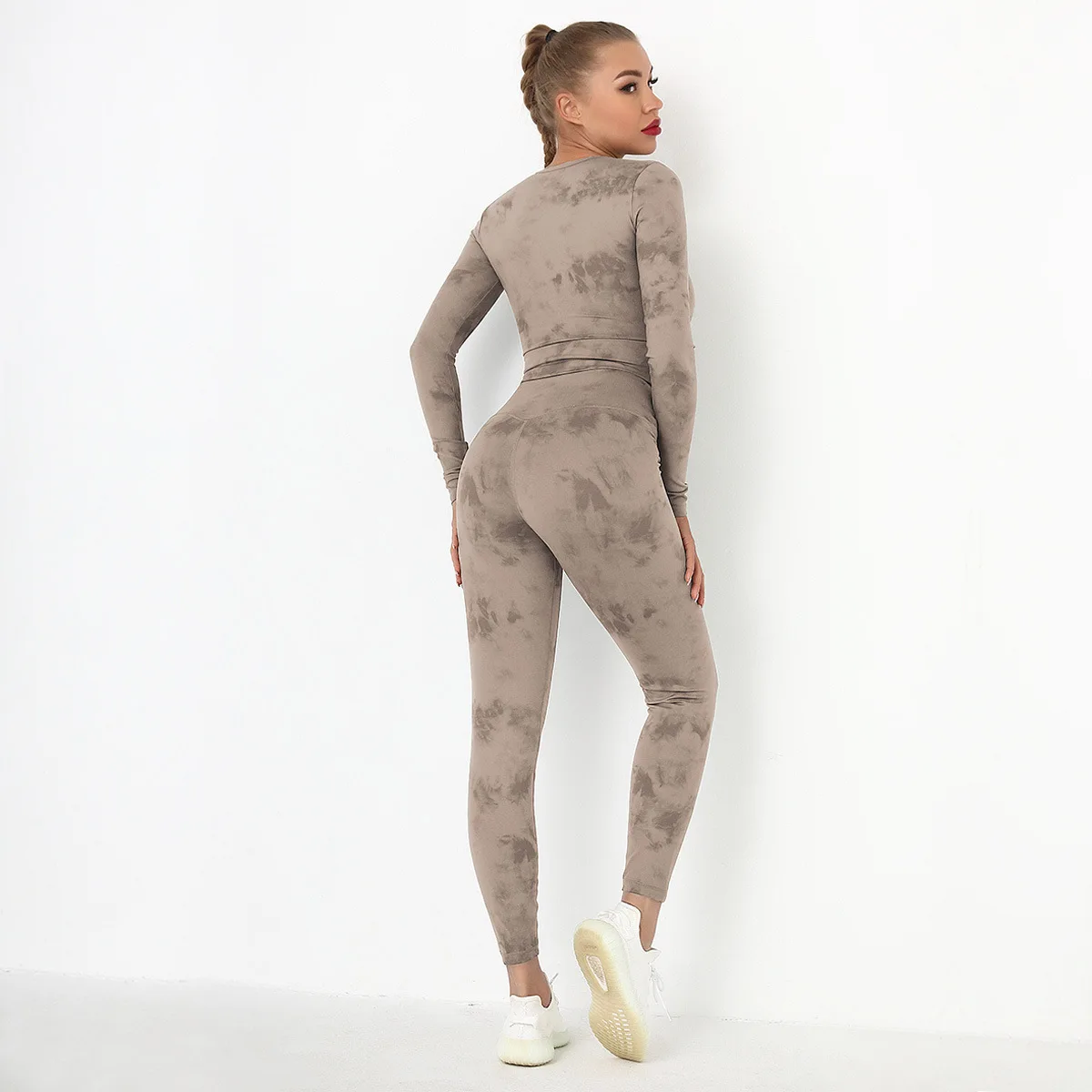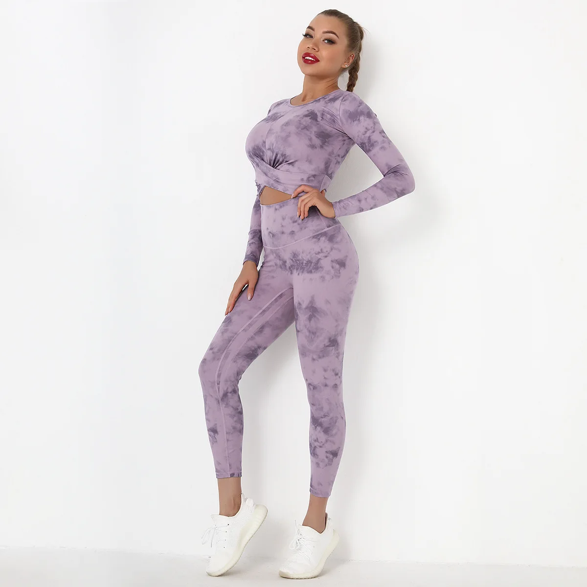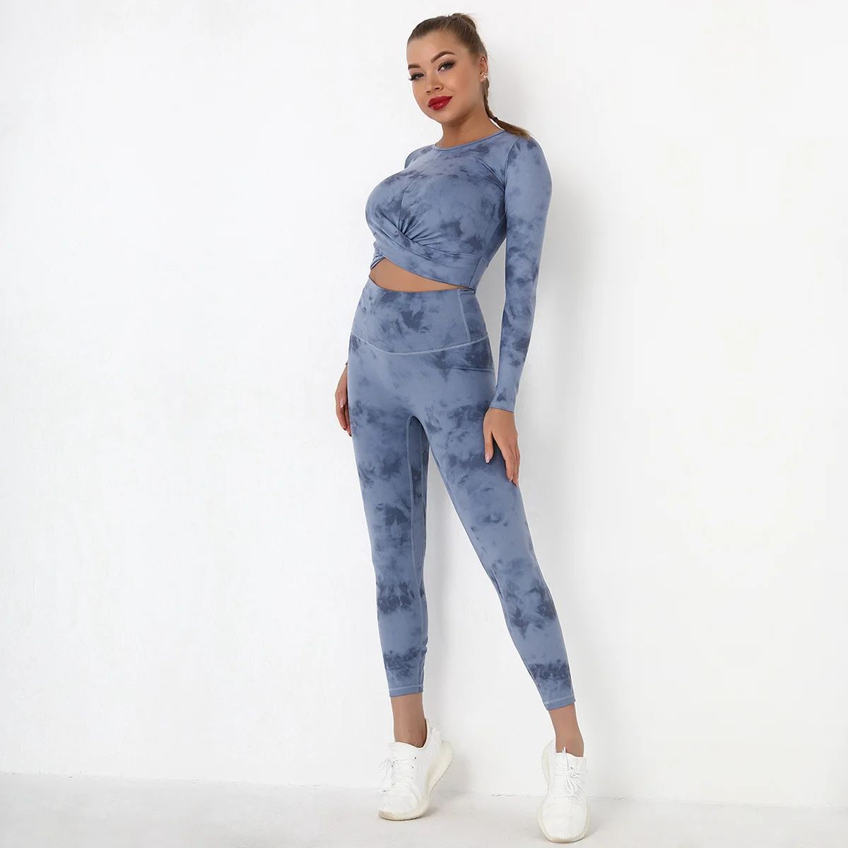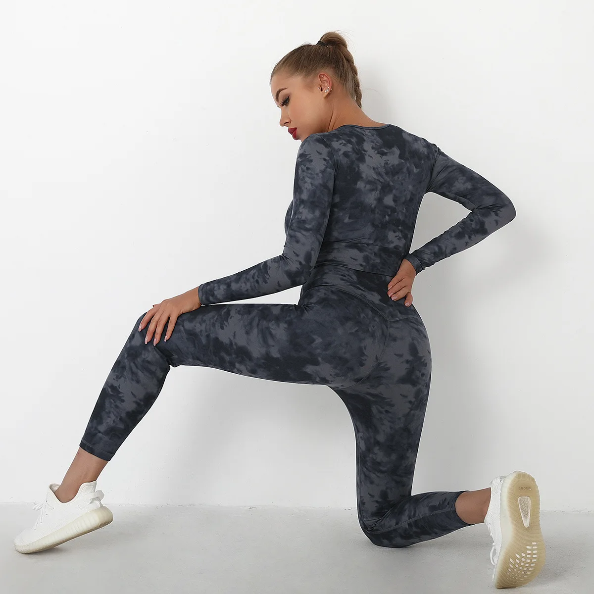 Seamless Tie-Dyed Yoga Set Sports Finesss High Waist Hip Raise Brushed Pants Long Sleeve Suit Workout Gym Leggings Set for Women