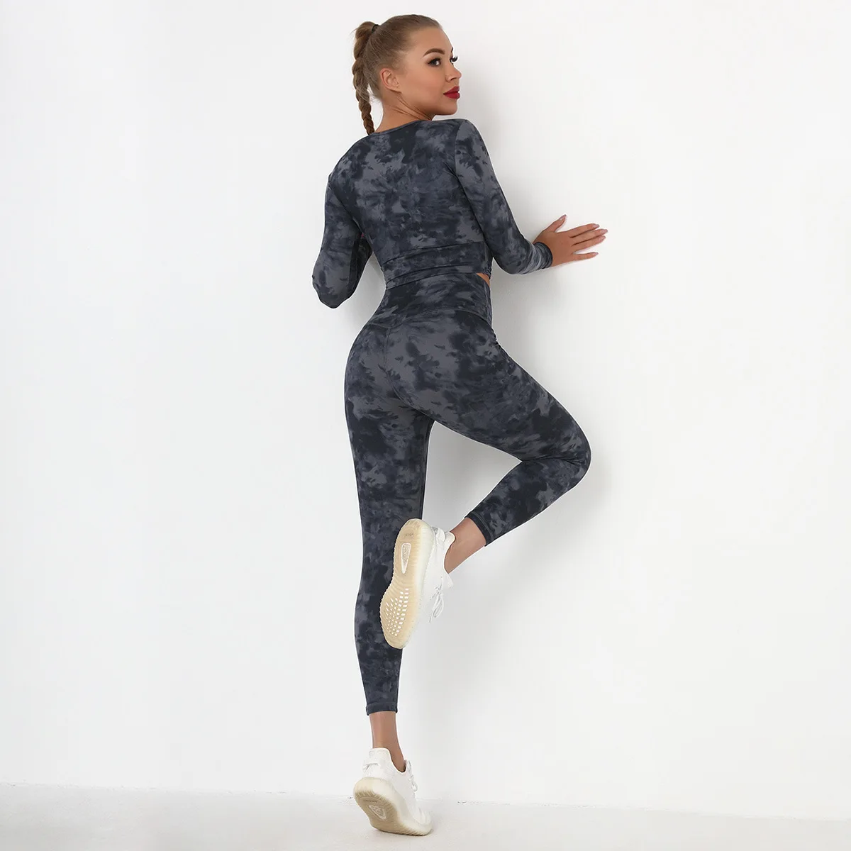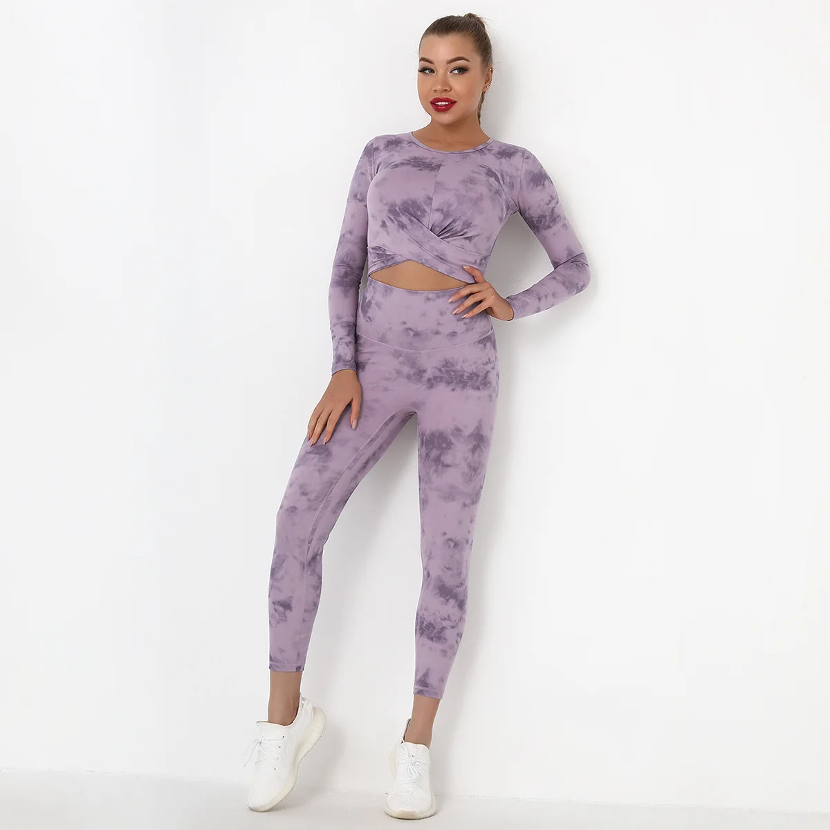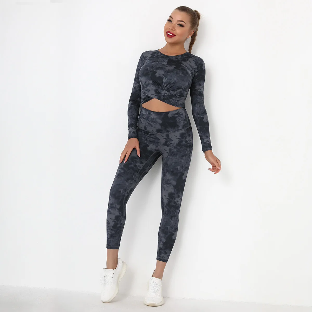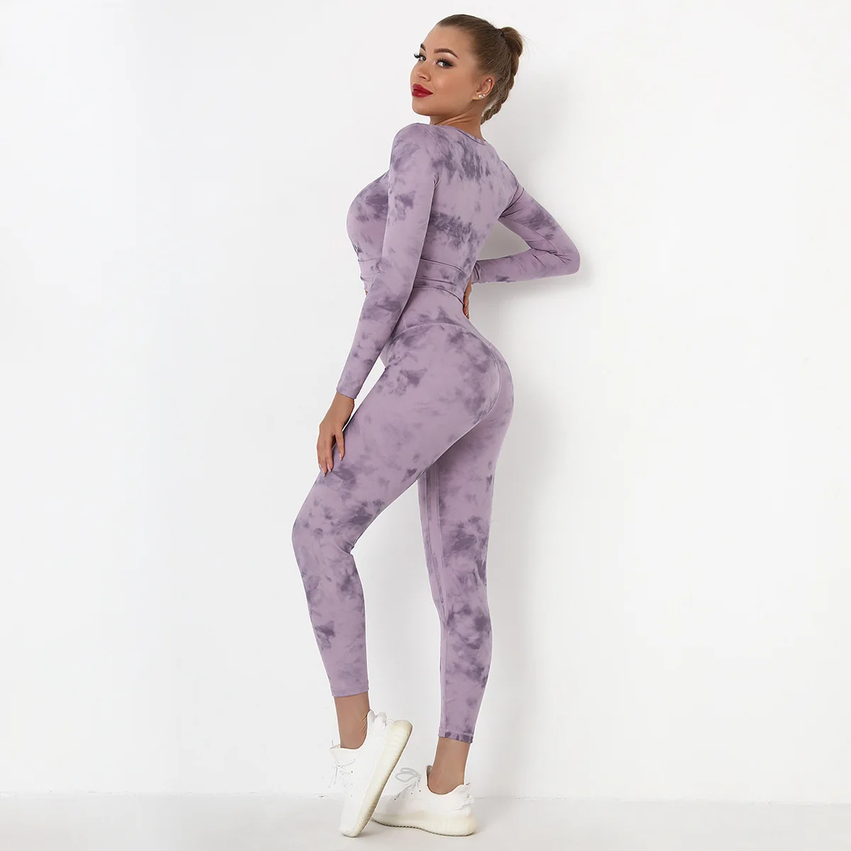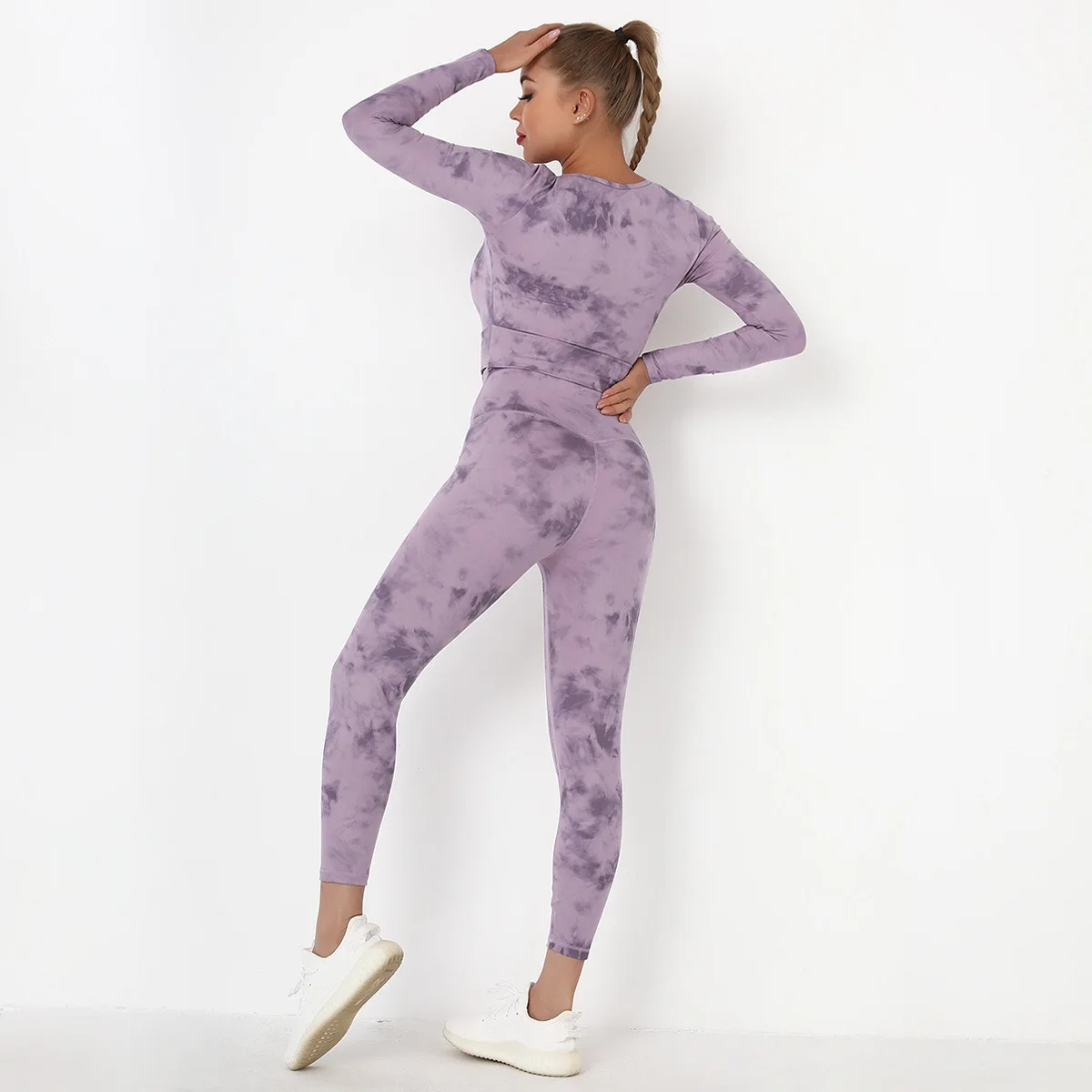 Seamless Tie-Dyed Yoga Set Sports Finesss High Waist Hip Raise Brushed Pants Long Sleeve Suit Workout Gym Leggings Set for Women