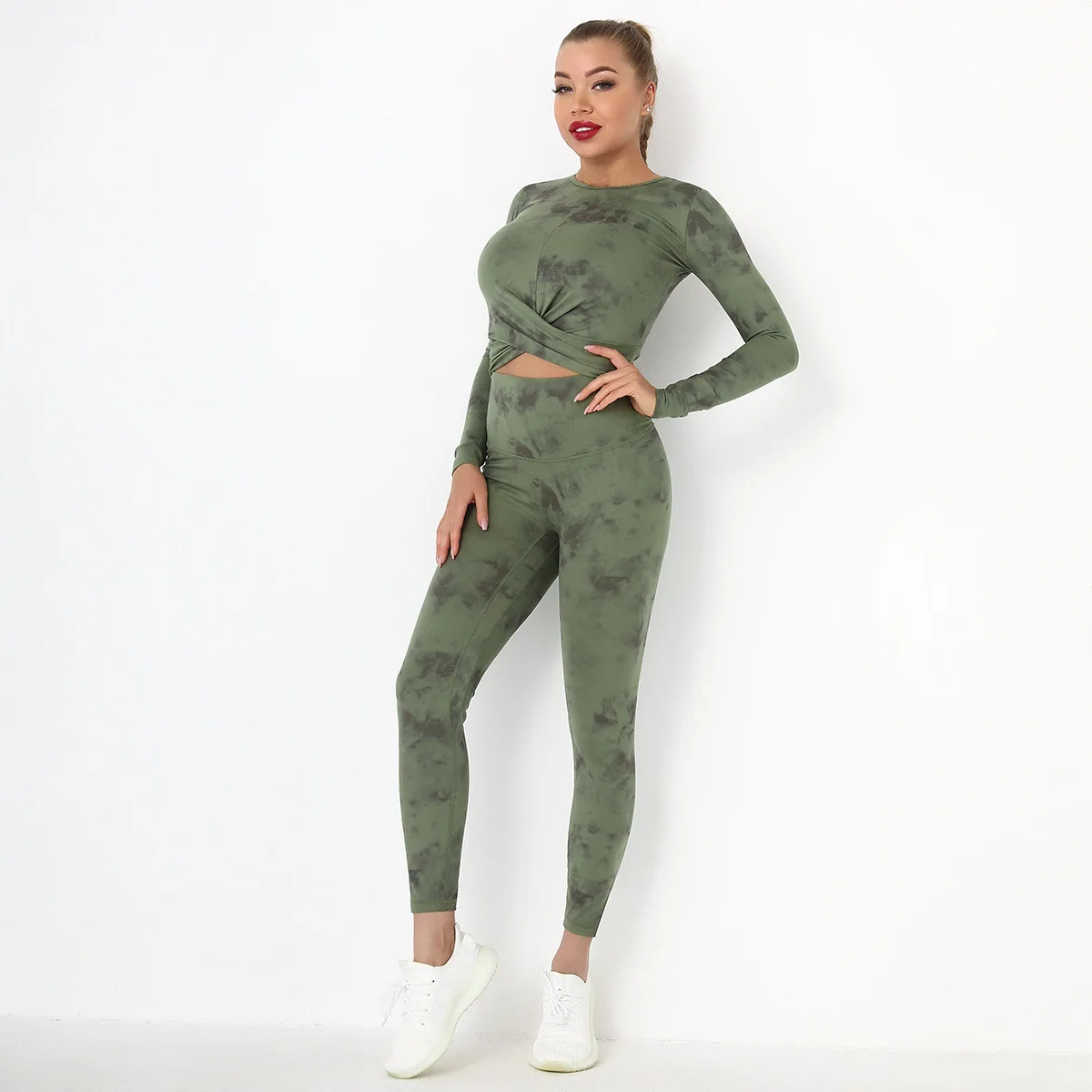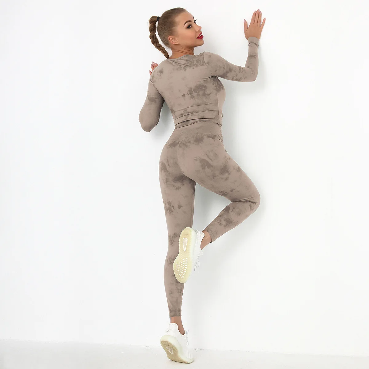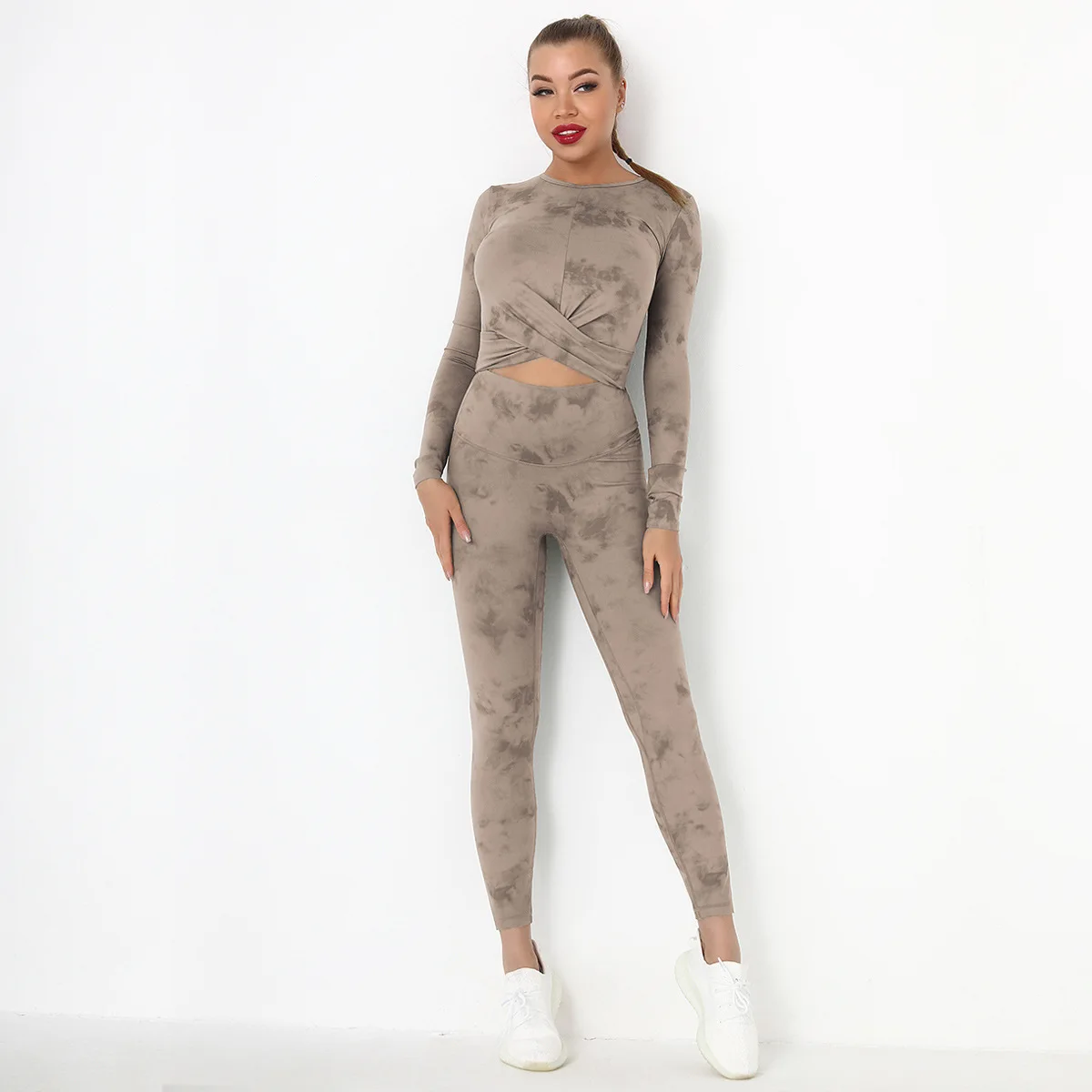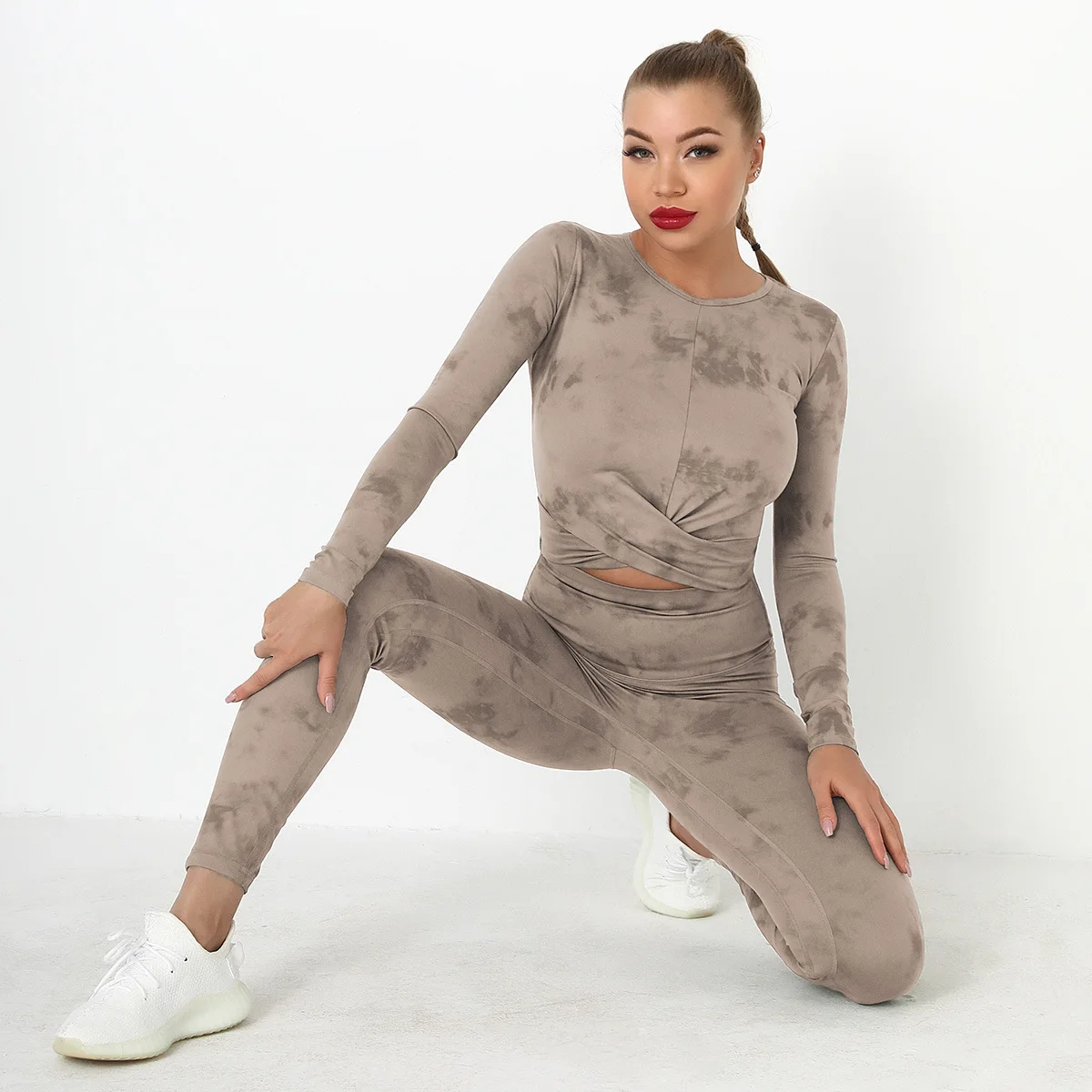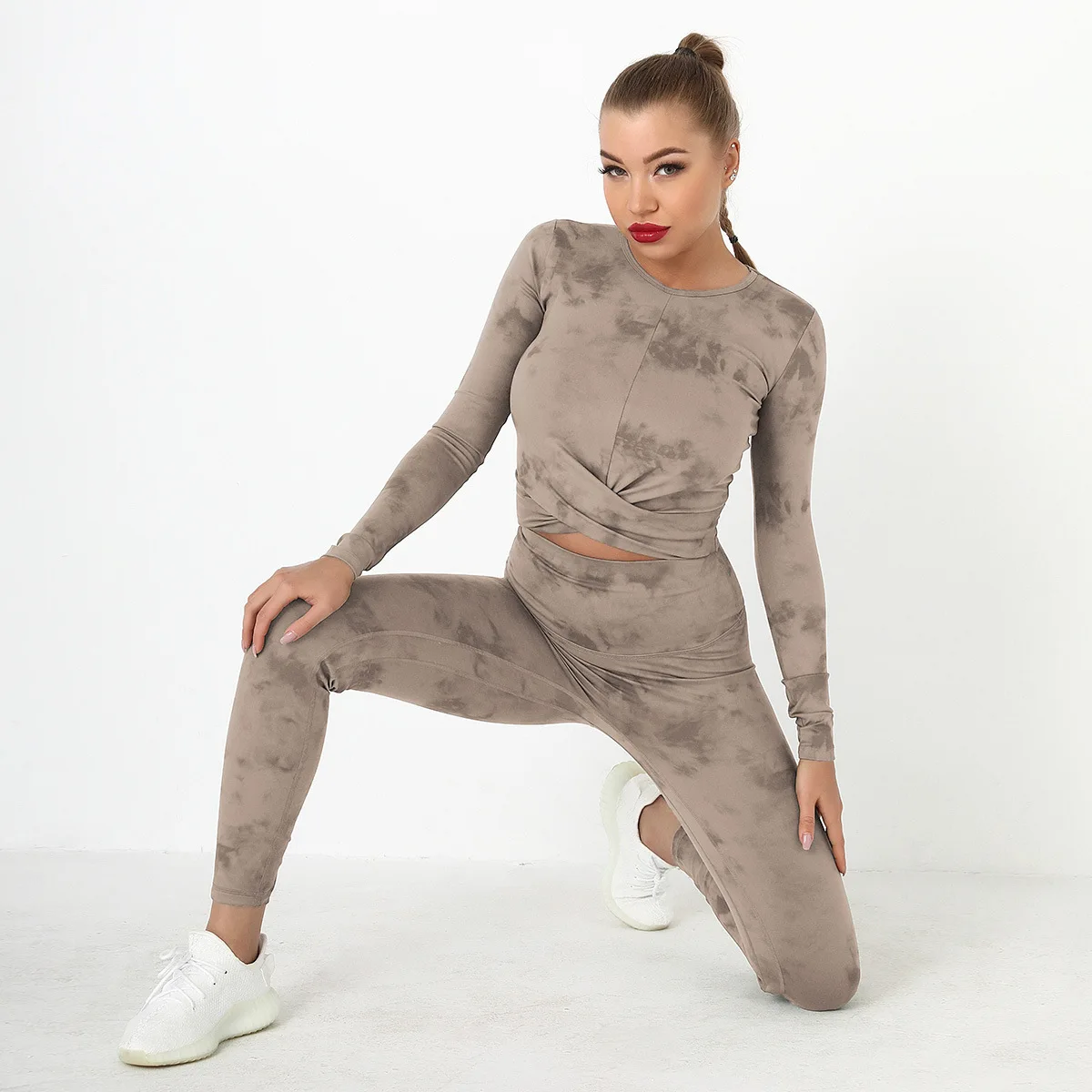 Seamless Tie-Dyed Yoga Set Sports Finesss High Waist Hip Raise Brushed Pants Long Sleeve Suit Workout Gym Leggings Set for Women