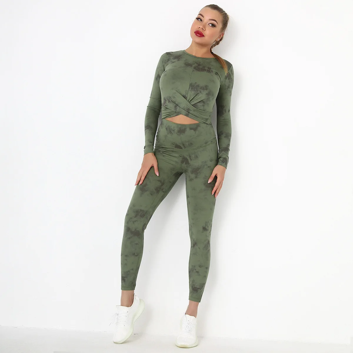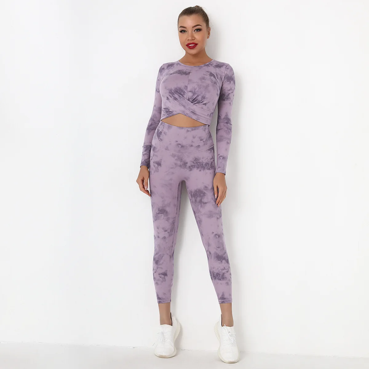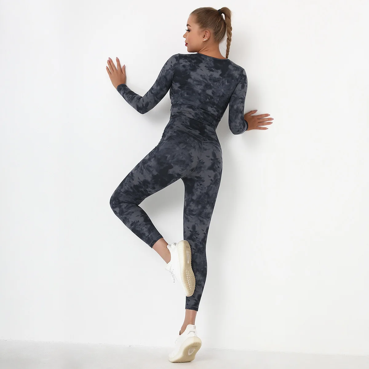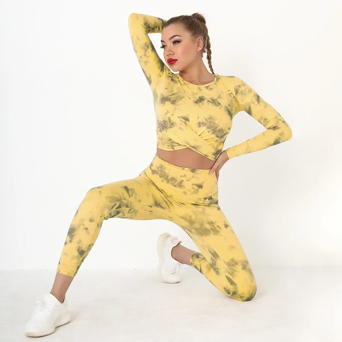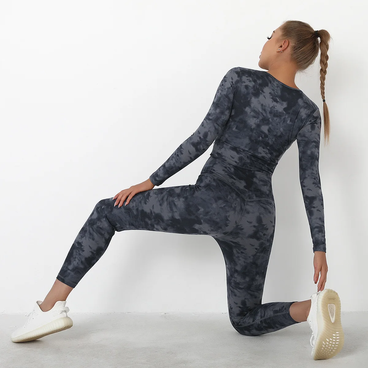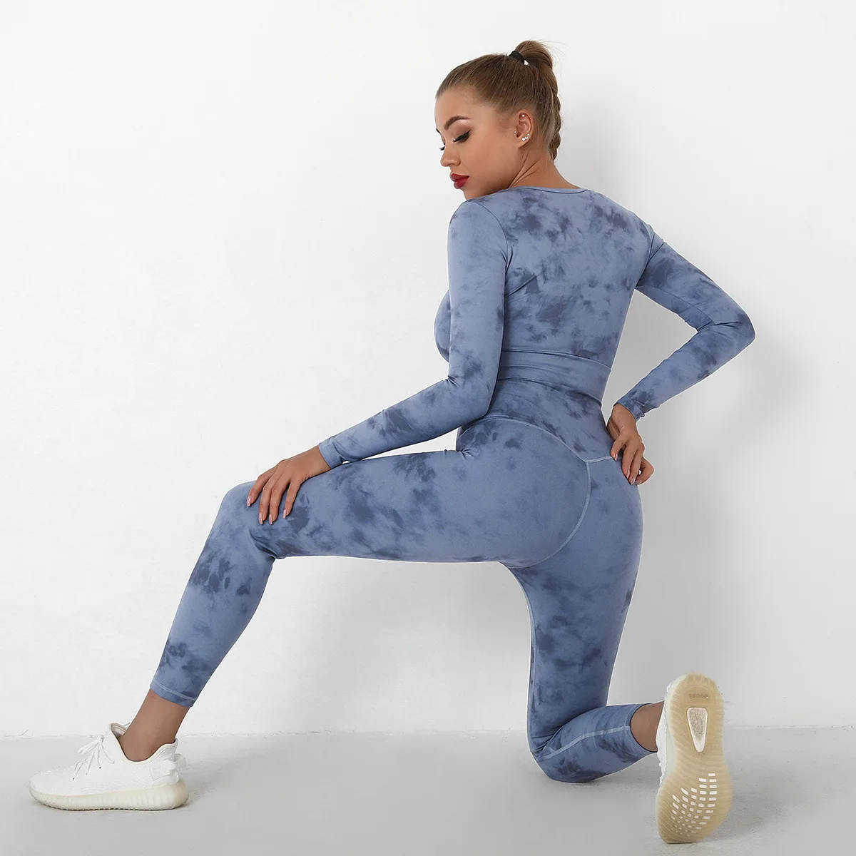 Seamless Tie-Dyed Yoga Set Sports Finesss High Waist Hip Raise Brushed Pants Long Sleeve Suit Workout Gym Leggings Set for Women