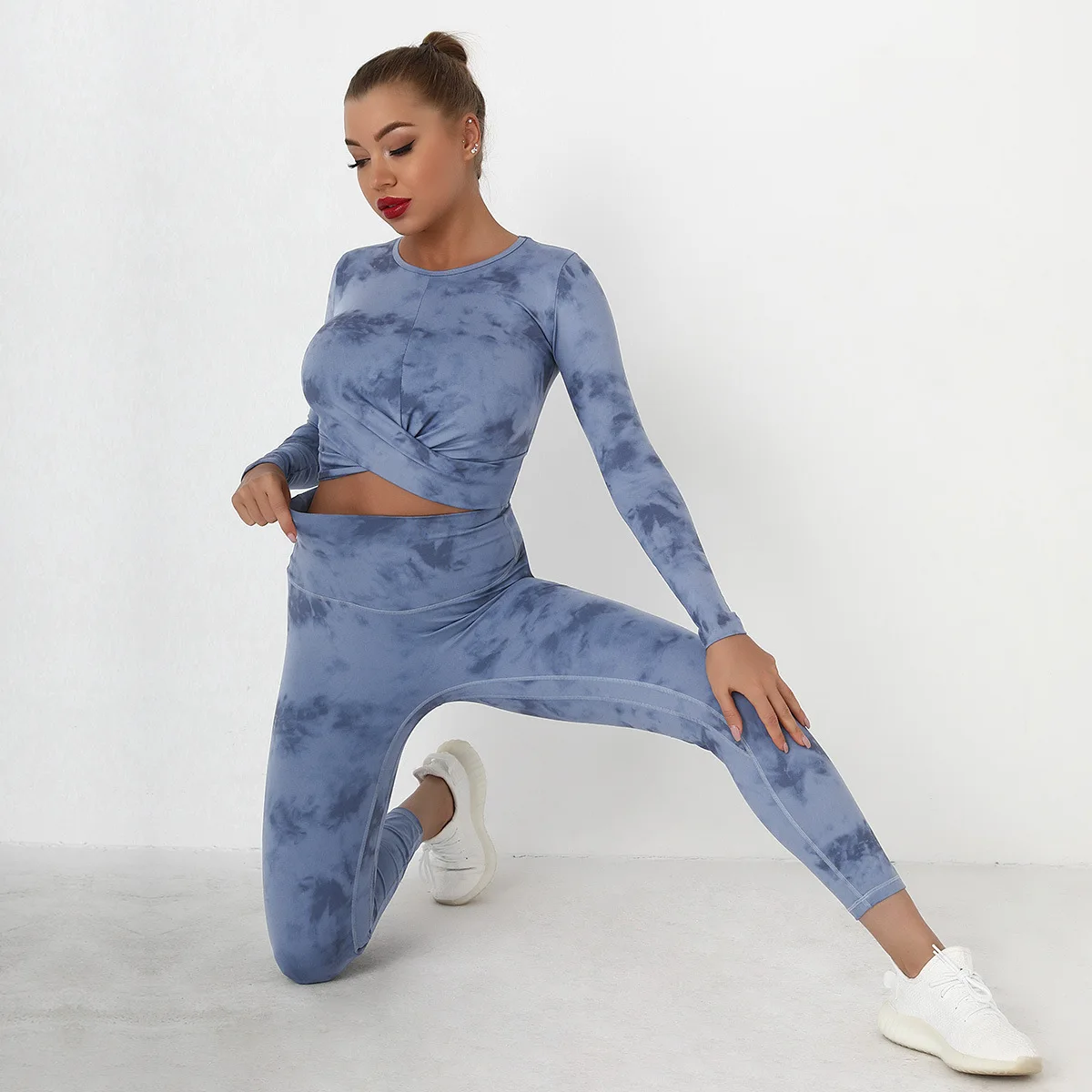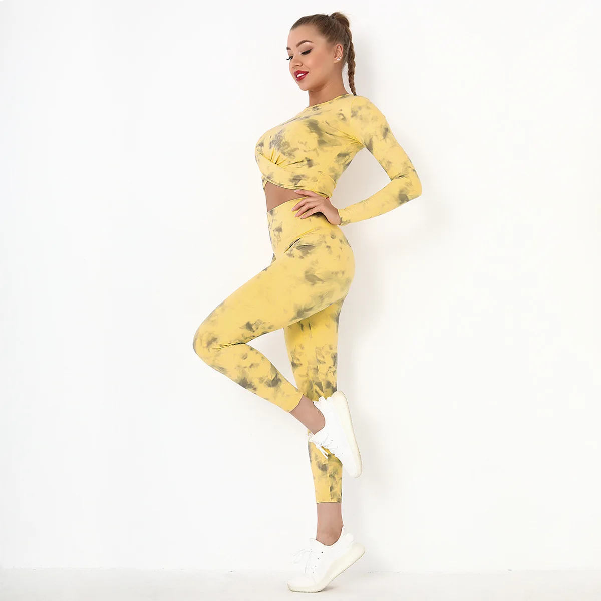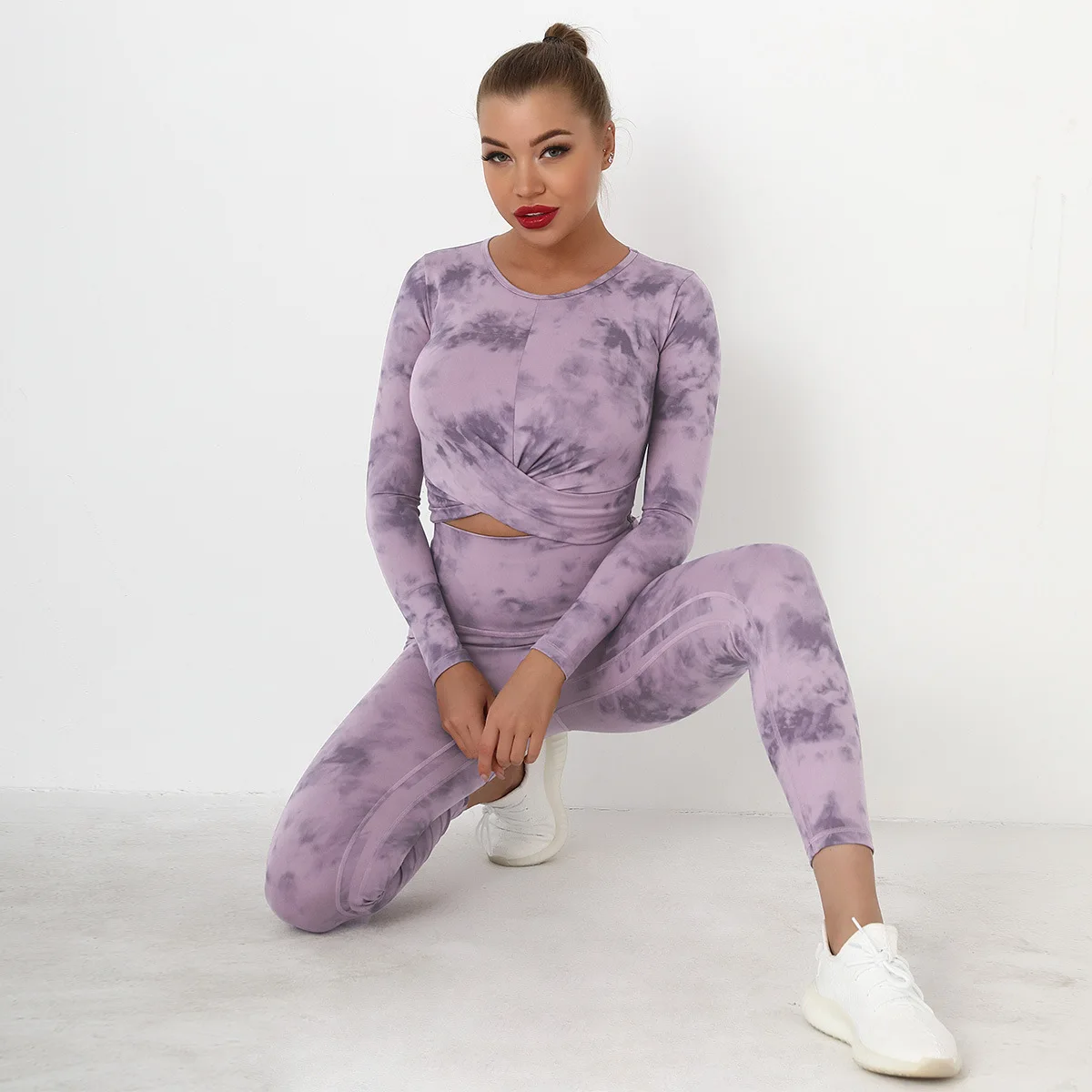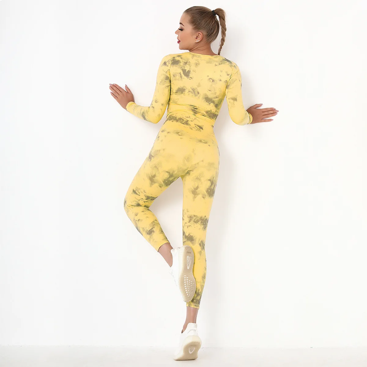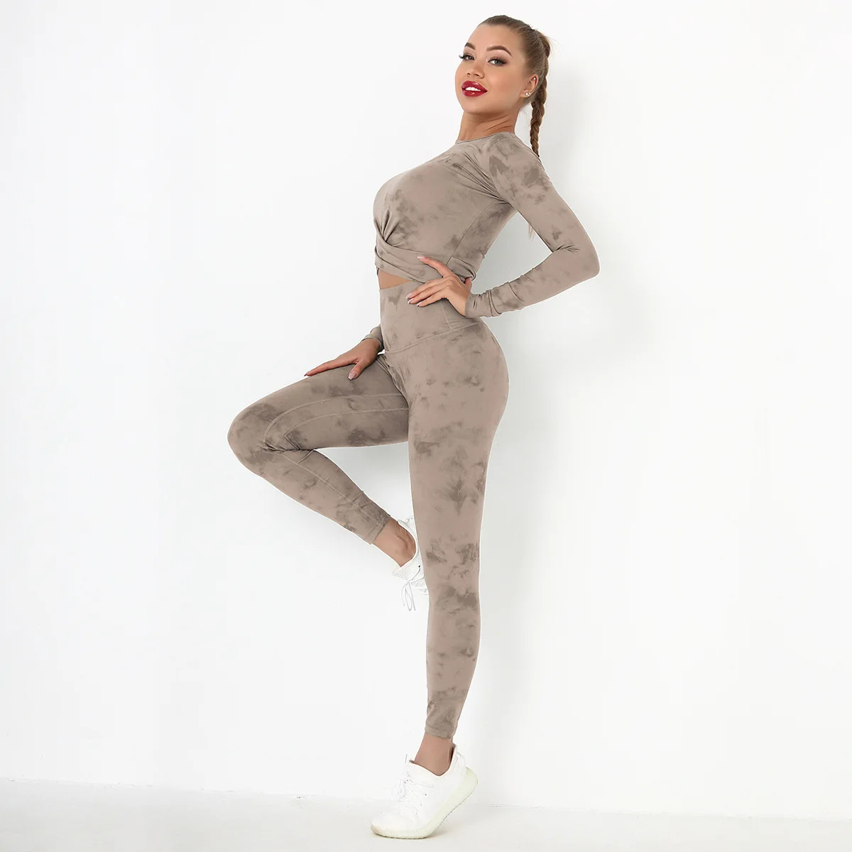 Seamless Tie-Dyed Yoga Set Sports Finesss High Waist Hip Raise Brushed Pants Long Sleeve Suit Workout Gym Leggings Set for Women