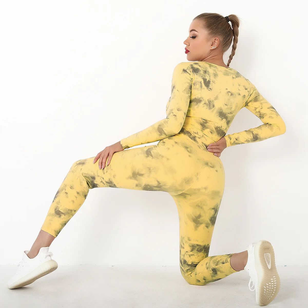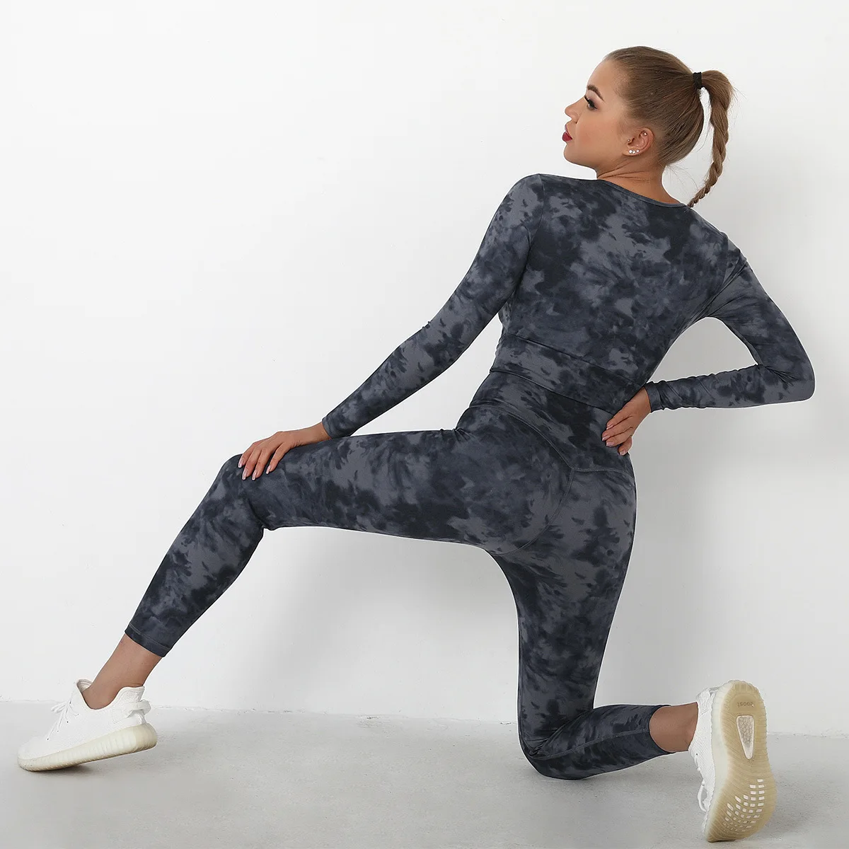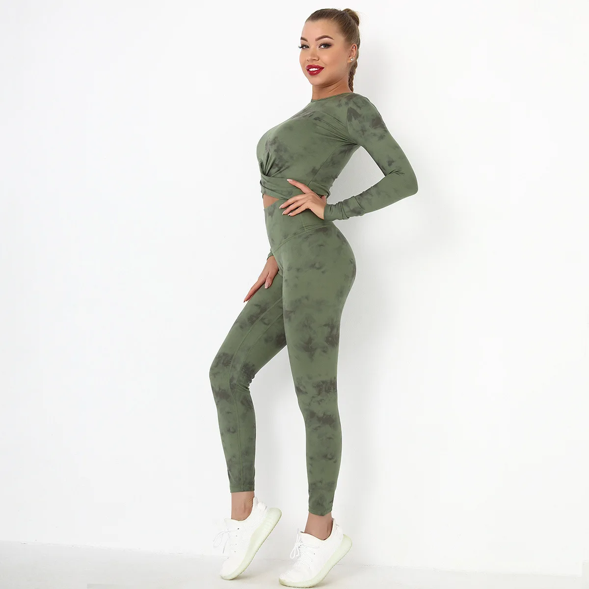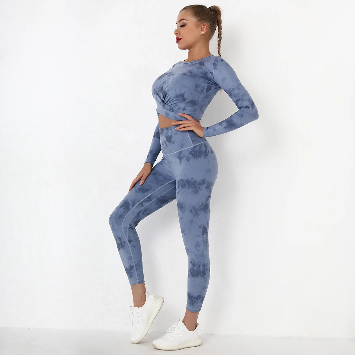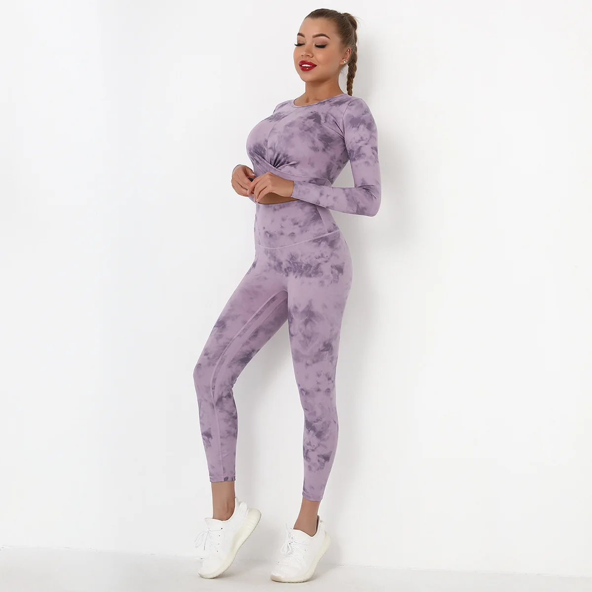 Seamless Tie-Dyed Yoga Set Sports Finesss High Waist Hip Raise Brushed Pants Long Sleeve Suit Workout Gym Leggings Set for Women