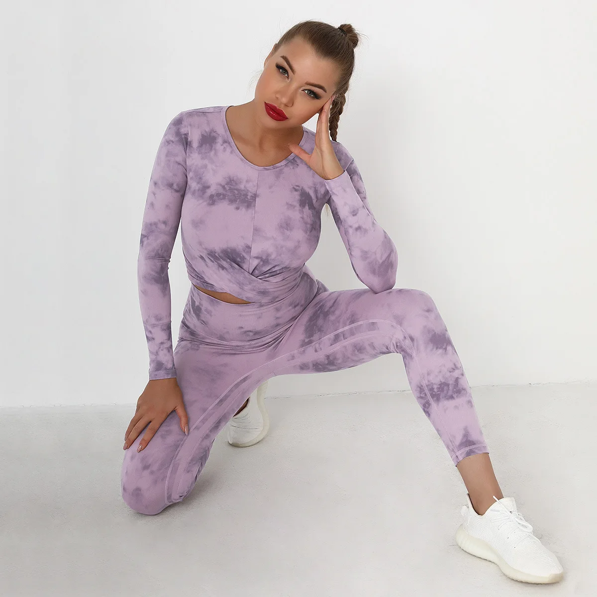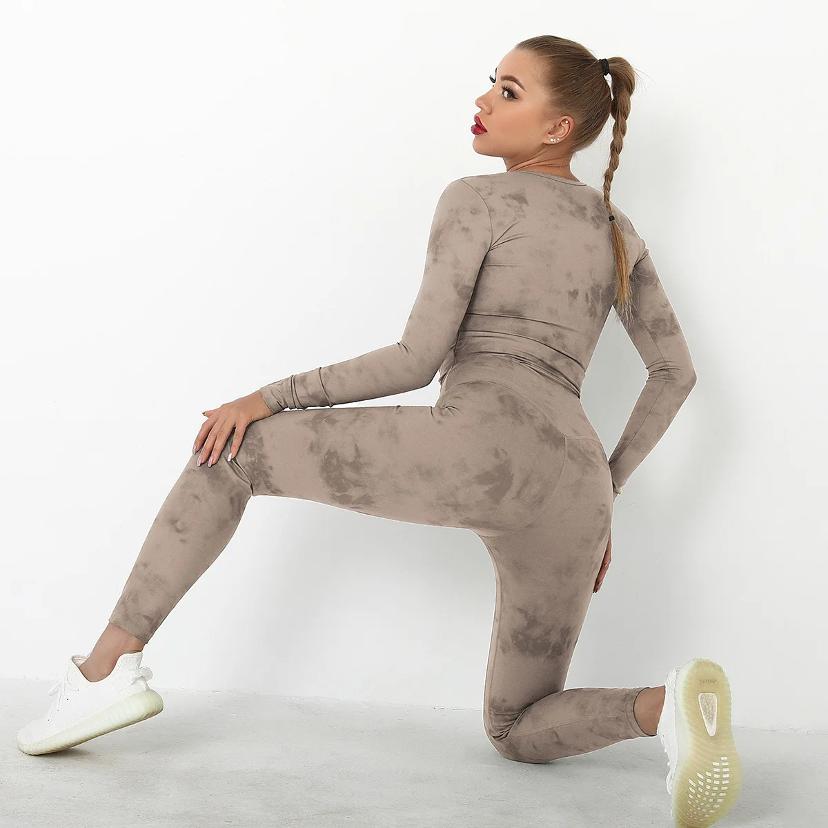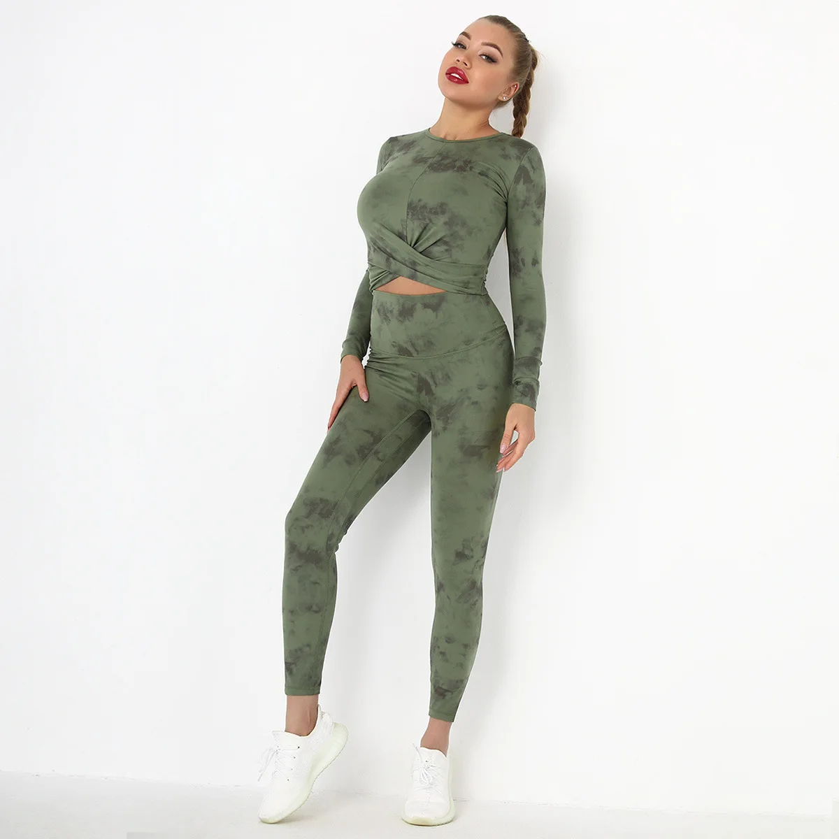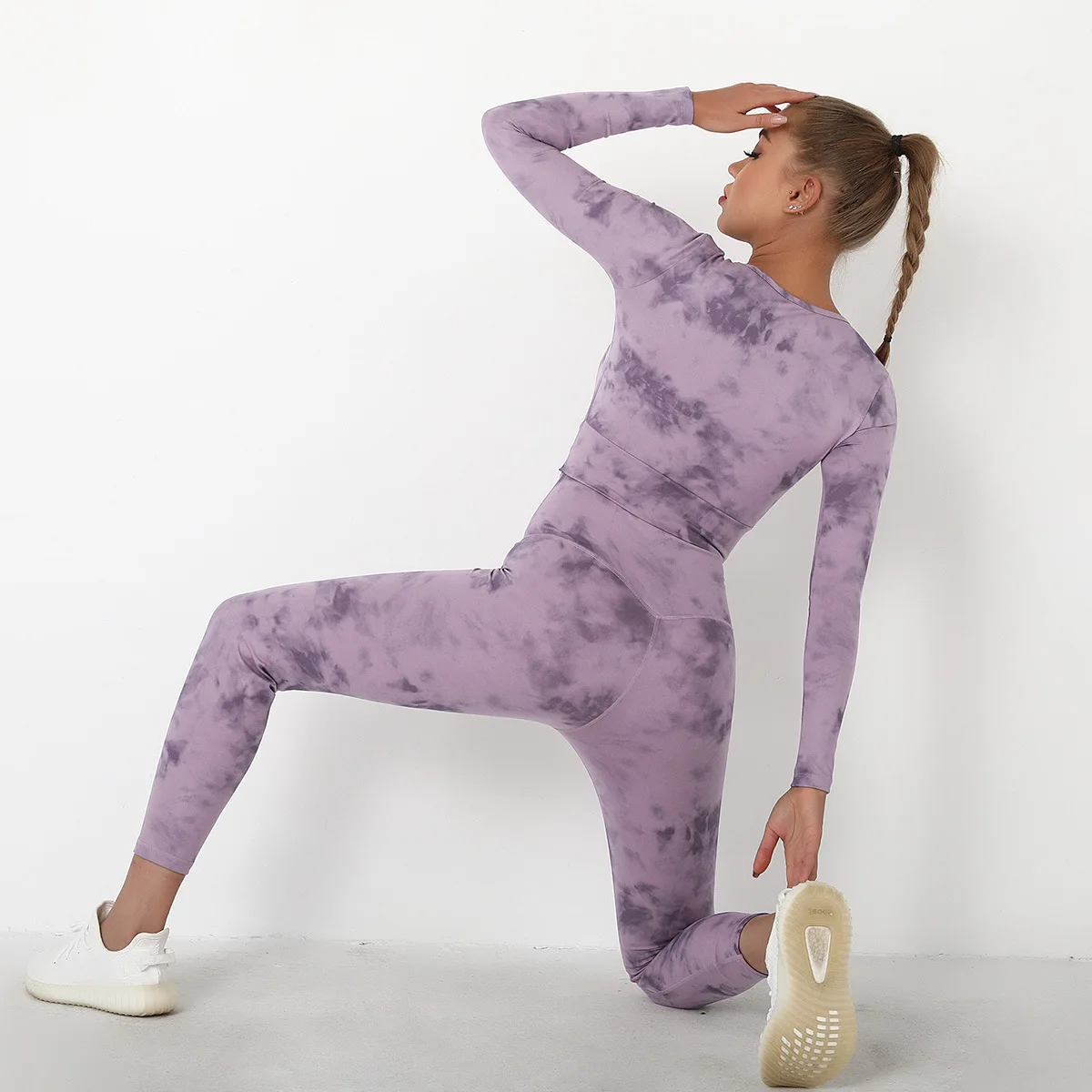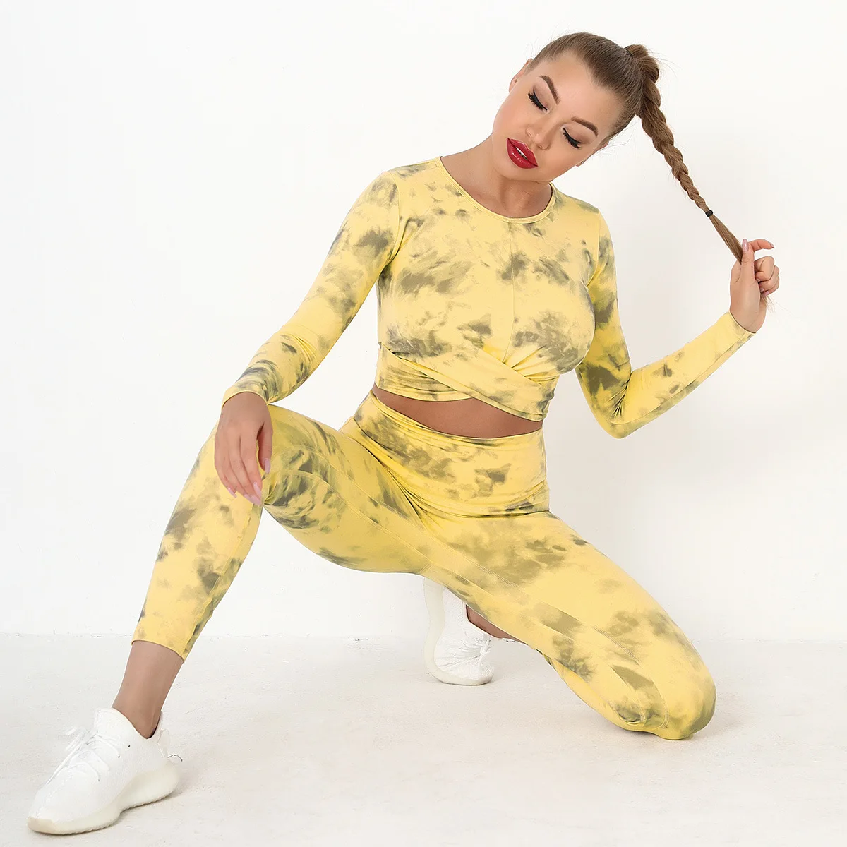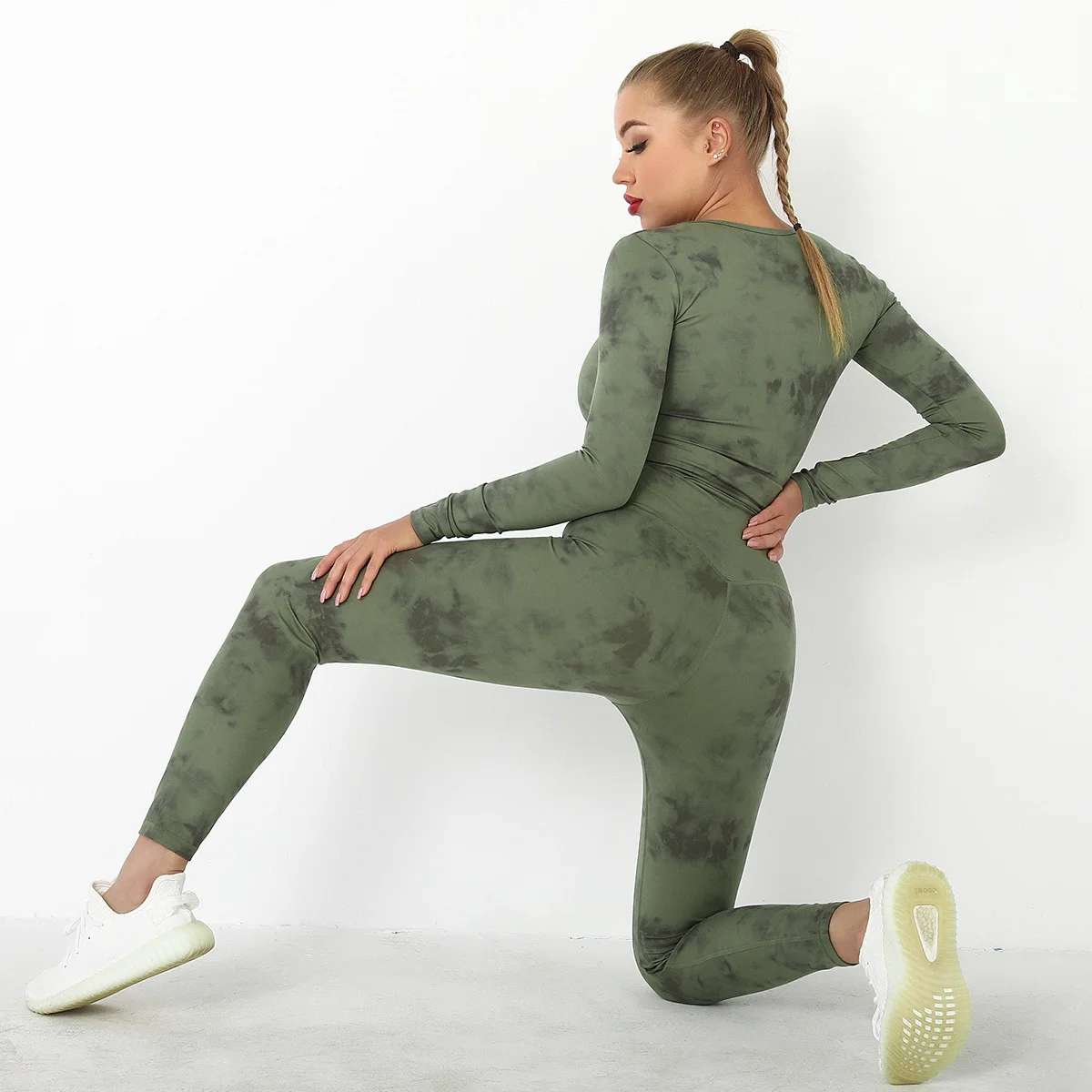 Seamless Tie-Dyed Yoga Set Sports Finesss High Waist Hip Raise Brushed Pants Long Sleeve Suit Workout Gym Leggings Set for Women