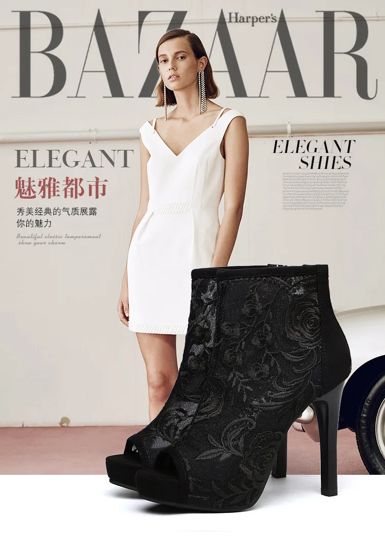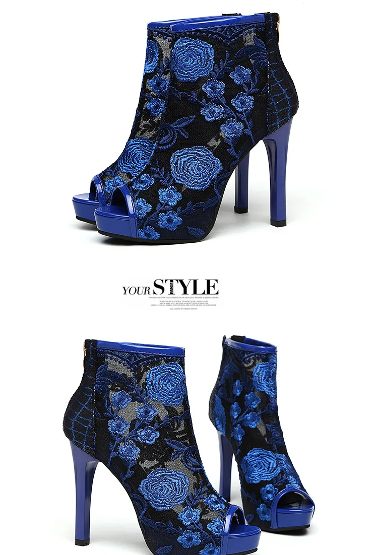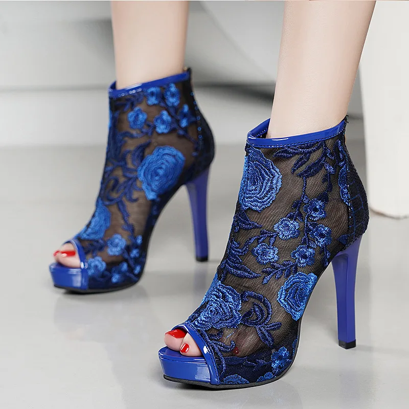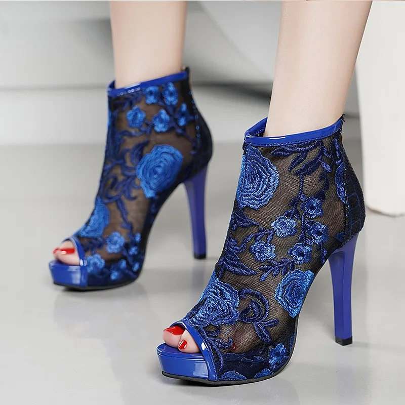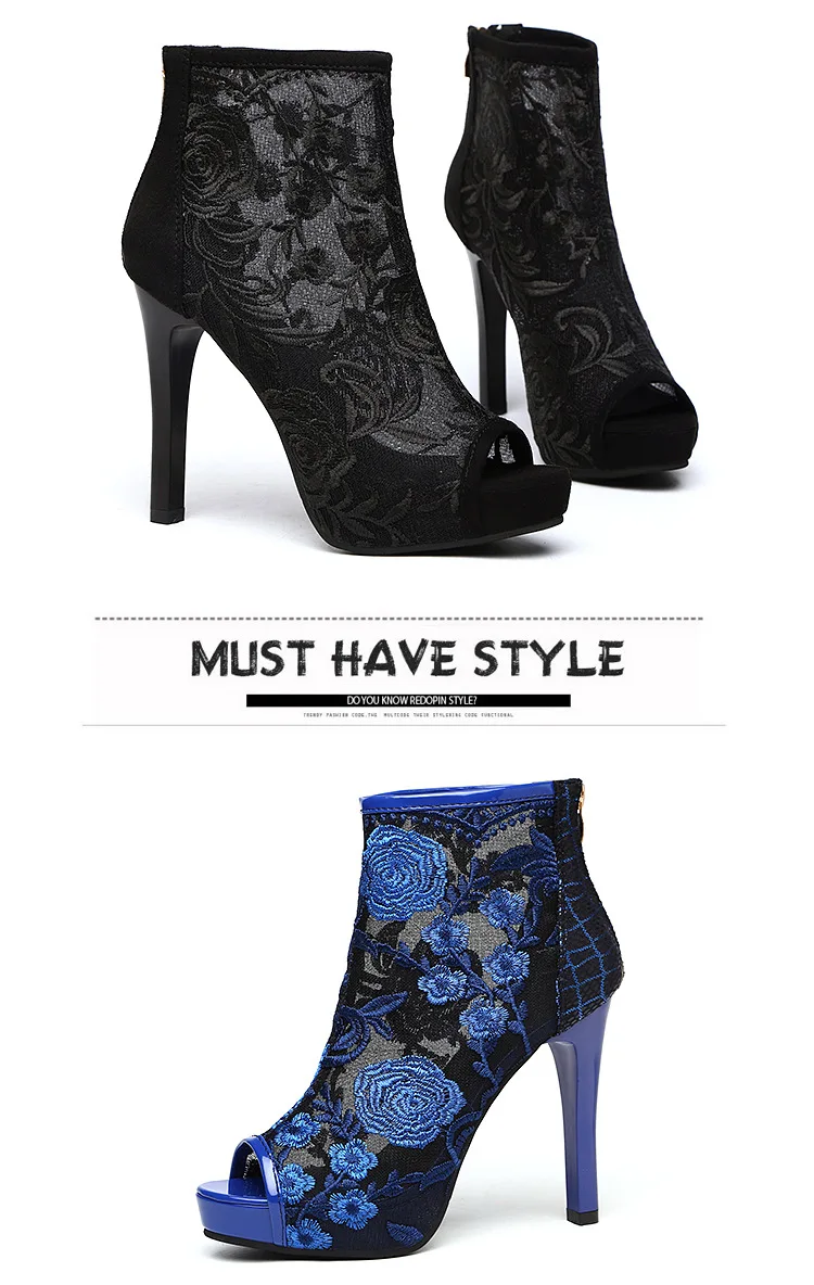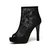 Sexy Fashion Mesh Sandals Boots Woman High Heels Lace Boots Women Summer Shoes Embroidery Flower Peep Toe Black Female