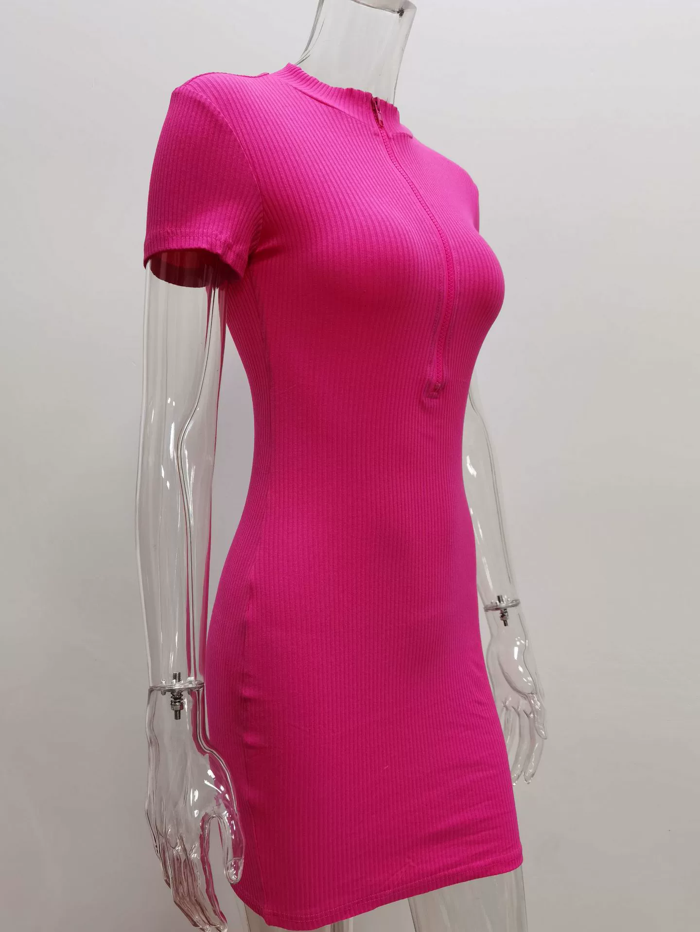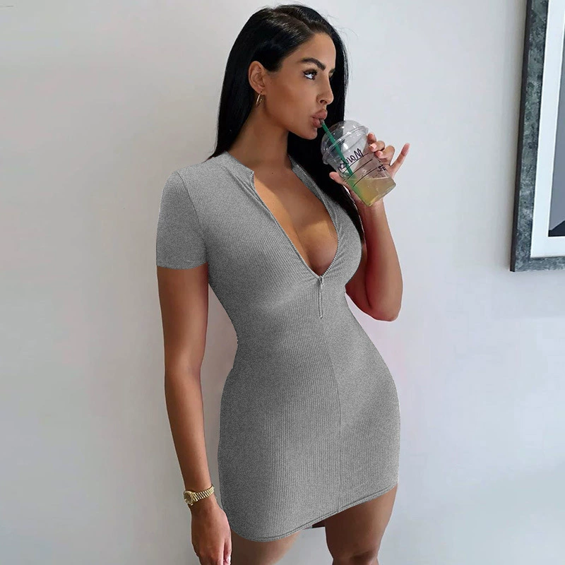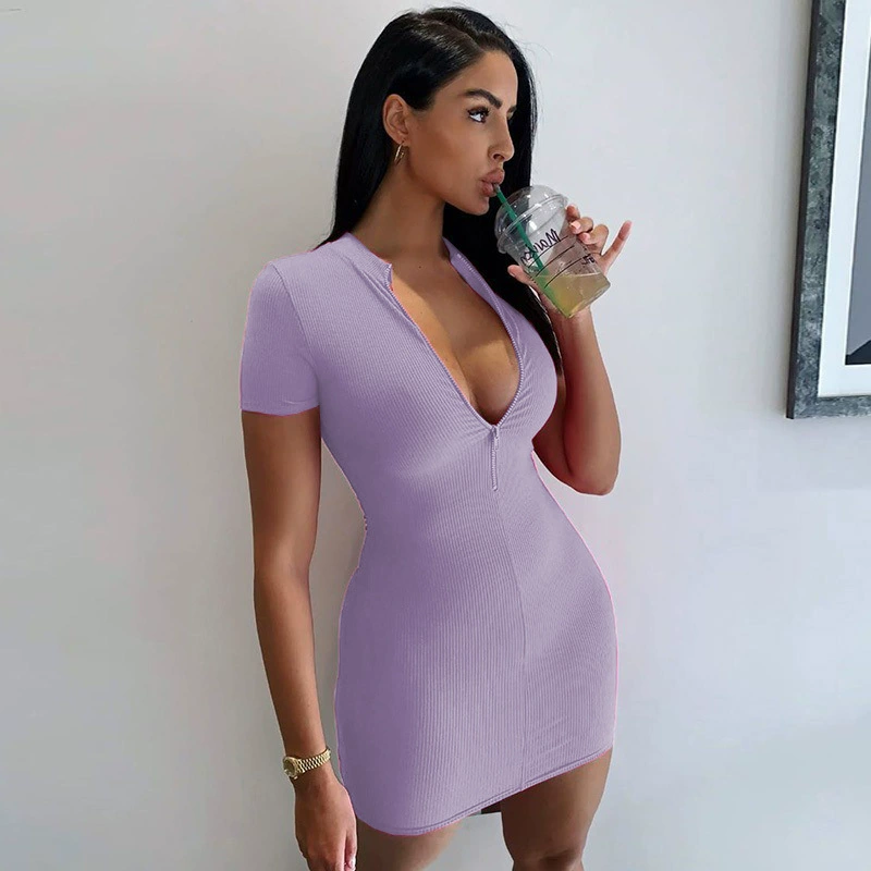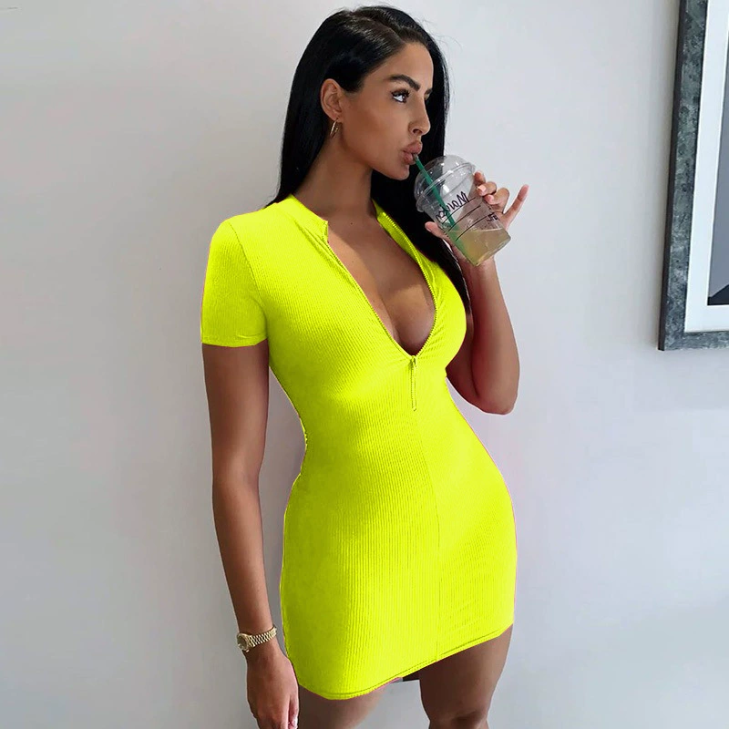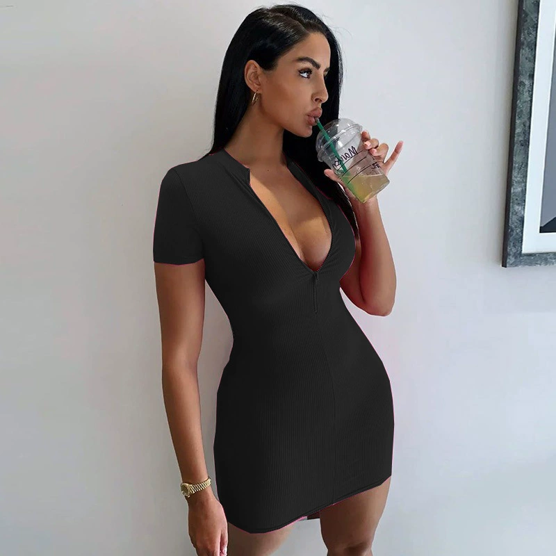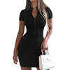 Sexy High Neck Zipper Short Sleeve Hip Mini dress Nightclub Party Tight dresses for women Summer New Ladies Elegant Short Skirt