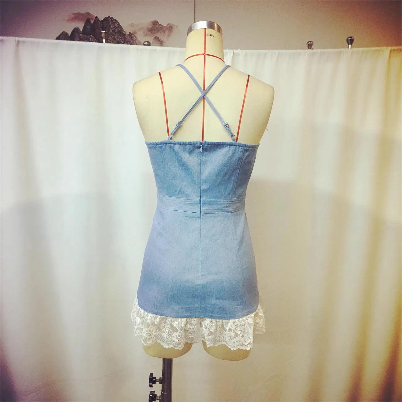 Sexy Lace Denim Sleeveless Suspender Patchwork Dress High Waist Mini Dress Lace-up Ruffled Denim Elegant A-Line Party Dresses