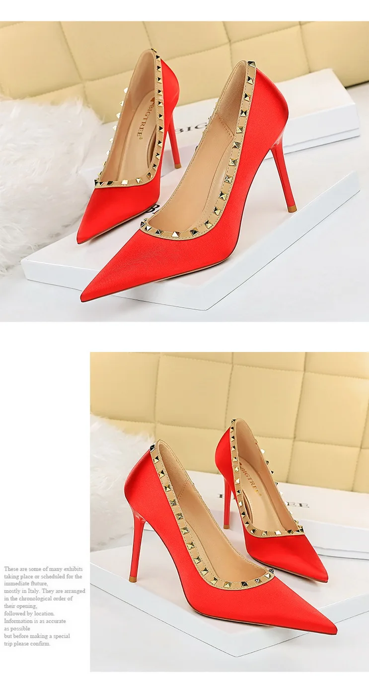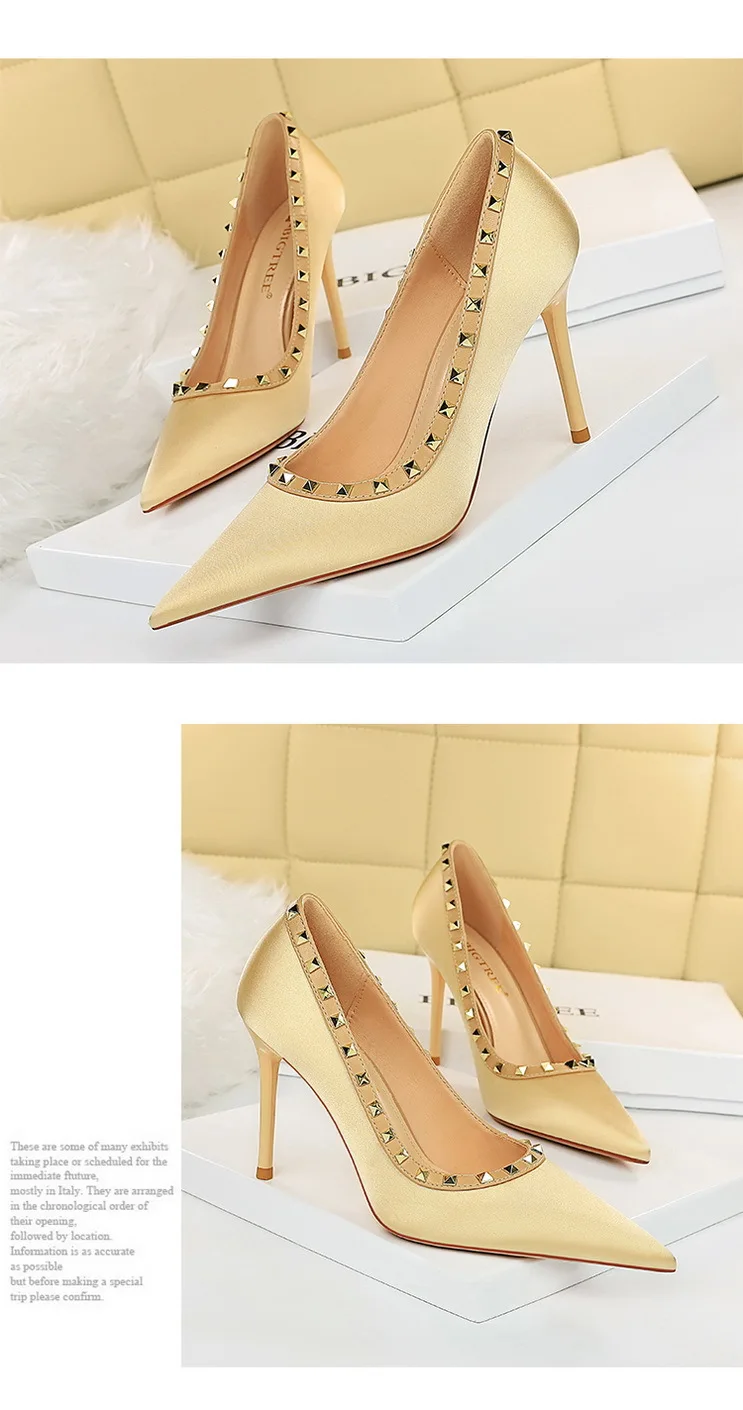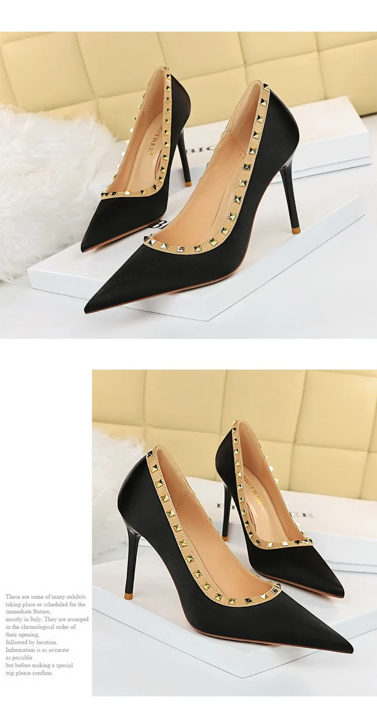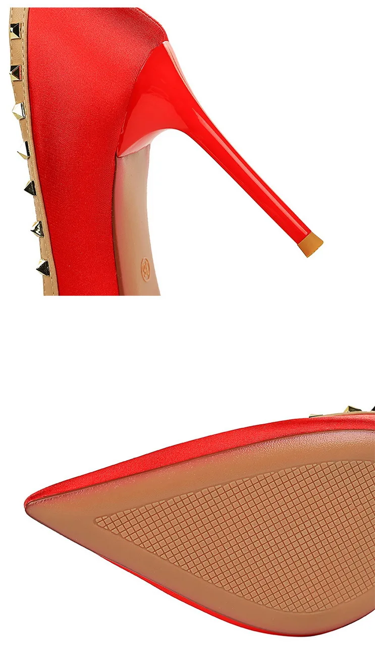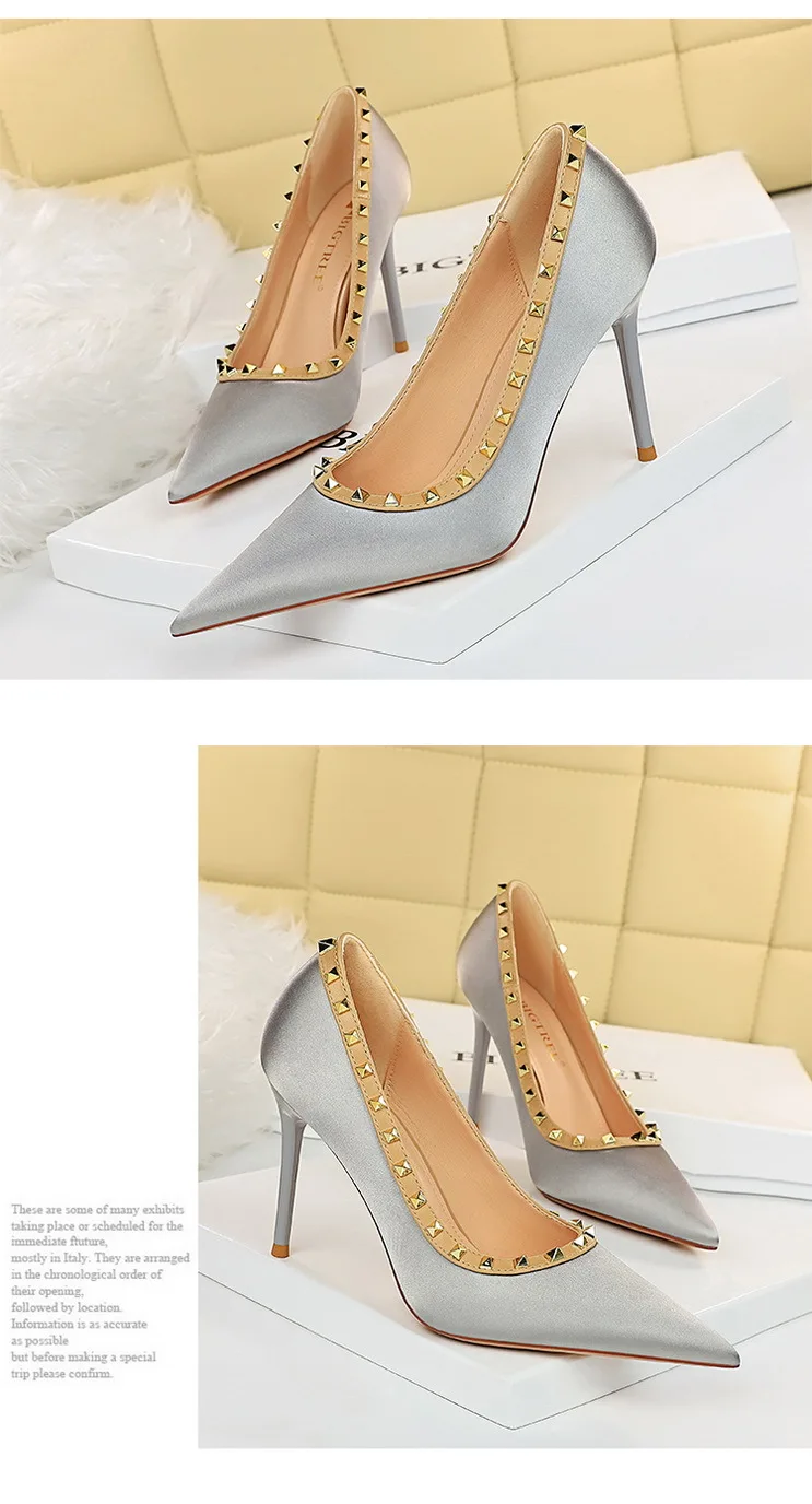 Sexy Nightclub High-heeled Shoes Stiletto High-heeled Satin Shallow Mouth Pointed Metal Rivet Single Shoes Luxury Shoes