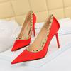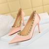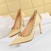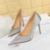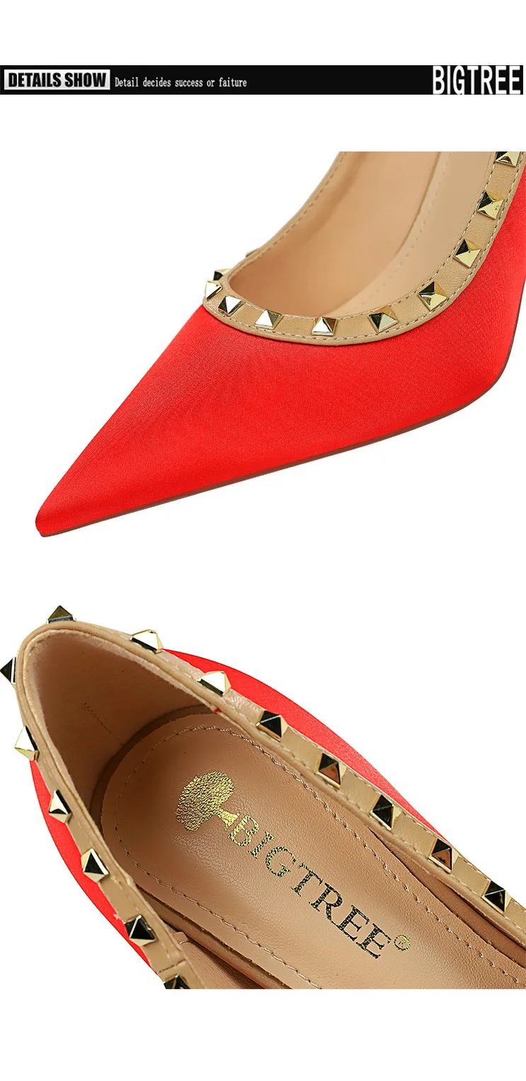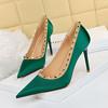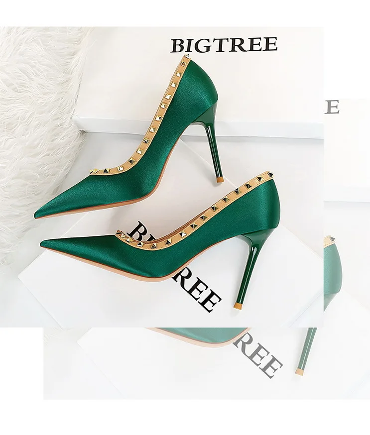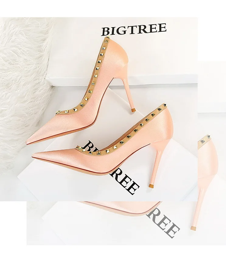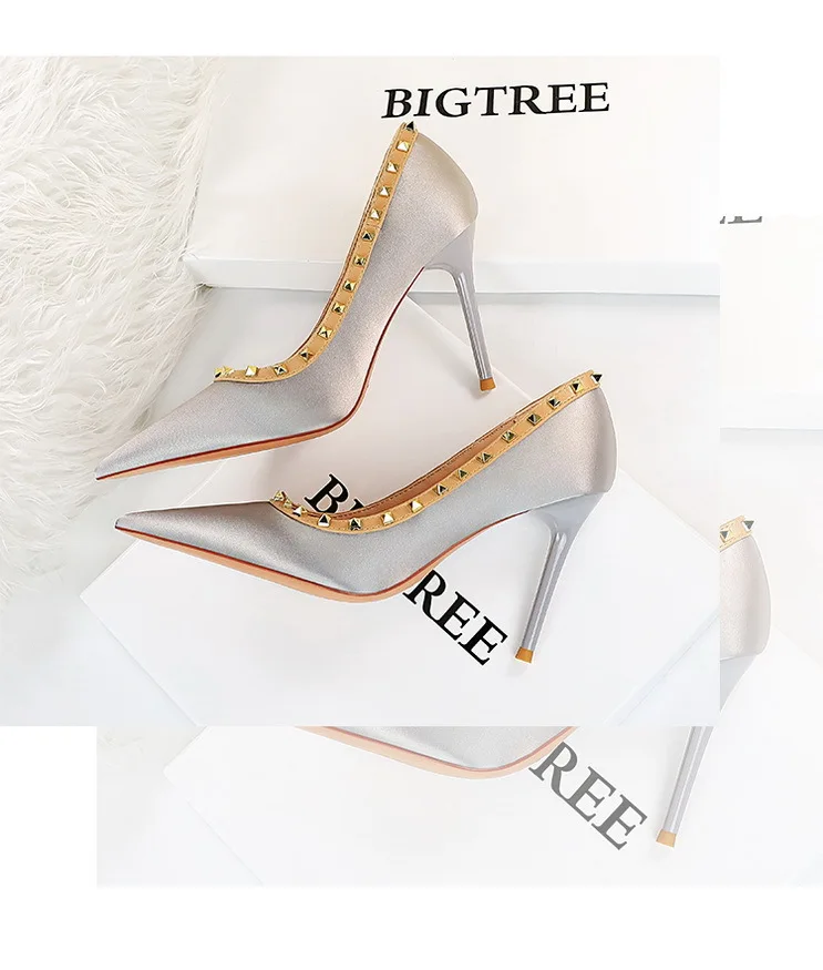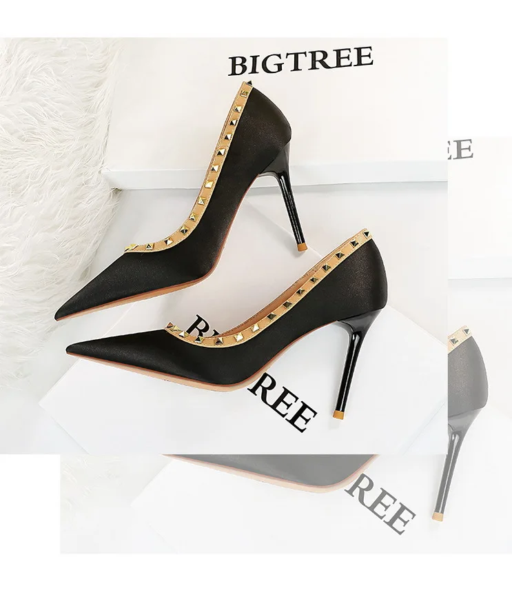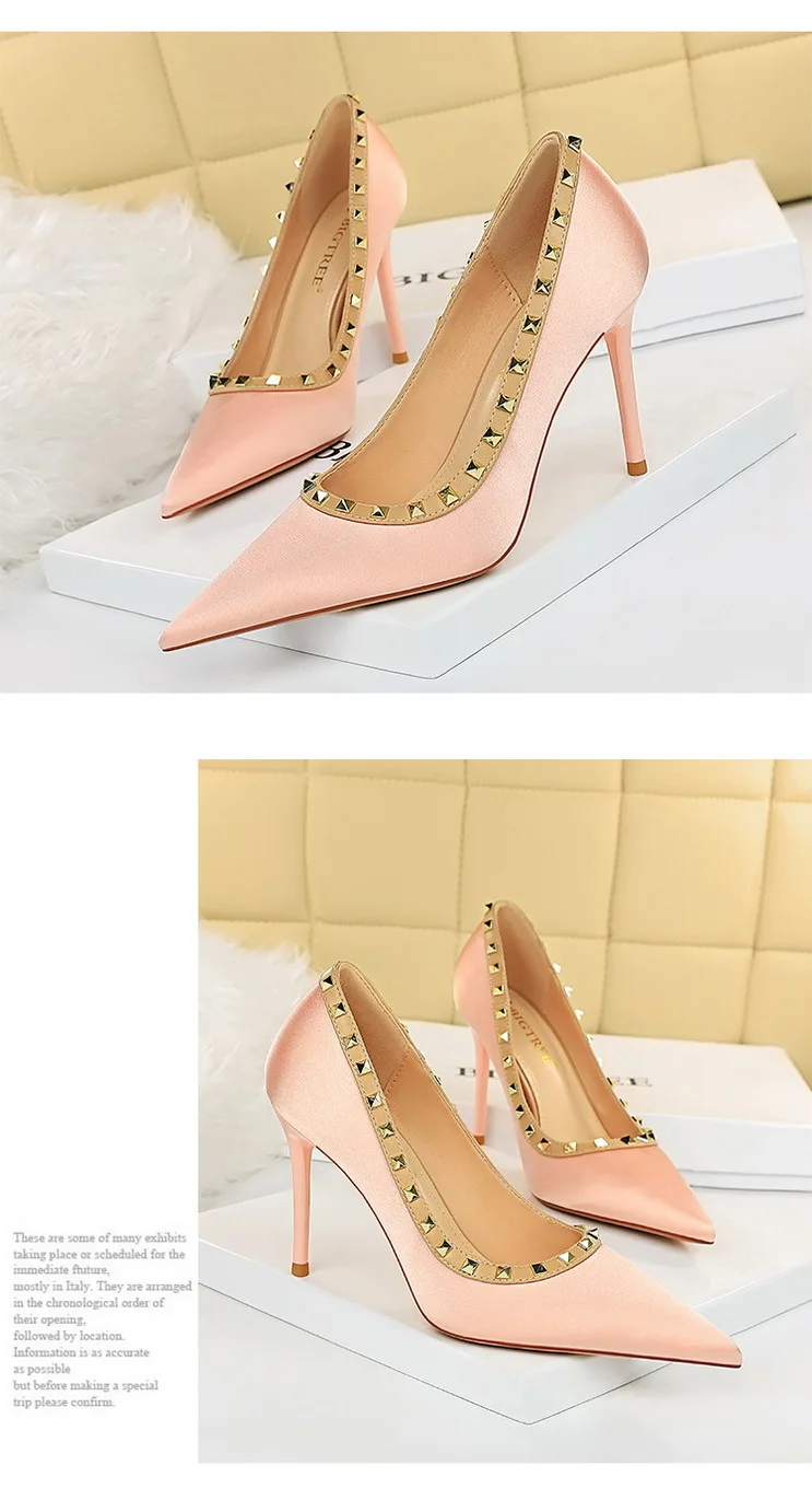 Sexy Nightclub High-heeled Shoes Stiletto High-heeled Satin Shallow Mouth Pointed Metal Rivet Single Shoes Luxury Shoes