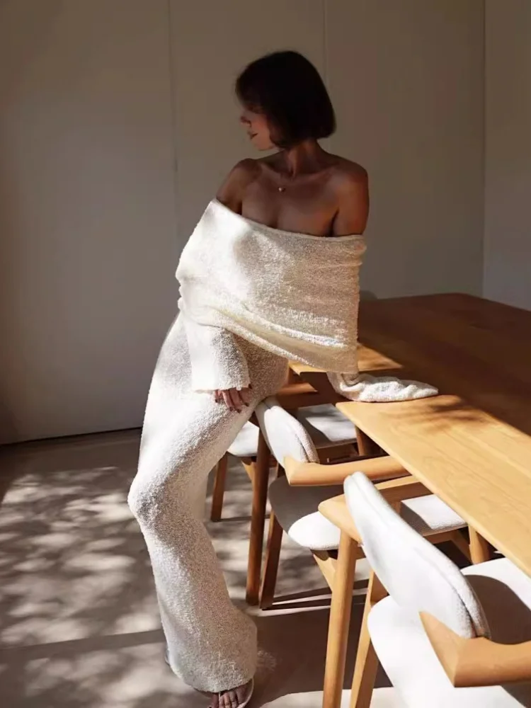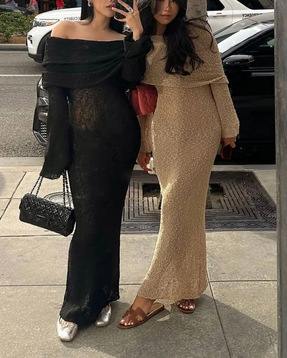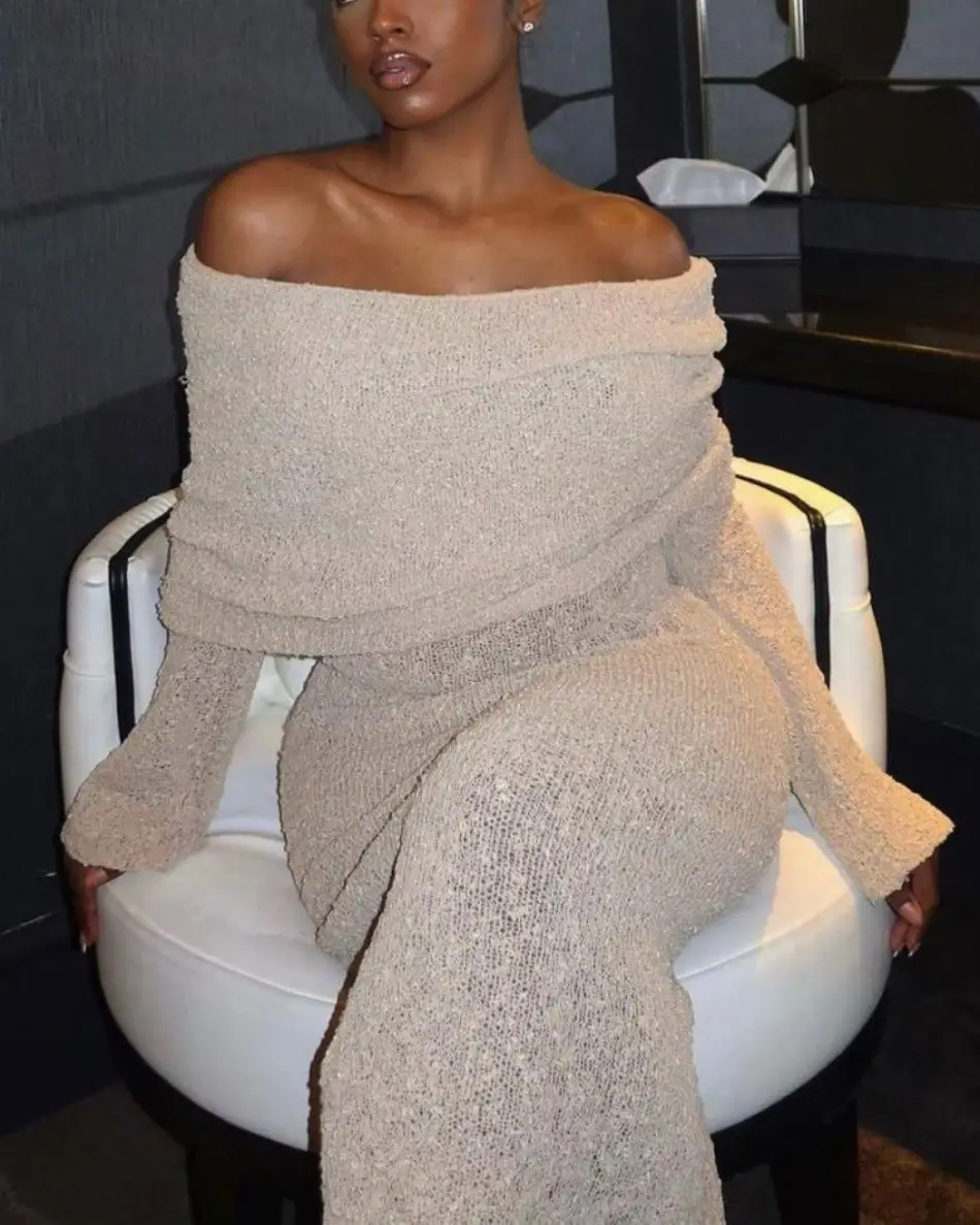 Sexy Off Shoulder Women Knitted Dress Vintage Long Sleeve White Dress for Women 2024 Spring Summer Elegant Long Dress
