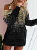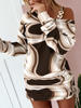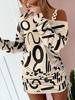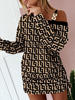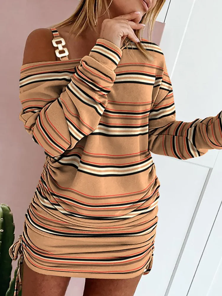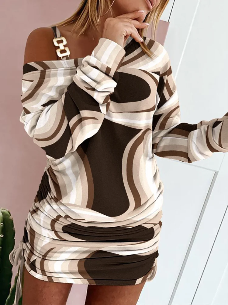 Sexy Pattern Print Off Shoulder Dress Elegant Diagonal Collar Chain Pleated Mini Dress New Autumn Drawstring Long Sleeve Dresses