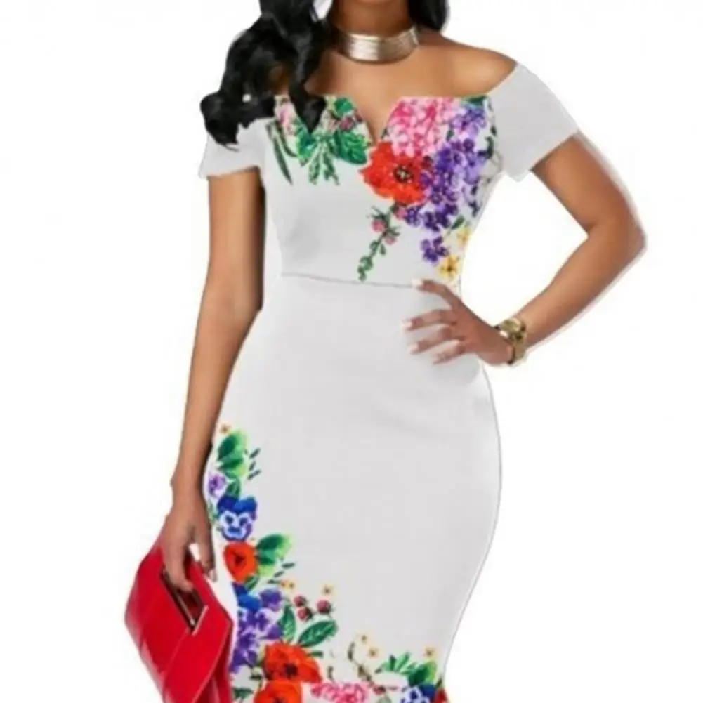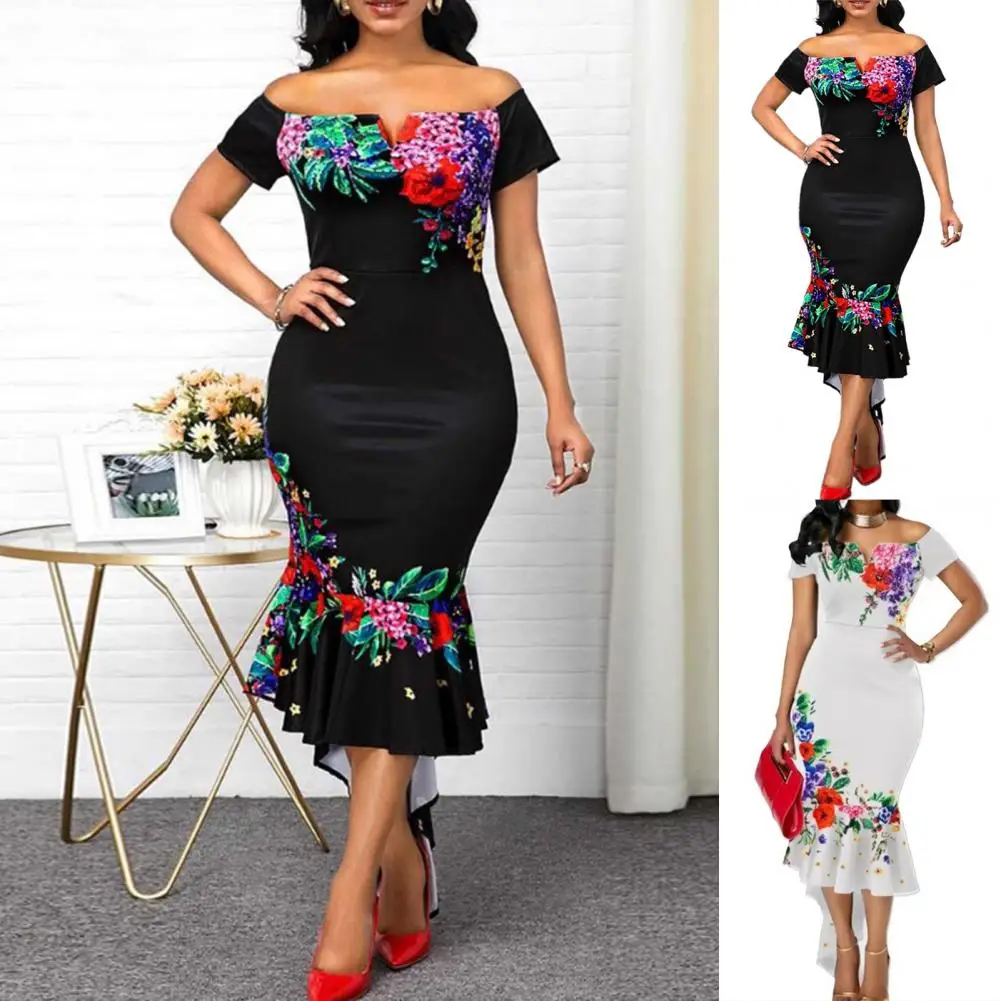 Sexy Slim Dress Women Fashion Slash-neck Short Sleeve Lrregular Ladies Party Dresses Vintage Floral Printed Elegant Mini Dress