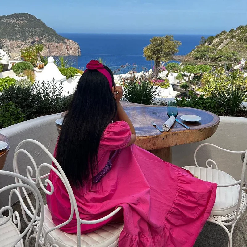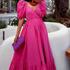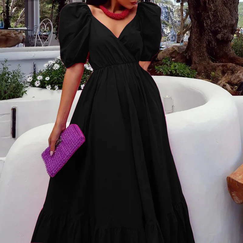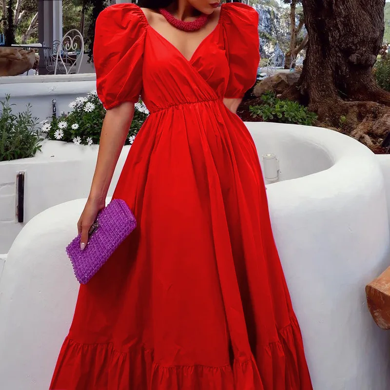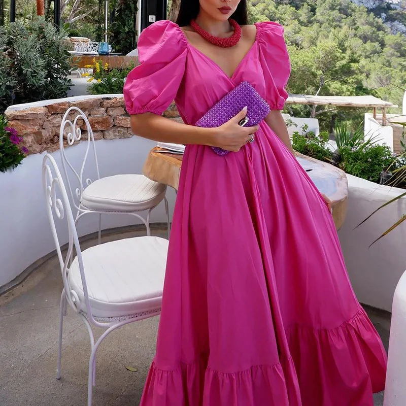 Sexy Solid Deep V Neck Beach Sundress For Women Summer New Fashion Puff Sleeve A-line Party Dresses Elegant Ladies Maxi Vestidos