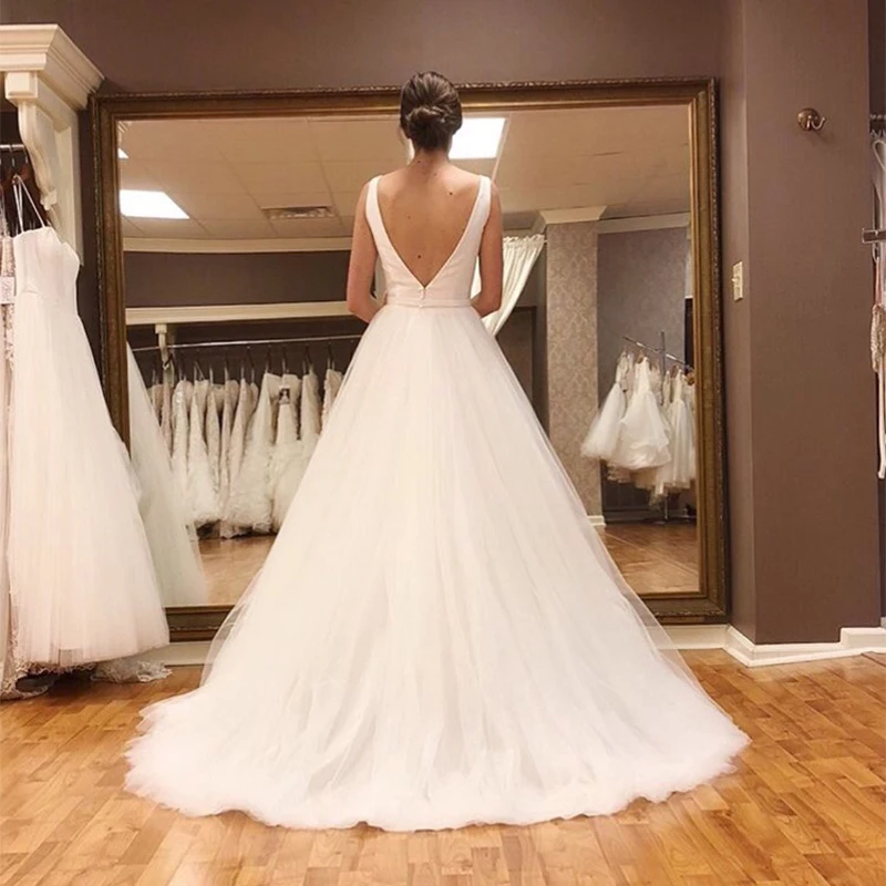 Sexy V-neck A-Line Wedding Dresses 2020 Vestido Noiva Praia Simple White Ivory Tulle Casamento Sashes Bridal Gown robe de mariée