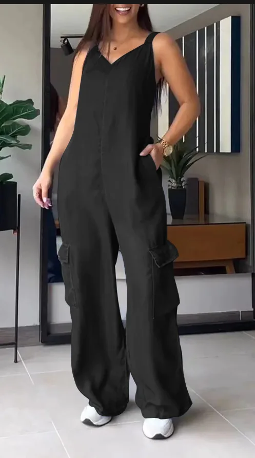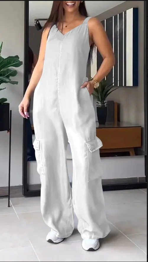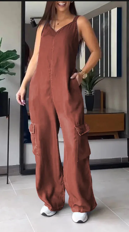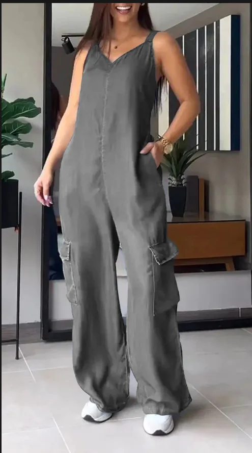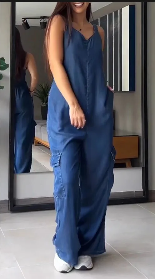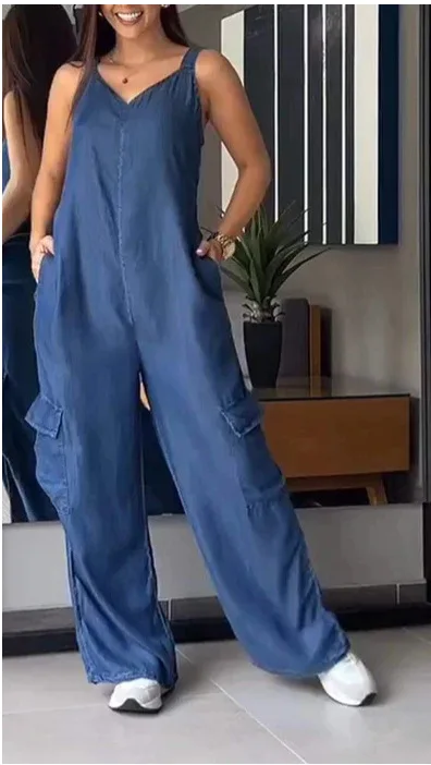 Sexy V Neck Denim Blue Jumpsuit Women summer Pocket Straight Pant Playsuit Romper Loose High Waist Backless Strap Overalls