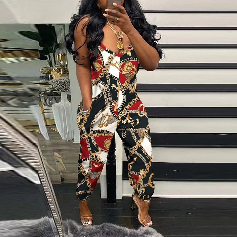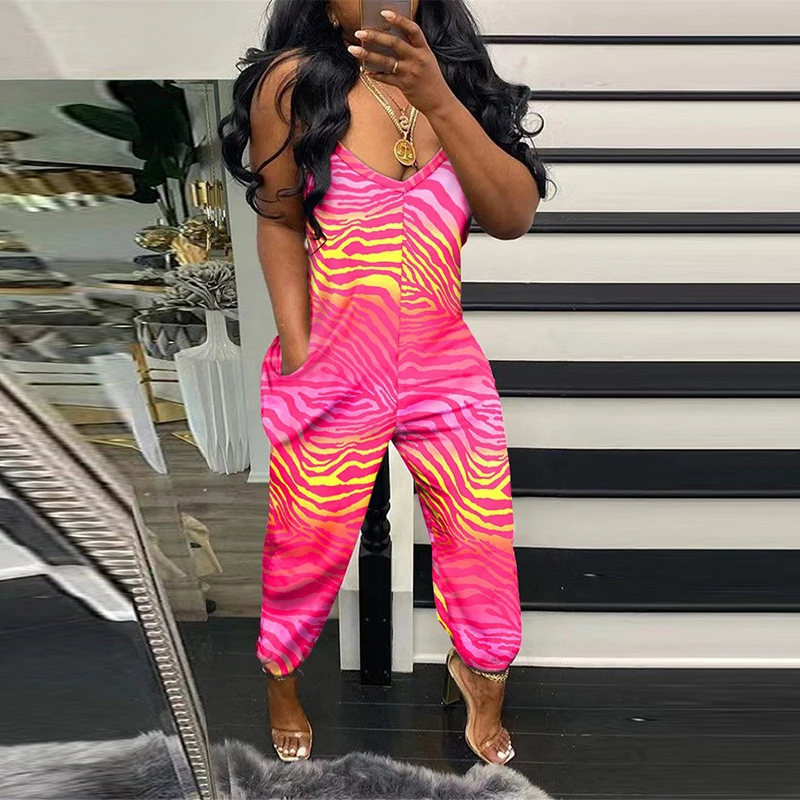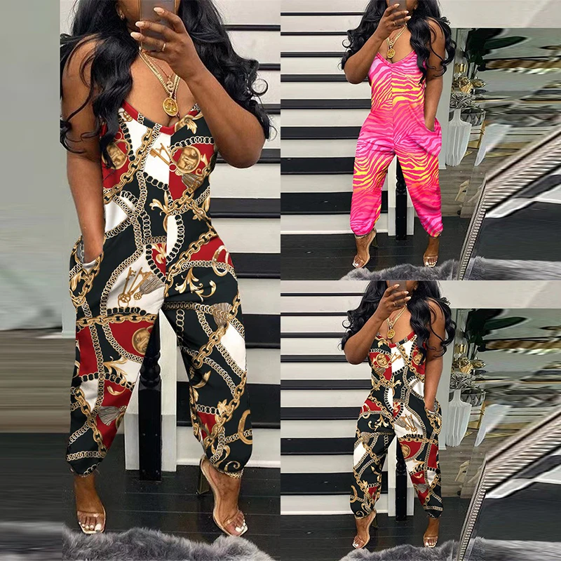 Sexy Women Deep V-neck Sleeveless Boho Rompers Summer Fashion Printing Pocket Long Jumpsuits Ladies Casual Loose Streetwears