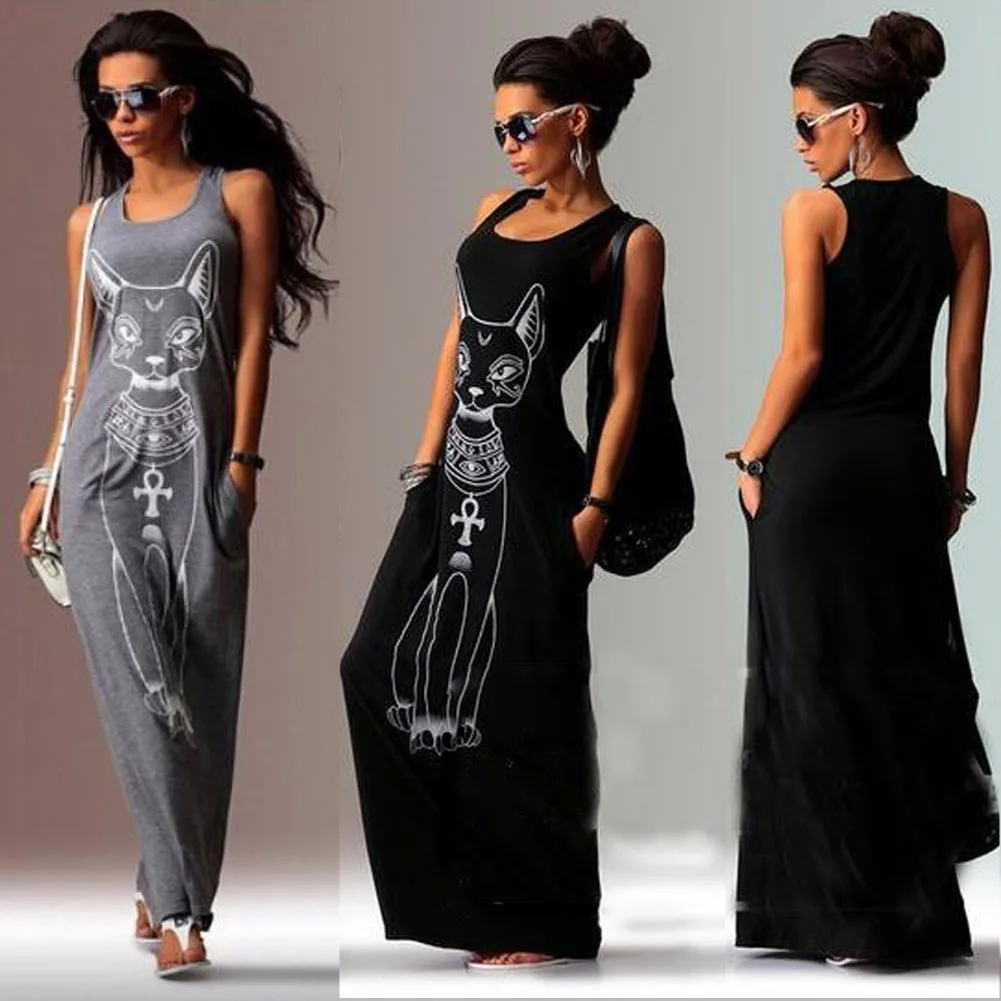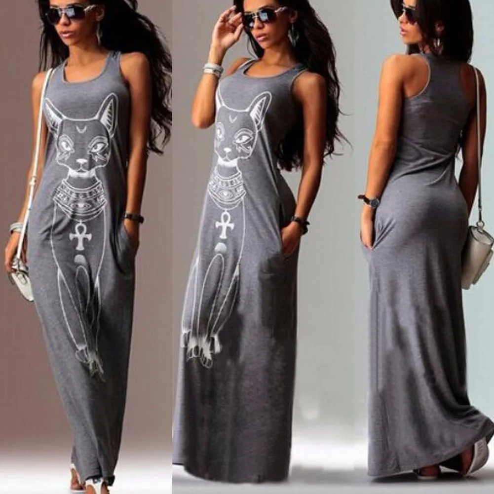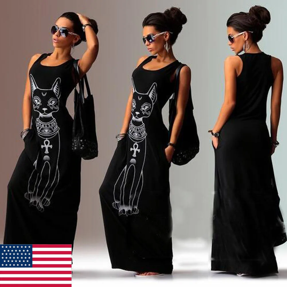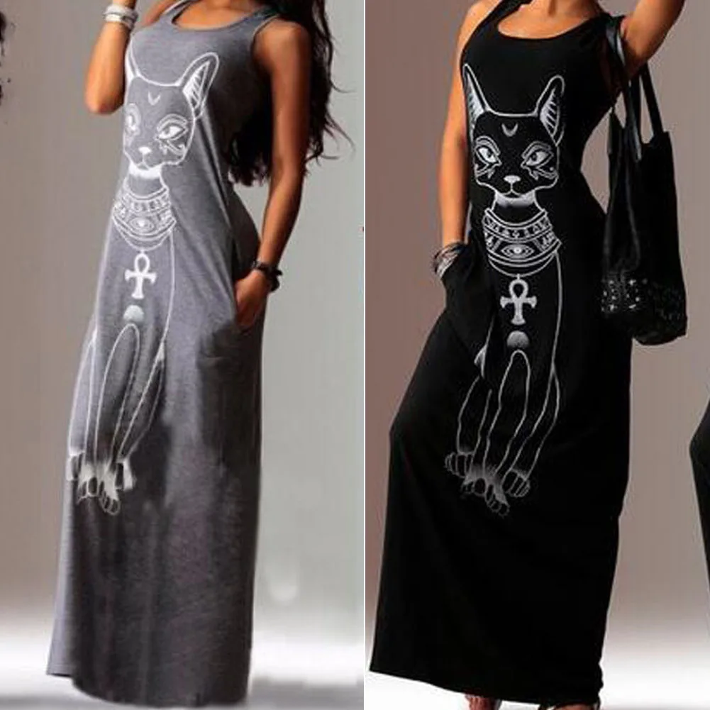 Sexy Womens Cat Print Boho Long Dress Casual Women Sleeveless Vest Print Evening Party Dress Beach Dresses Sundress