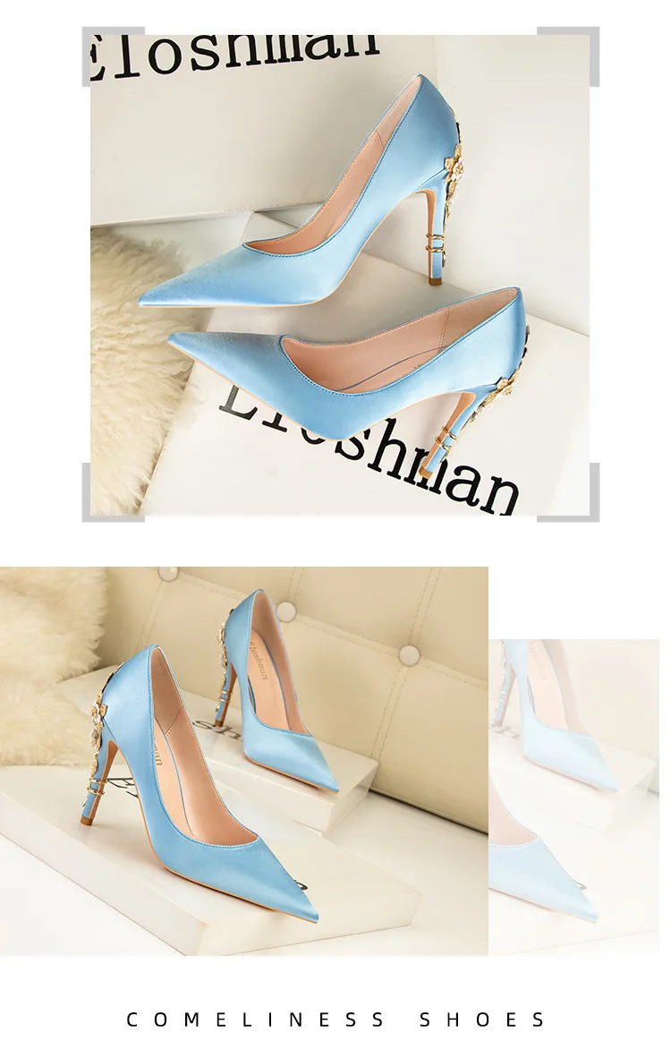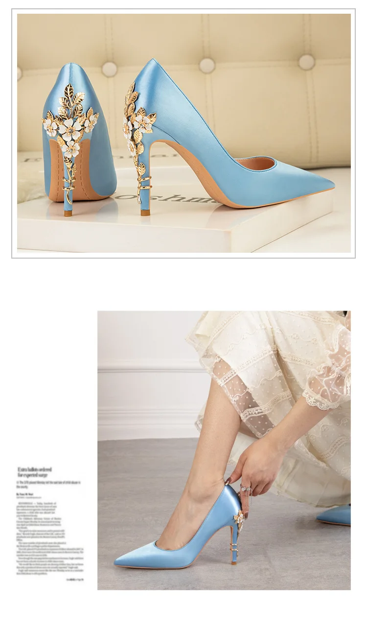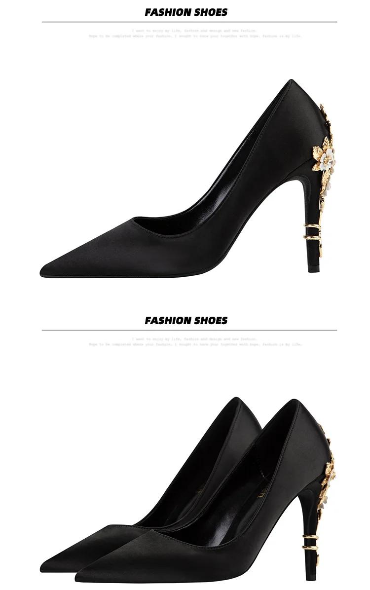 Sexy Women's Metal Floral Stiletto Heel High Heel Pointed Toe Satin Shoes Women's Luxury High Quality Exquisite High Heel Shoes