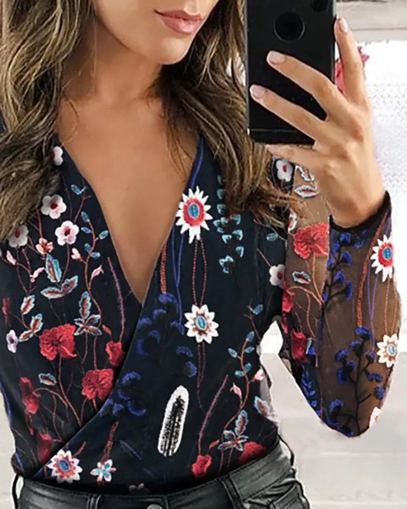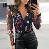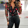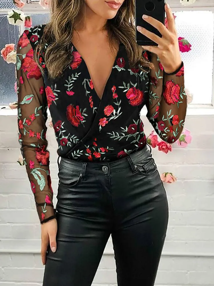Sheer Mesh Floral Embroidery Blouse Women Deep V Neck Long Sleeve Casual Blouse Tops Streetwear