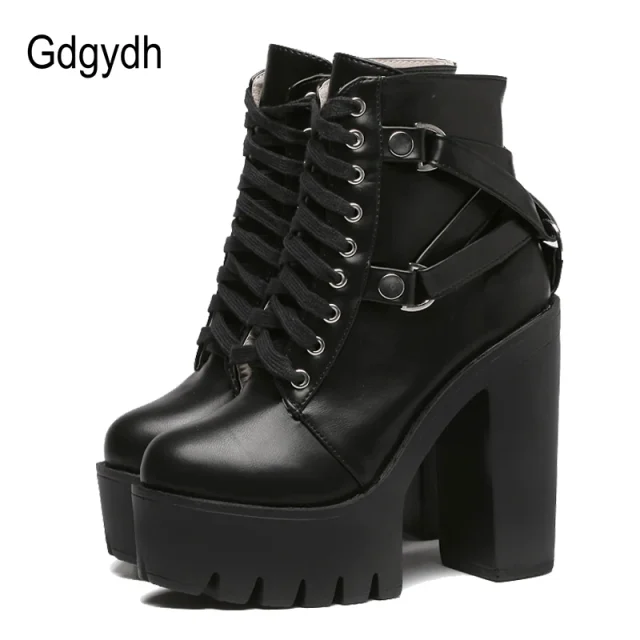 Gdgydh Fashion Black Boots Women Heel Spring Autumn Lace-up Soft Leather Platform Shoes Woman Party Ankle Boots High Heels Punk