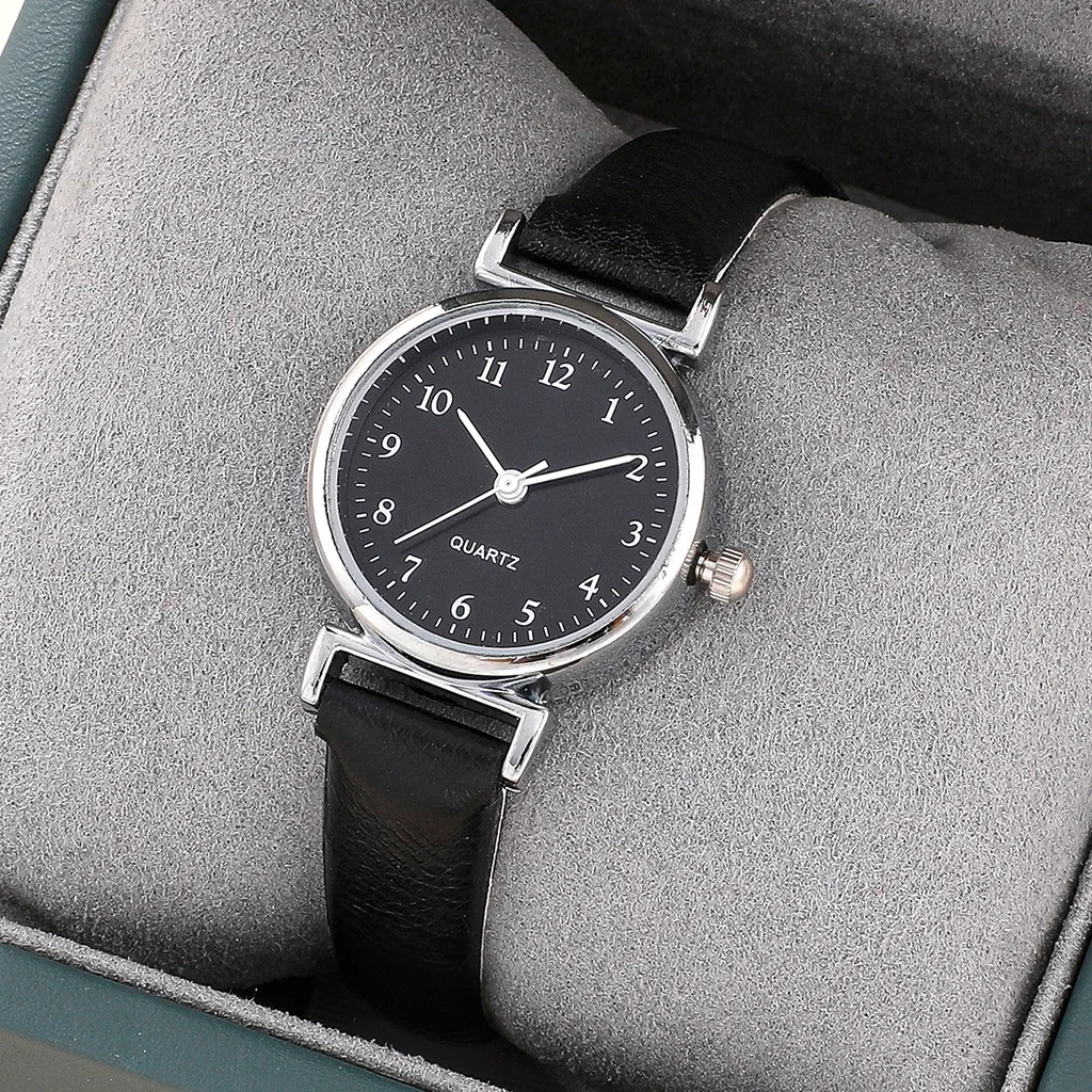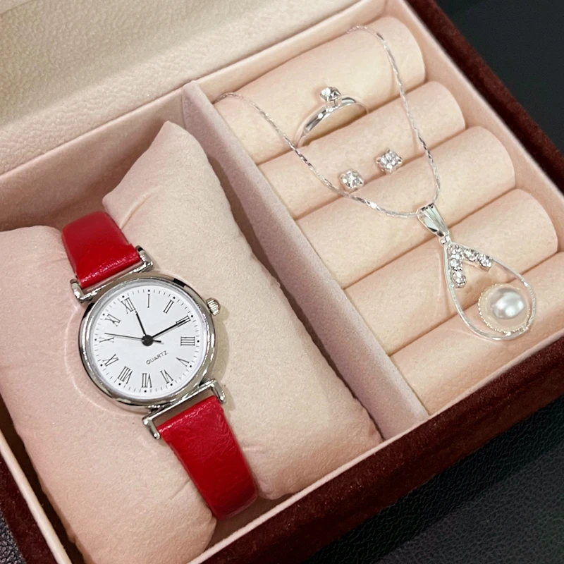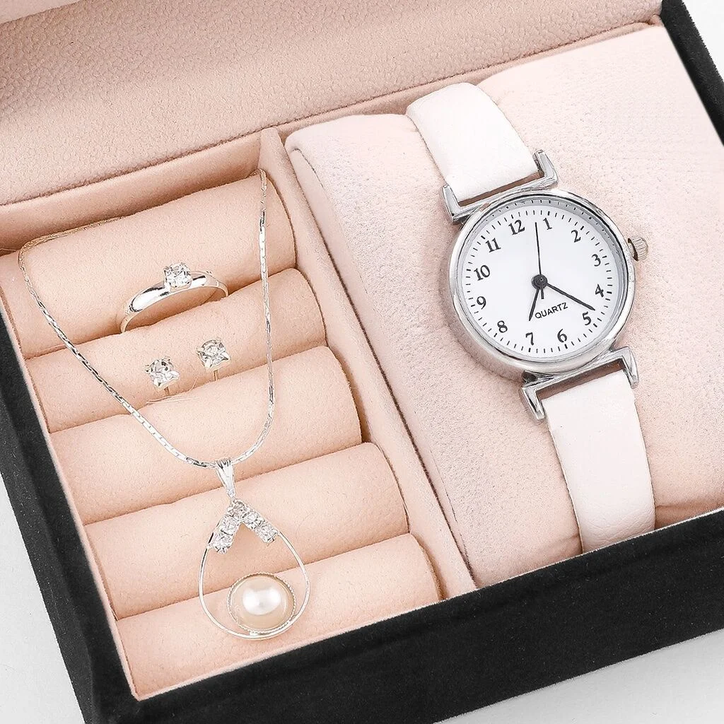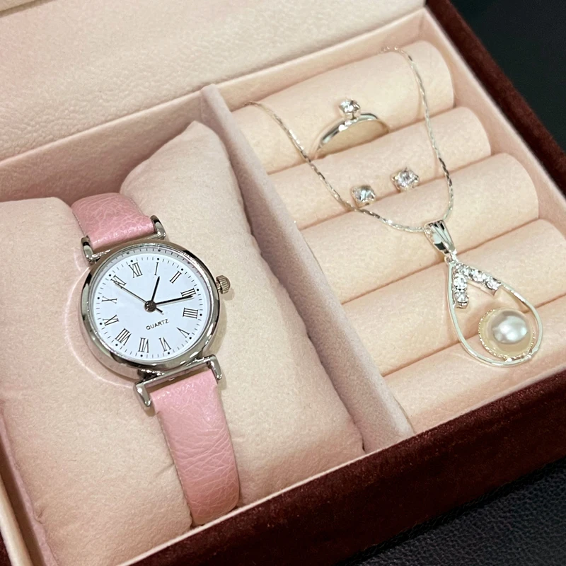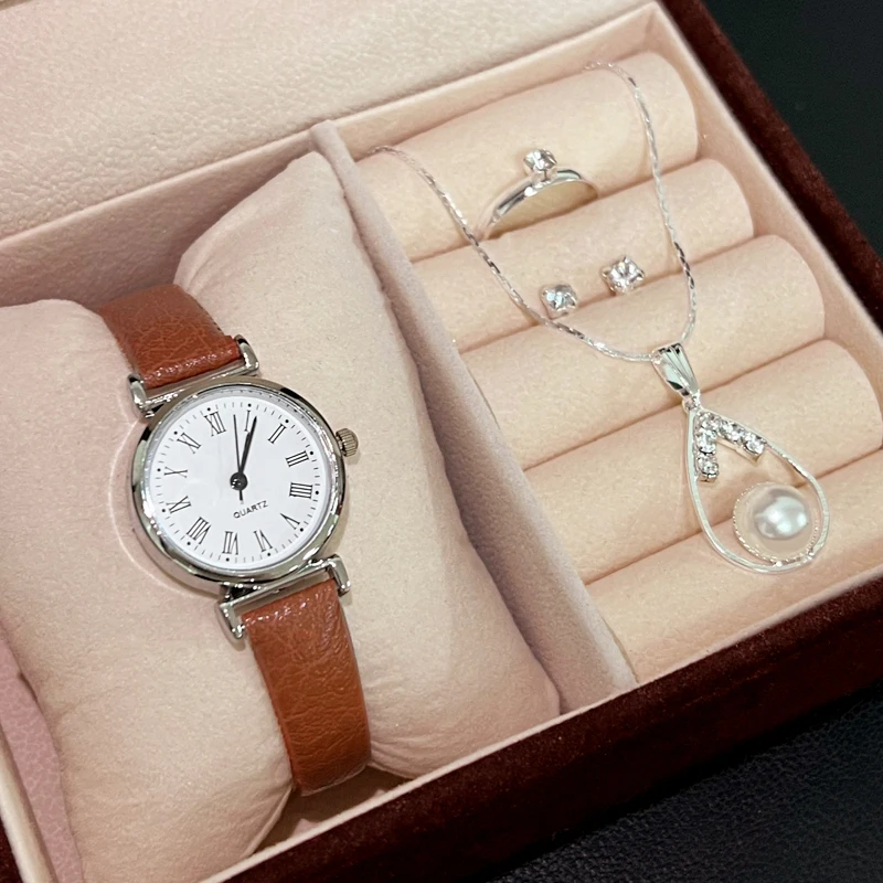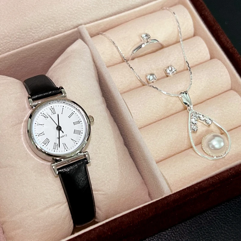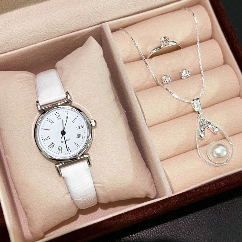Simple Round Dial Quartz Women's Watch Luxury Necklace Ring Earrings 4 Piece Set SW1275