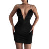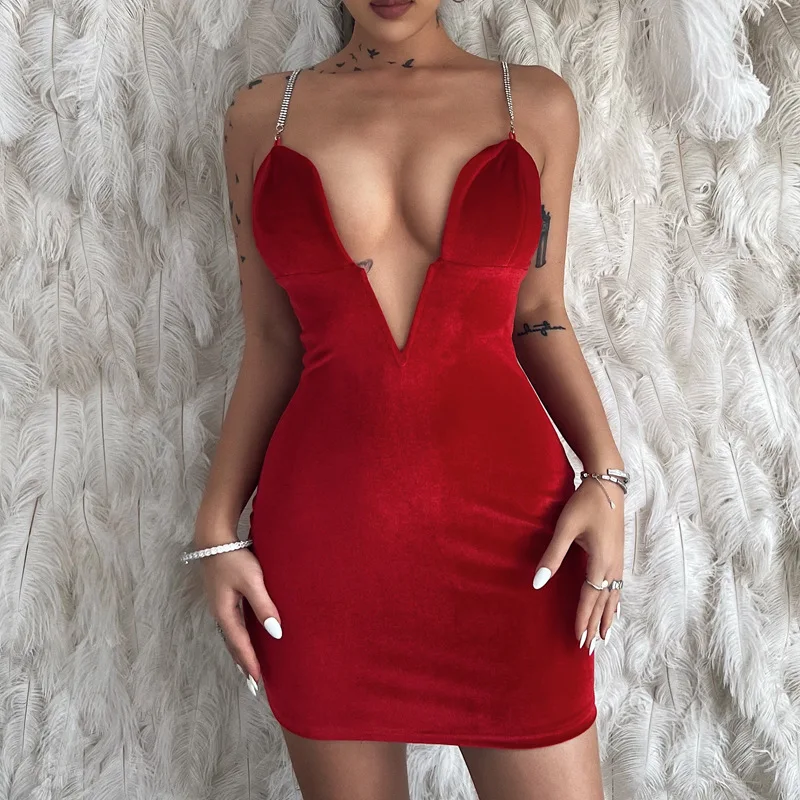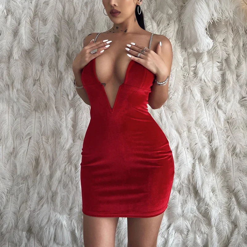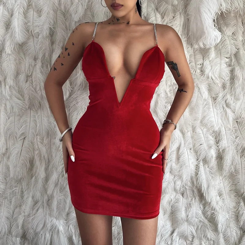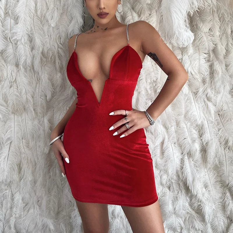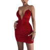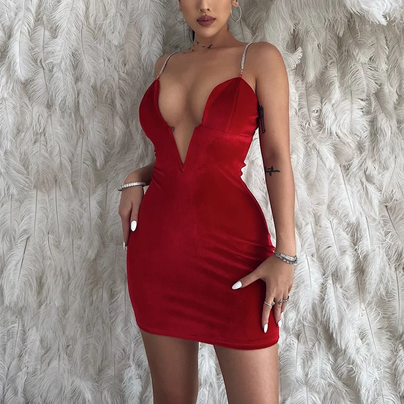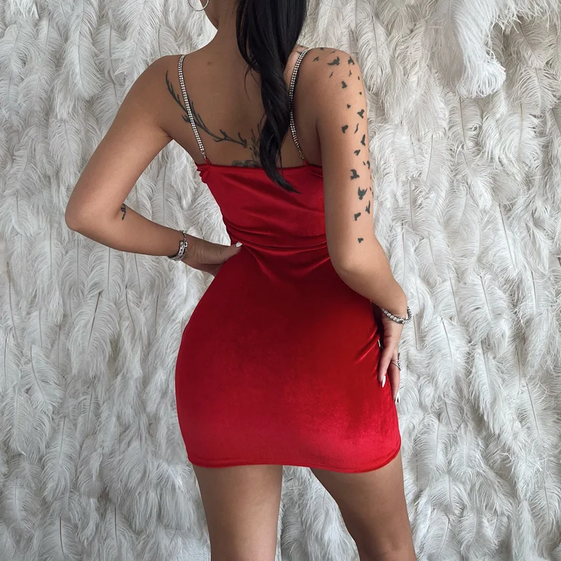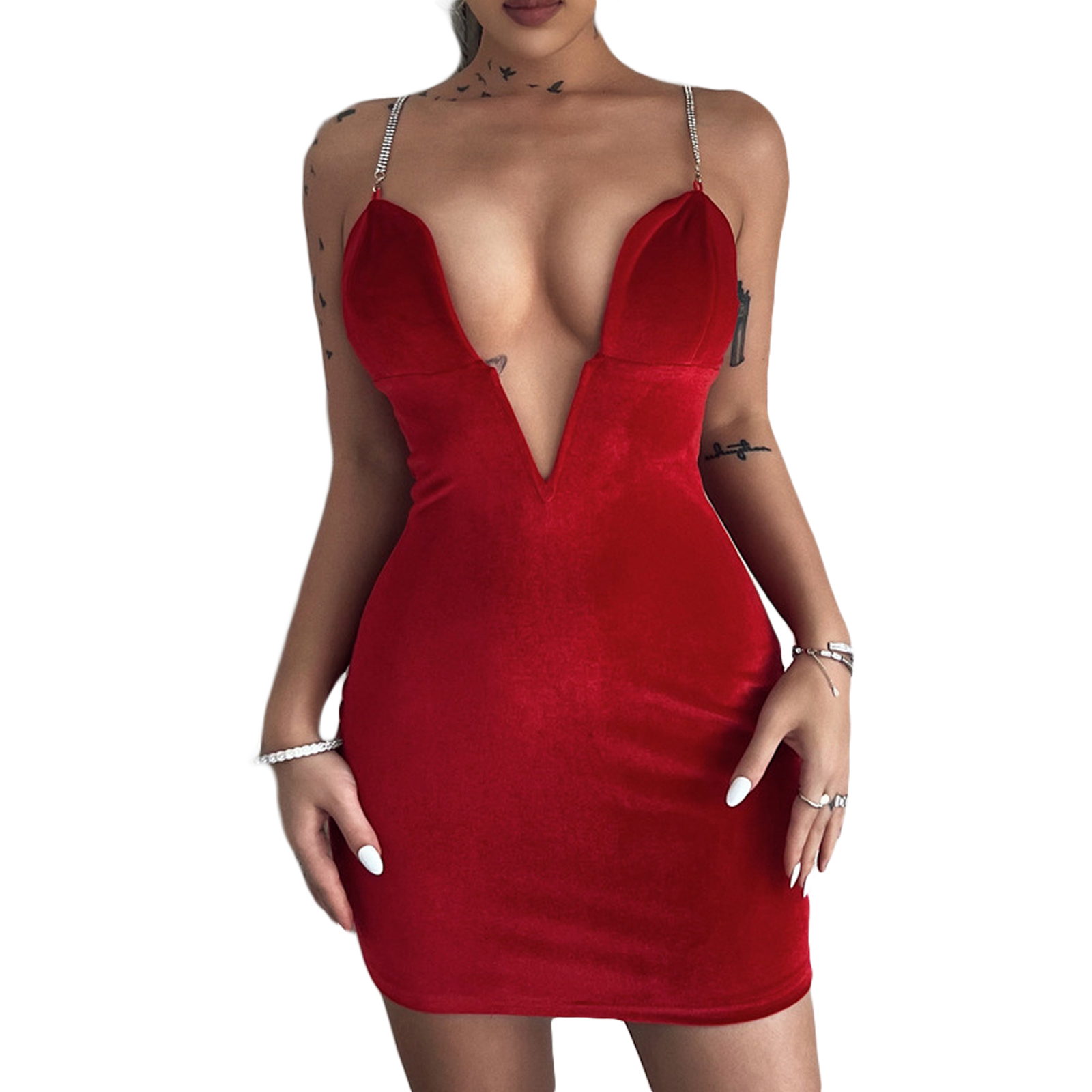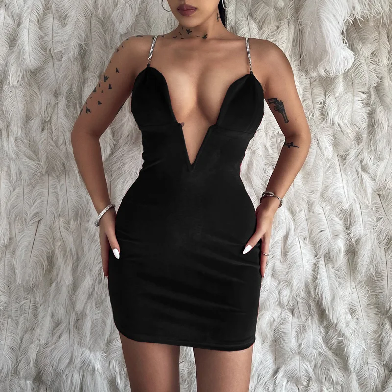 Solid Color Spaghetti Strap Dress Sexy Women Sleeveless Deep V-neck Rhinestone Splicing Backless Sleeveless Slim Dresses