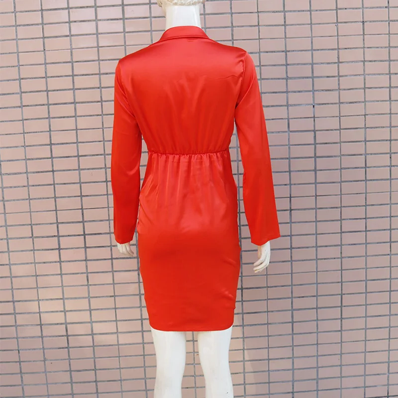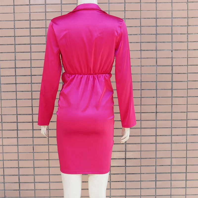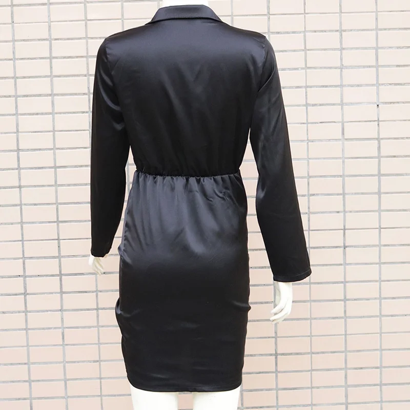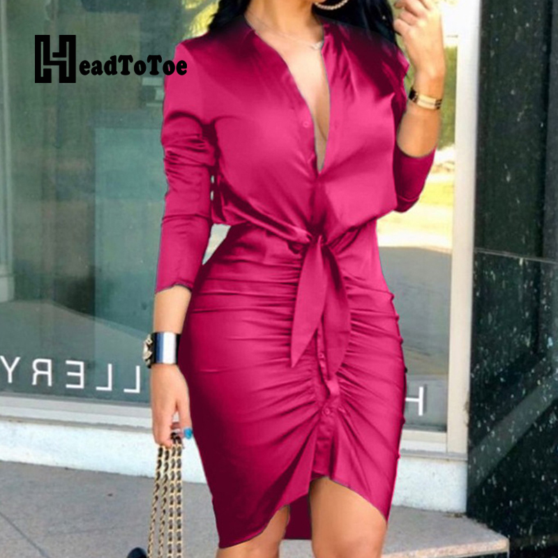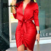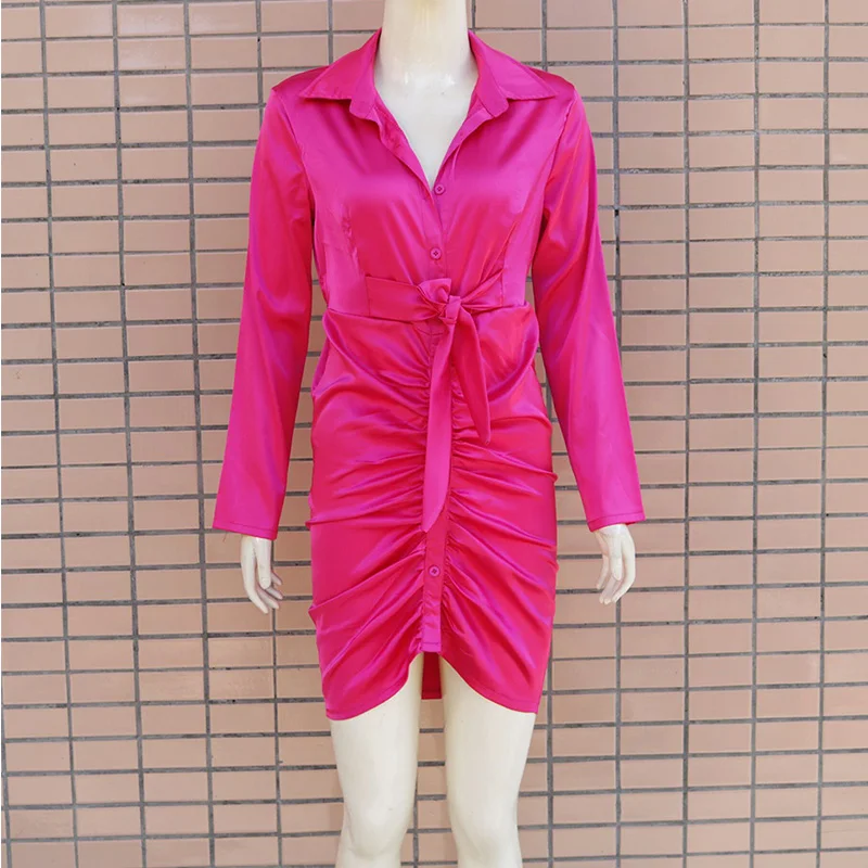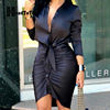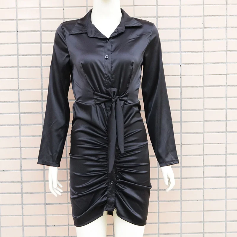 Solid Satin Pleated Lace Up Sexy OL Shirt Dress Women Long Sleeve Turn Down Collar Slim Bodycon Dress