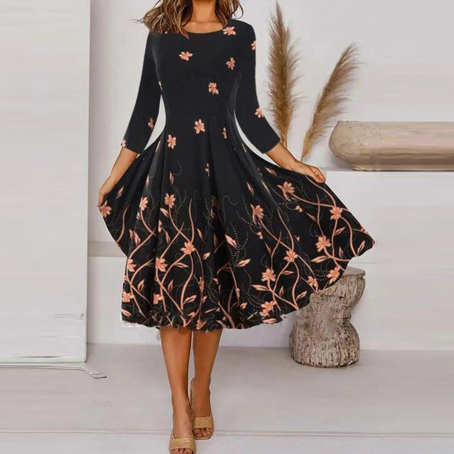 Spring Autumn Female Retro Long Dress Fashion Ladies Vestidos O-Neck Women Seven Points Sleeve Print Loose Dresses Streetwear