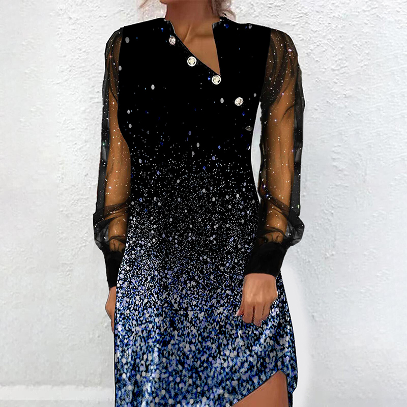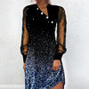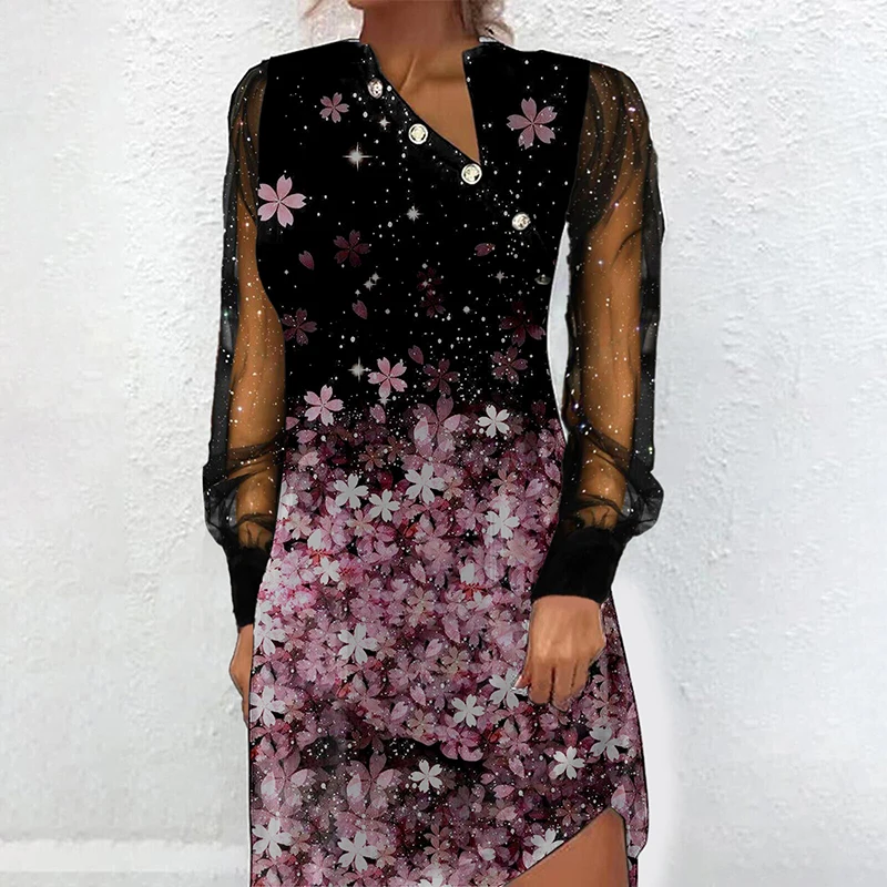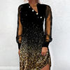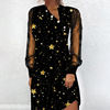 Spring Casual Chic Print A-Line Dress Retro Elegant Glitter Mesh Long Sleeve Dress Women Sexy Loose Patchwork V-Neck Mini Dress