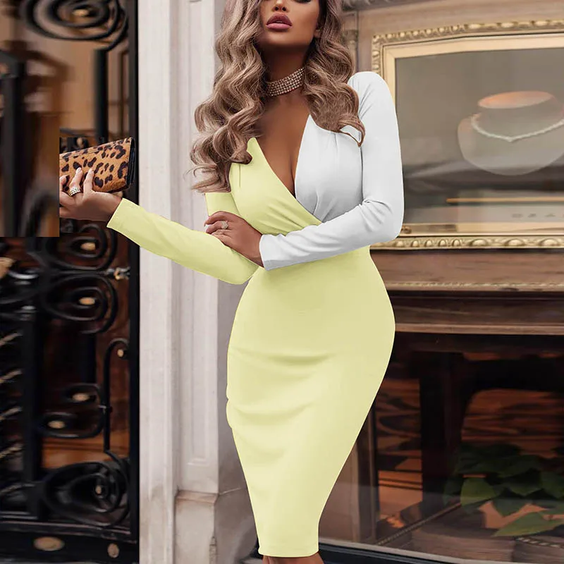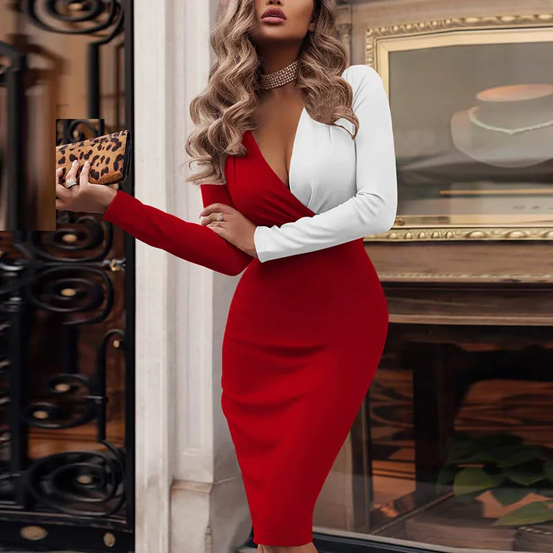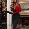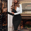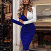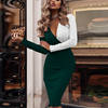 Spring Long-sleeved Women Dress Fashion Sexy Deep V Neck Elegant Ladies Party Dresses Vintage Patchwork Casual Slim Maxi Dress