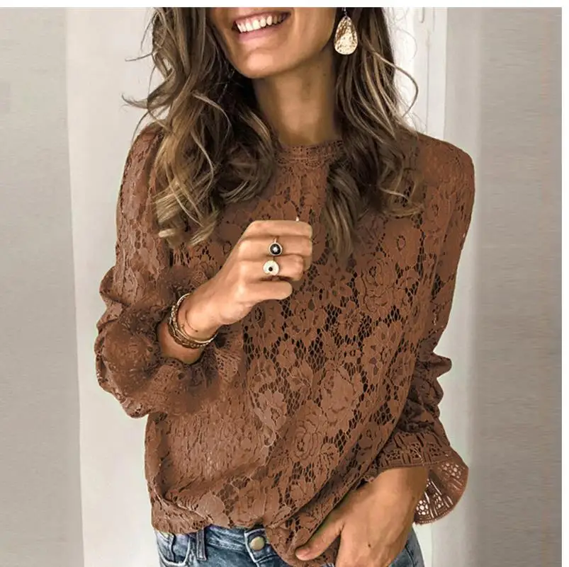 Spring Summer O-Neck Floral Lace Shirt Female Elegant Flare Long Sleeve Blouse Shirts Sexy Women Hollow Out Mesh Blusa Tops XXXL
