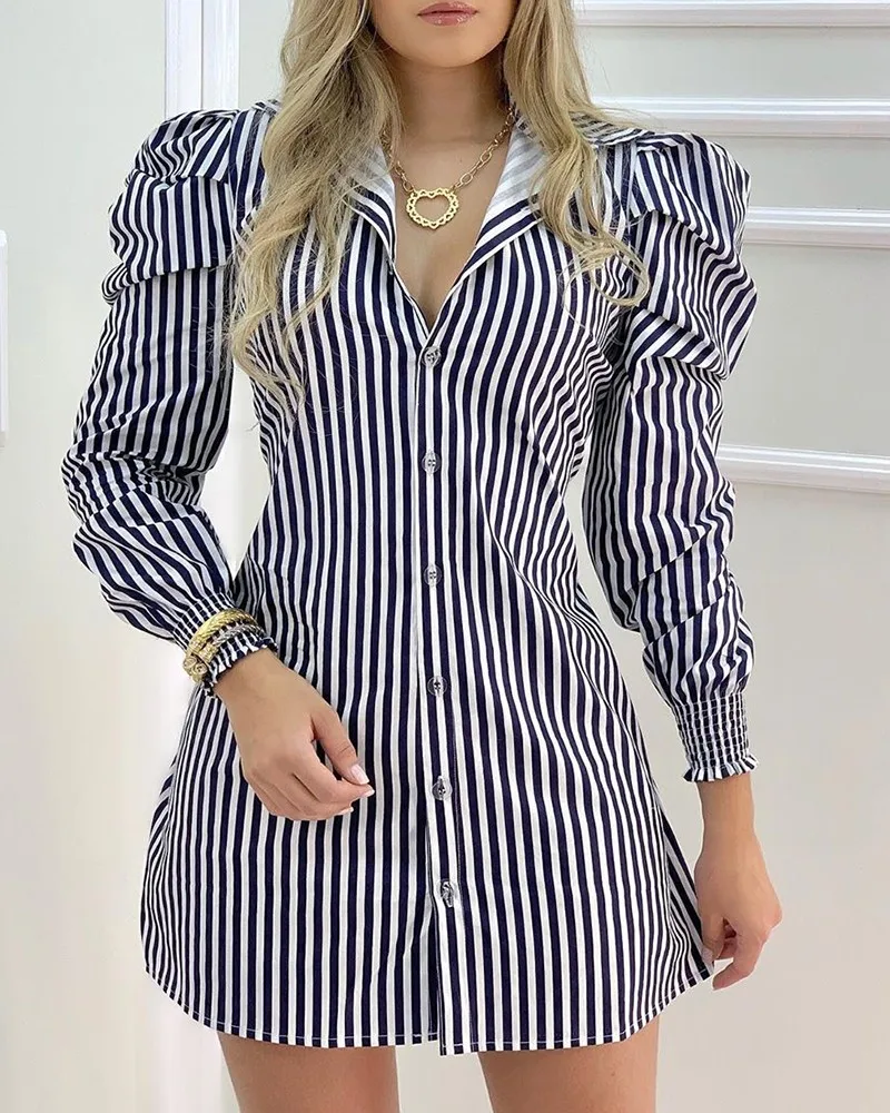 Striped Button Design Puffed Sleeve Shirt Dress Women Casual Work Dress