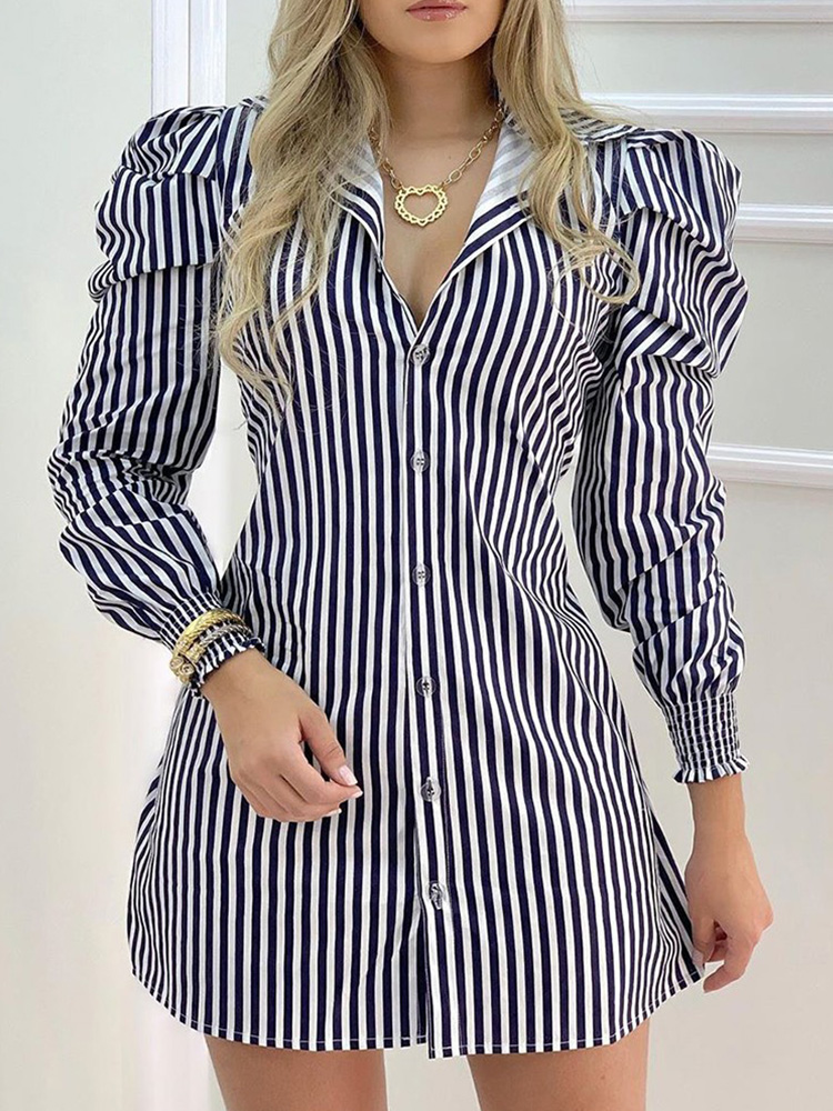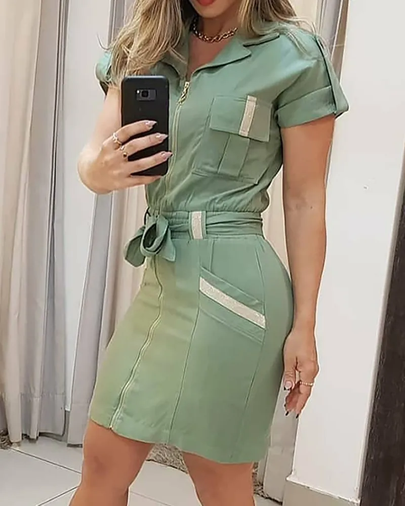 Striped Colorblock Zip Front Shirt Dress Workwear Women Short Sleeve Casual Daily Summer Dress