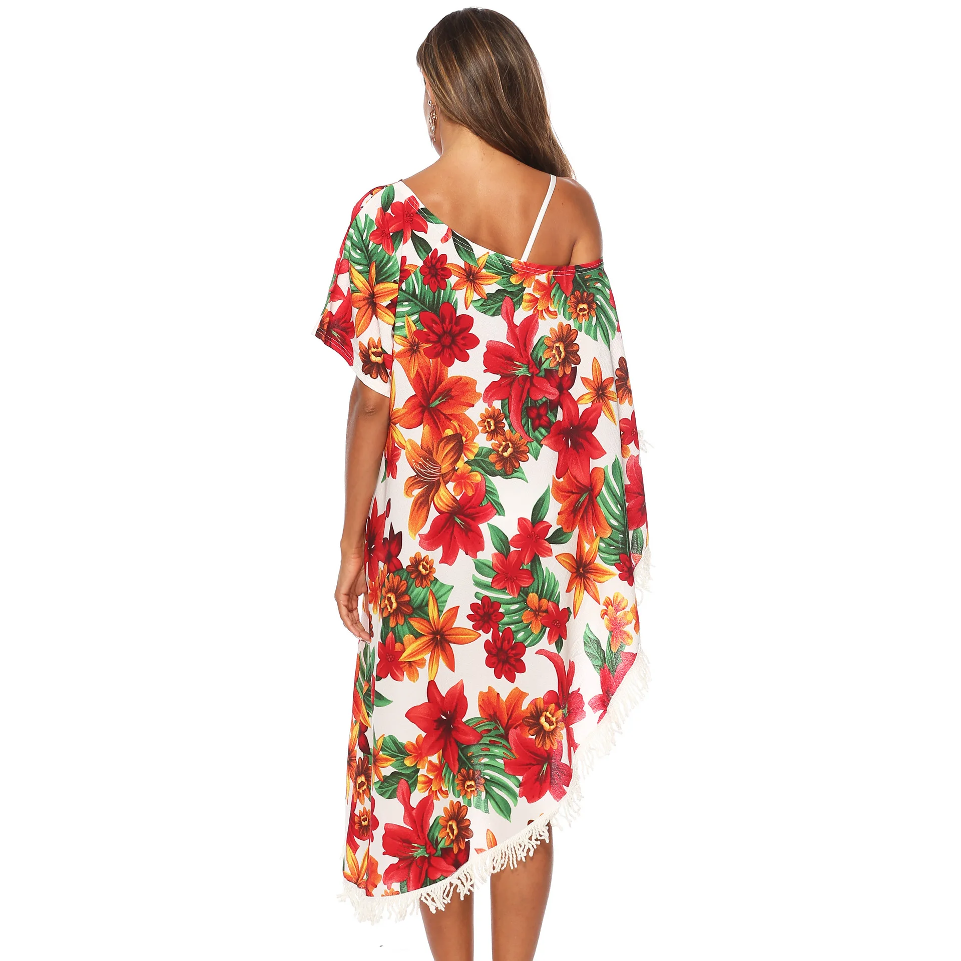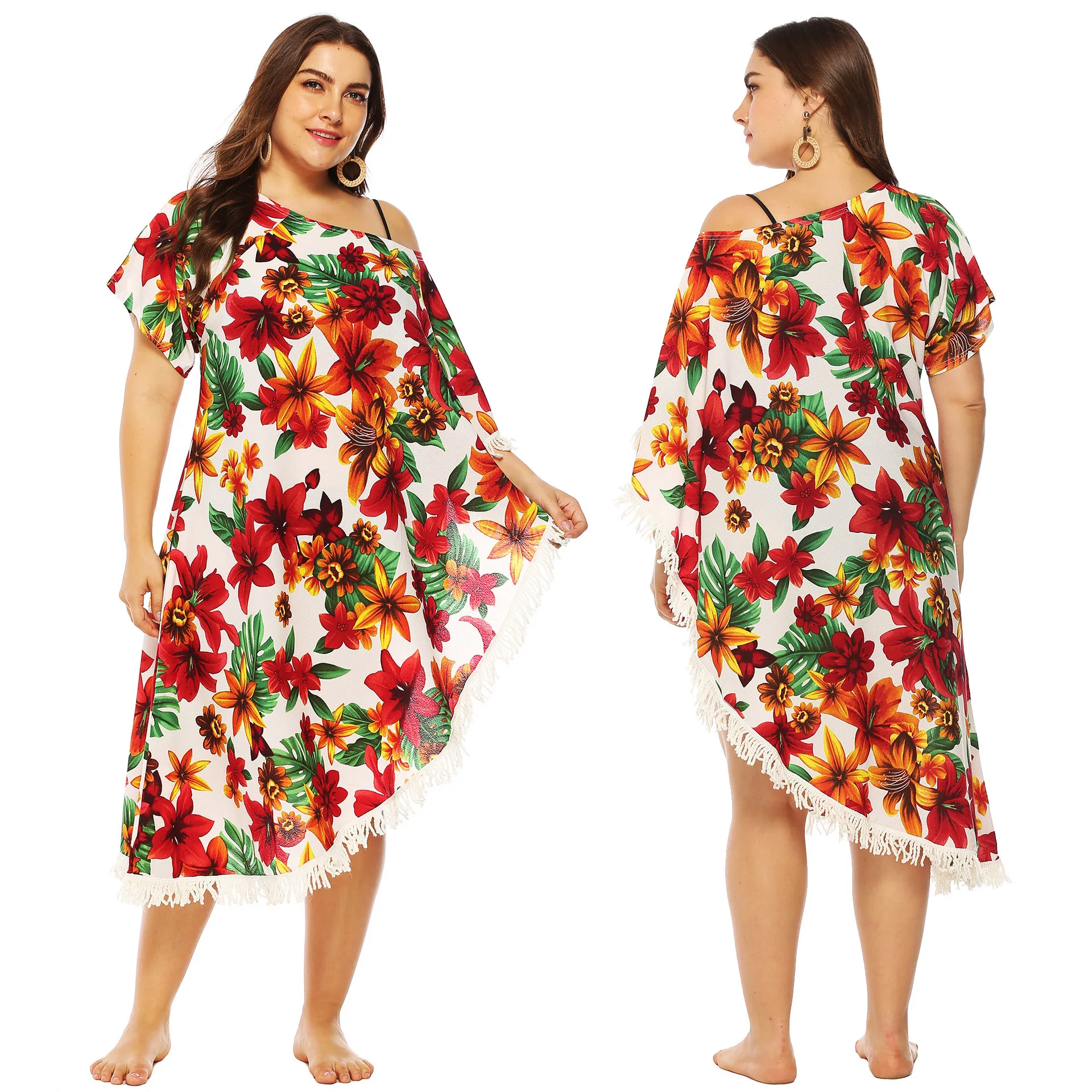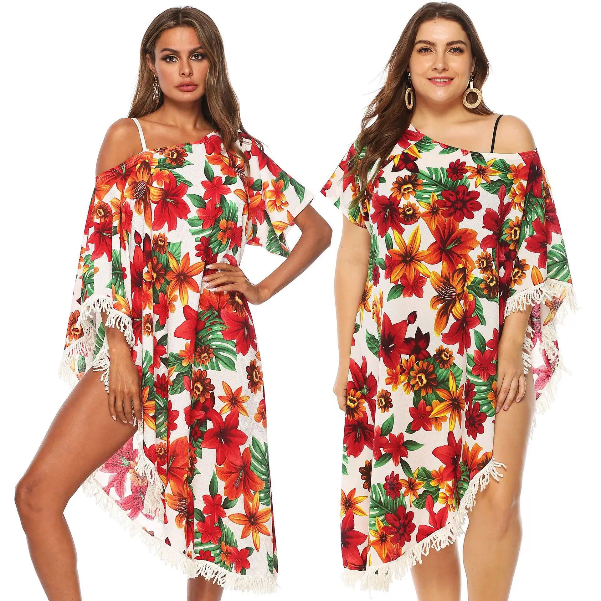 Summer 2021 -size women's botanical print beach bikini smock dress with irregular shoulder fringes