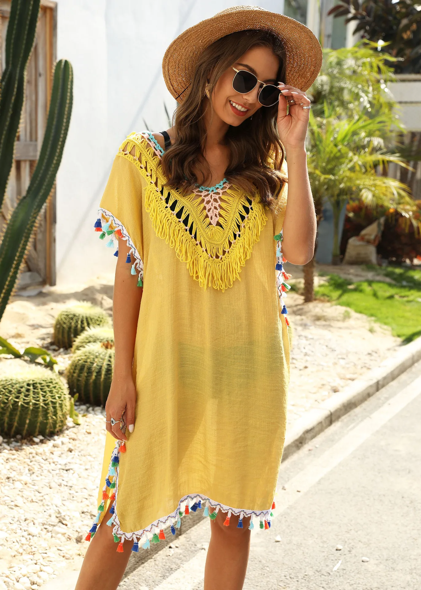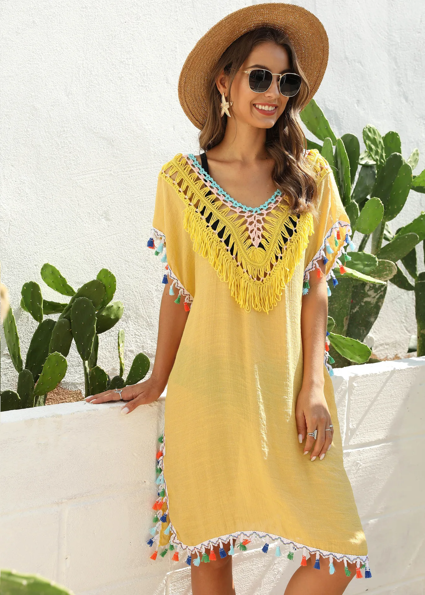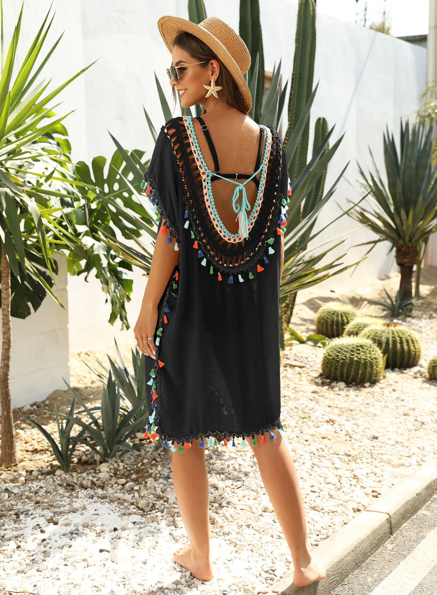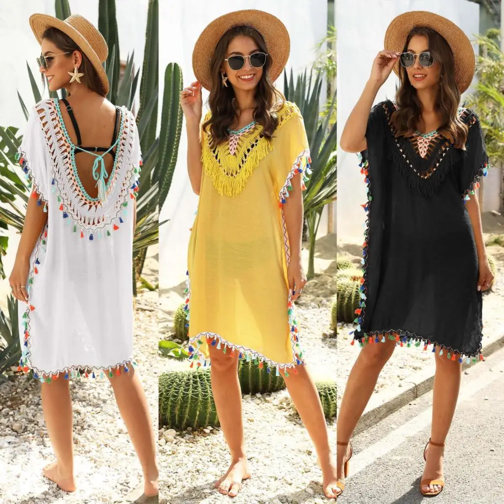 Summer 2021 women's dress irregular hand hook stitching color tassel sexy backless V-neck beach sunblock blouse